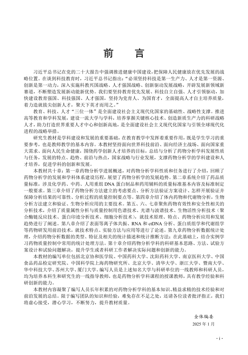 本教材由北京协和医学院组织全国十多所高等院校和科研机构的一线教师与科研人员编写而成,广泛吸纳现有药物分析学科教材的优点,充分利用现代药物分析领域的最新研究成果,并将其加入案例。本教材介绍了药物分析学进展概述、药物质量标准、药物分析方法设计和验证、体内药物和代谢物分析、药物色谱分析法进展、药物理化特性分析技术进展、药物生物学分析技术进展、药物分析前沿技术、药物分析数据统计处理、药物分析学科科研基本方法等内容,设有思维导图、典型案例、思考题、知识拓展等模块,为学生系统学习药物分析学知识提供重要参考,引导学生掌握重点,理解难点,融会贯通。