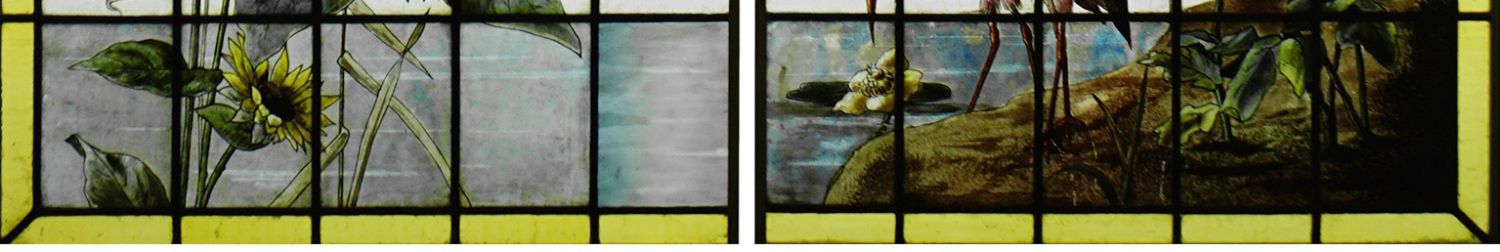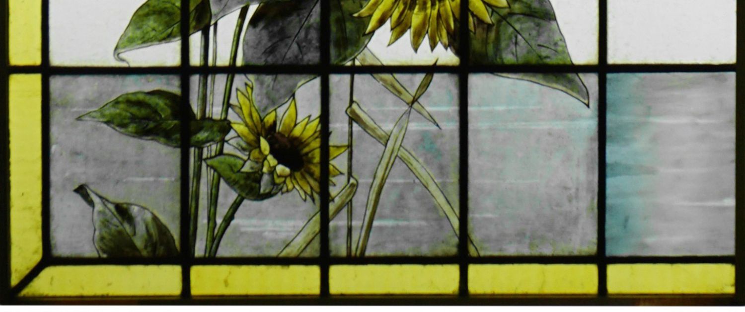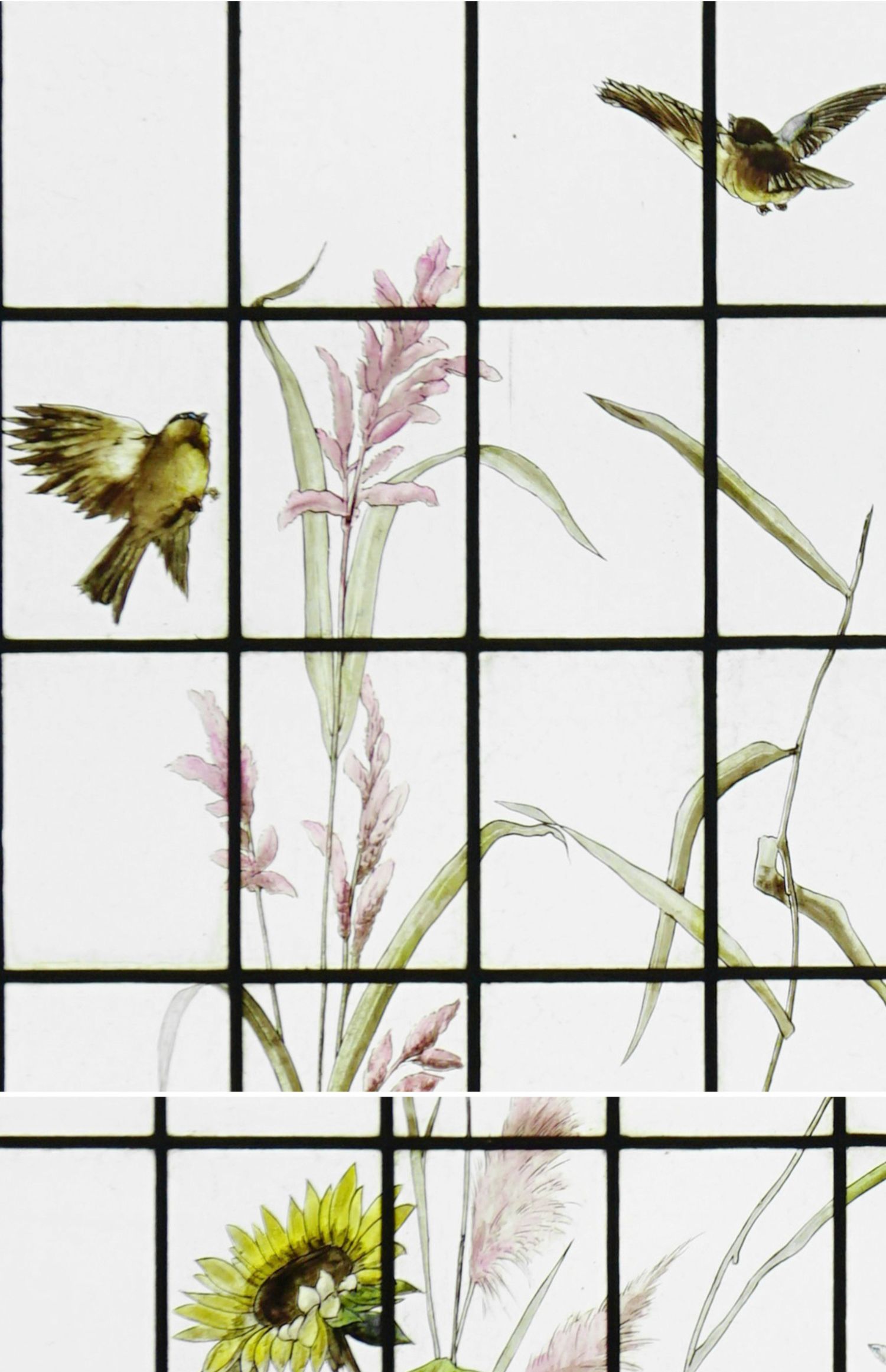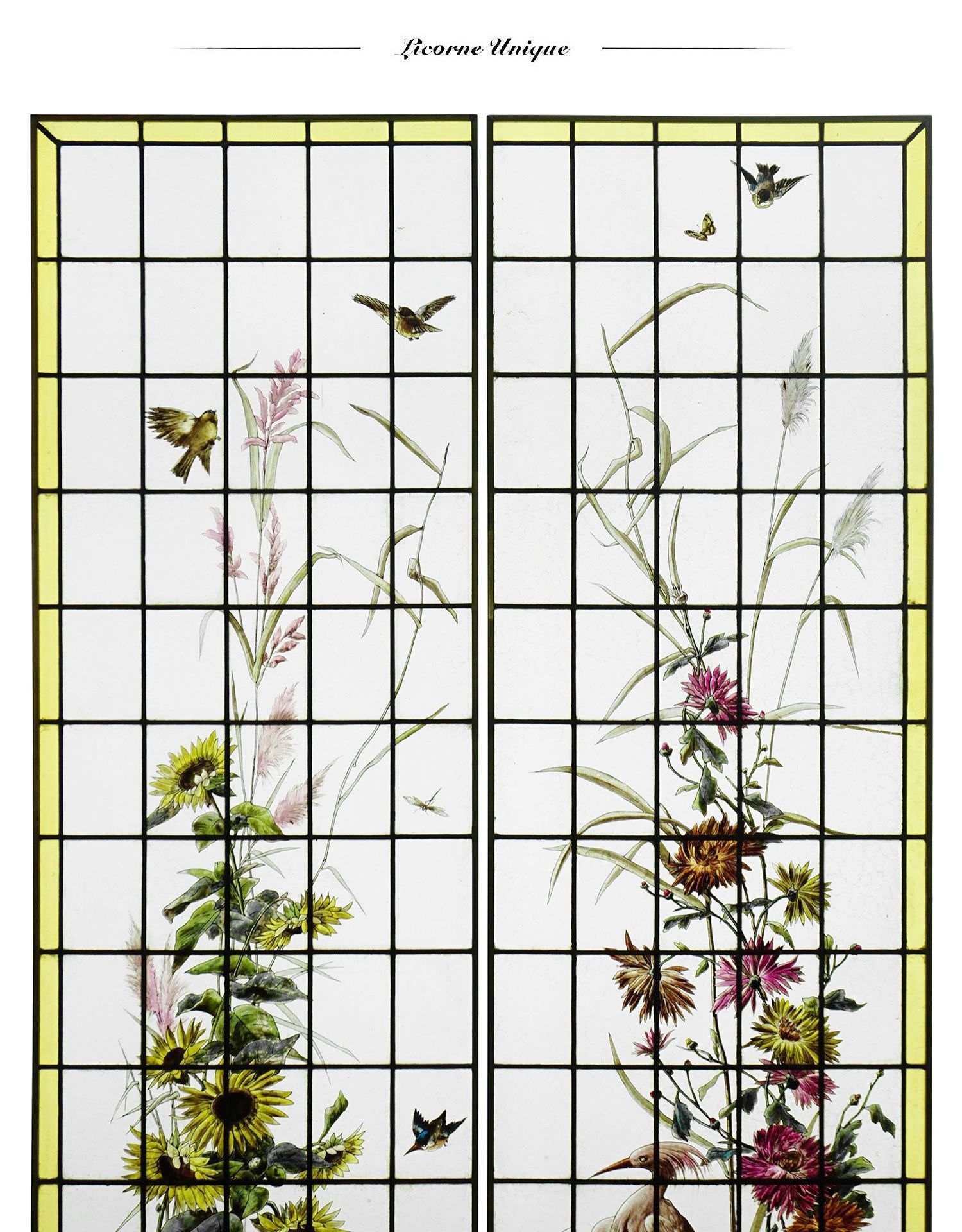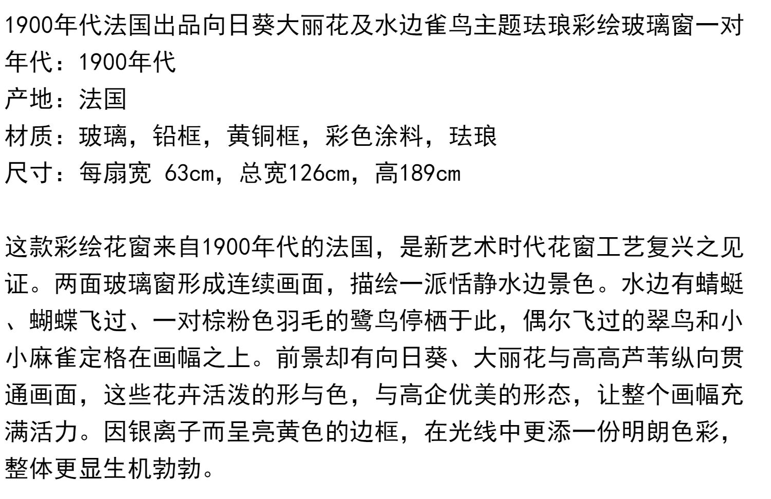 独角鹿西洋古董法国向日葵大丽花水边雀鸟珐琅彩绘玻璃花窗一对