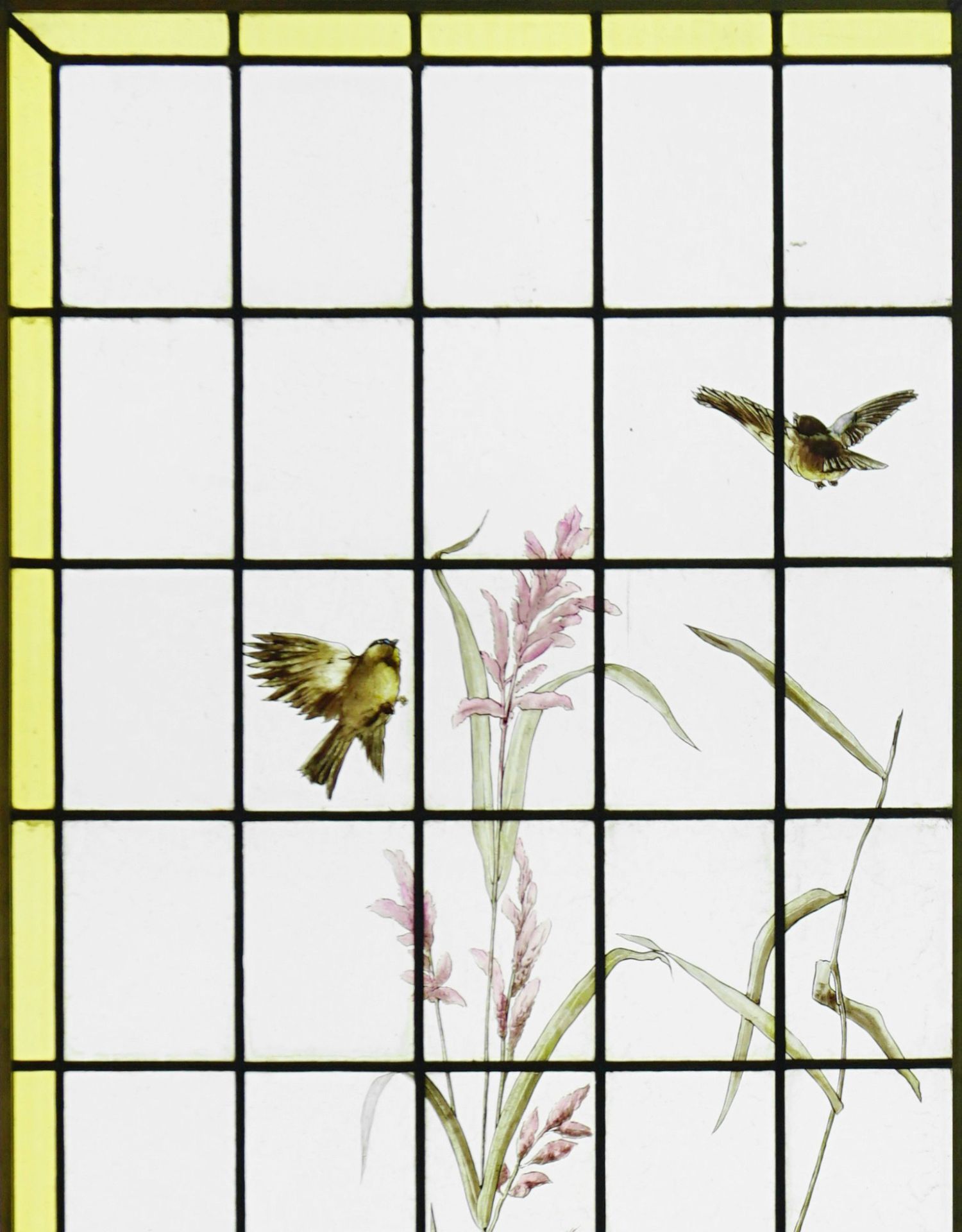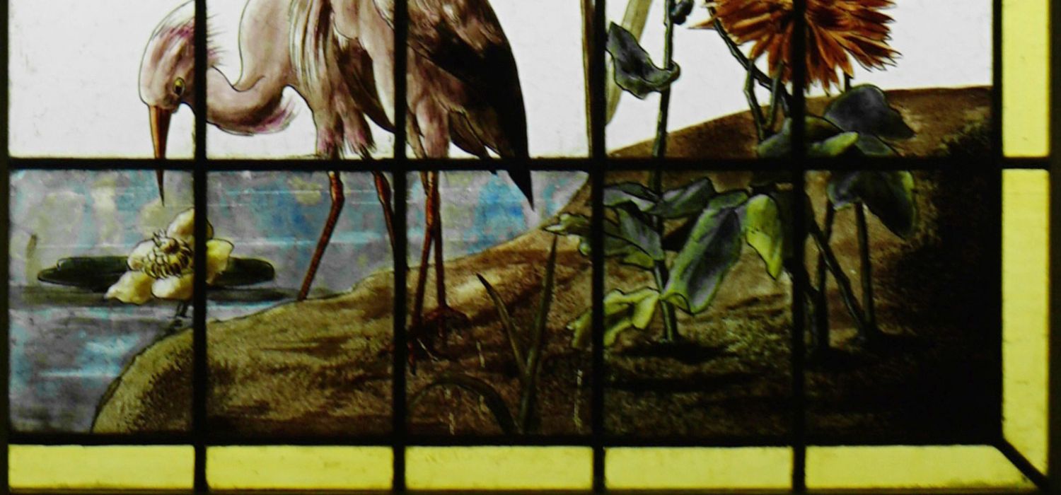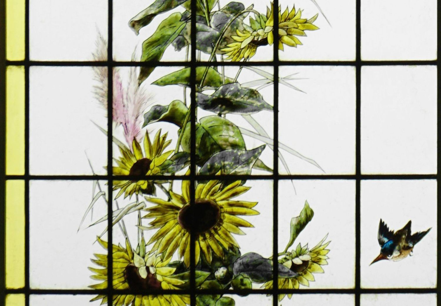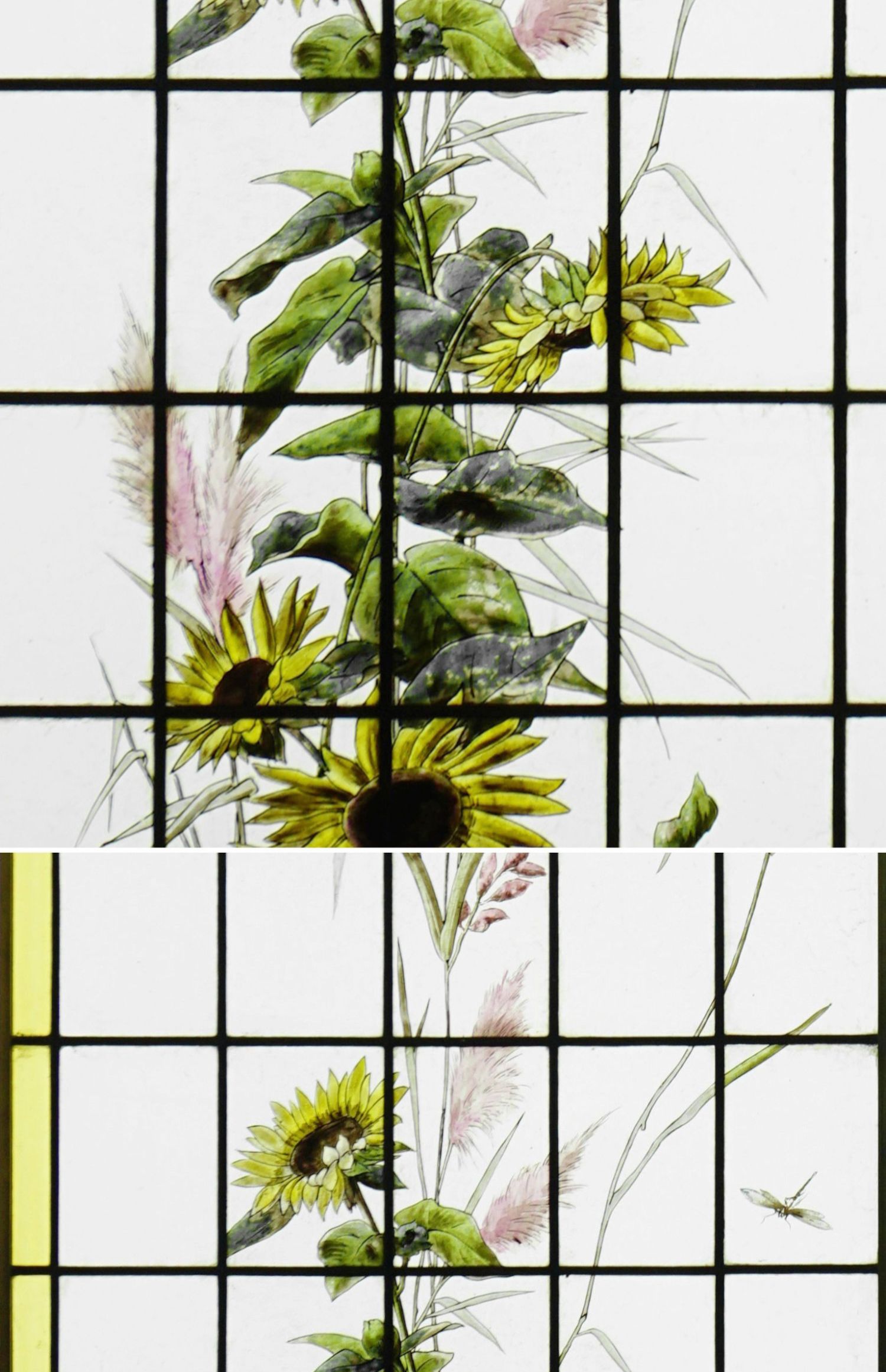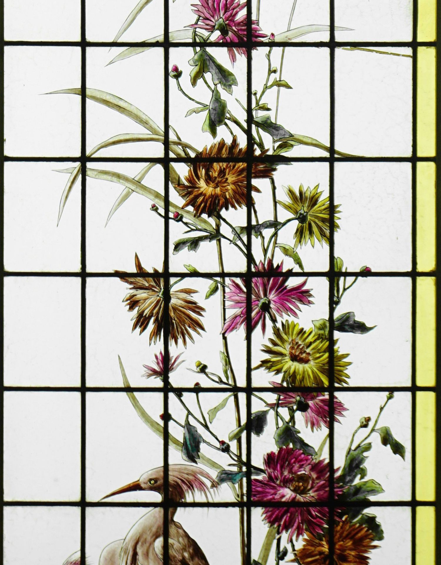 独角鹿西洋古董法国向日葵大丽花水边雀鸟珐琅彩绘玻璃花窗一对
