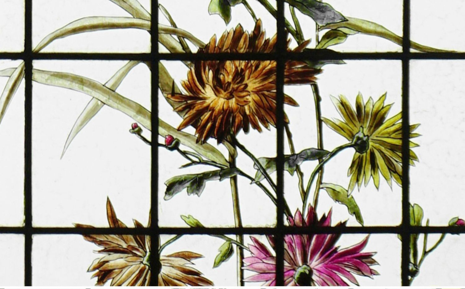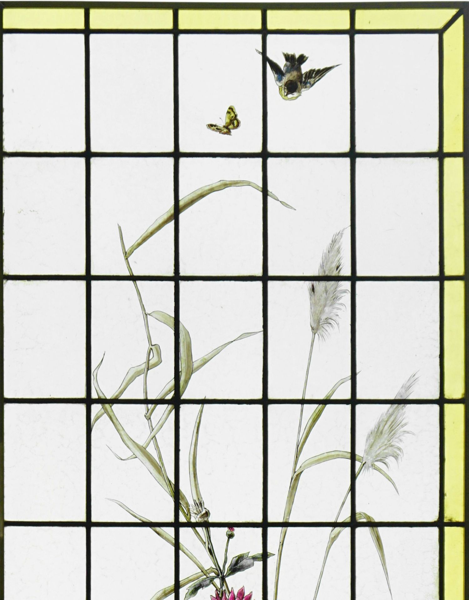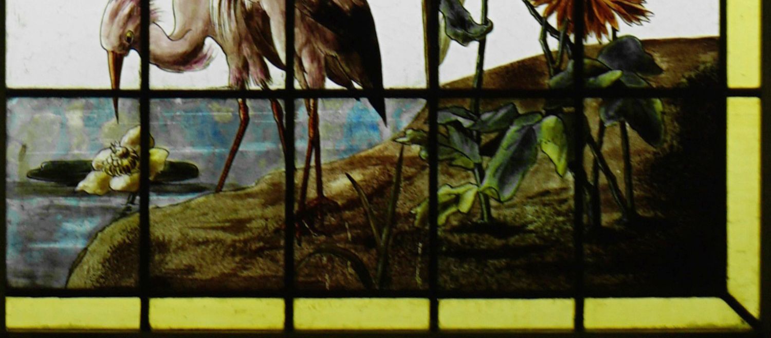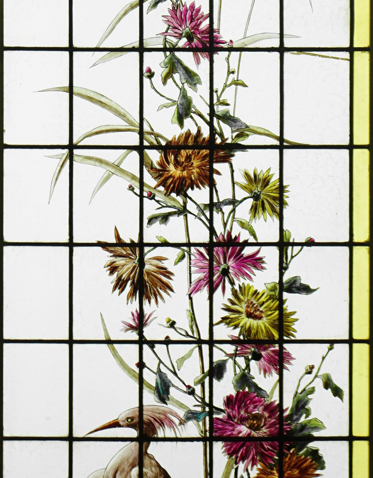 独角鹿西洋古董法国向日葵大丽花水边雀鸟珐琅彩绘玻璃花窗一对