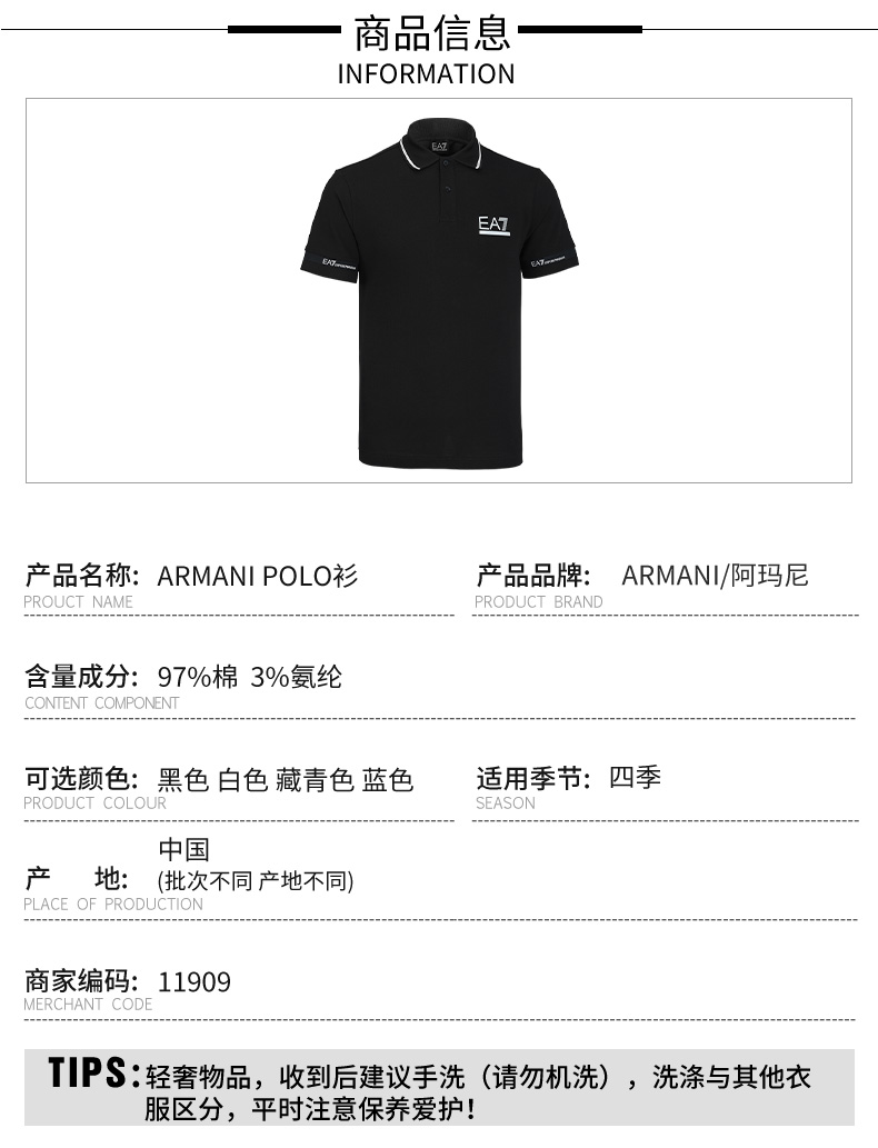 Armani EA7 男士运动休闲Polo弹棉短袖T恤 11909