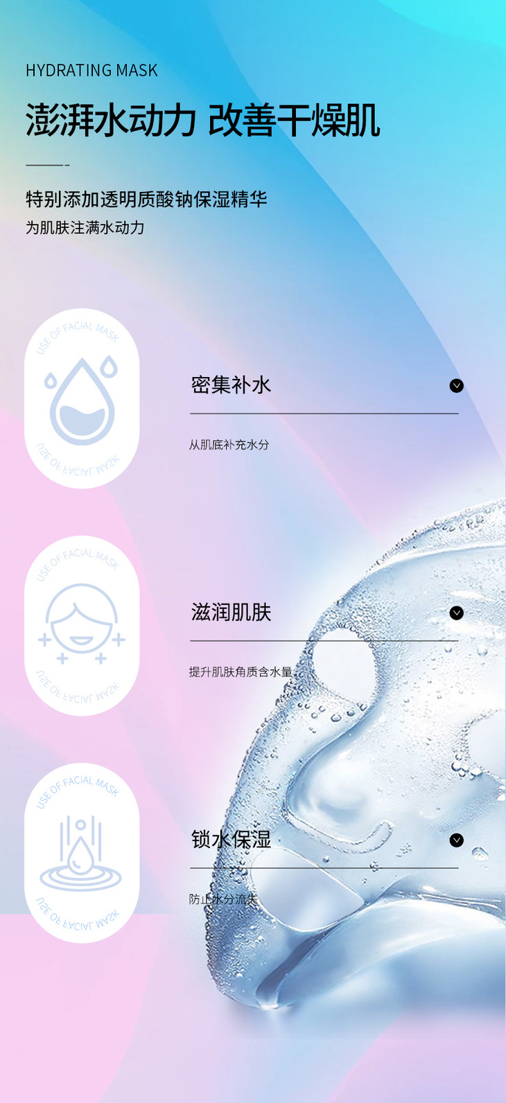 深入肌肤底层,为肌肤补充水分,改善干燥、粗糙,提亮肤色,让肌肤更佳水润饱满,透润嫩滑;