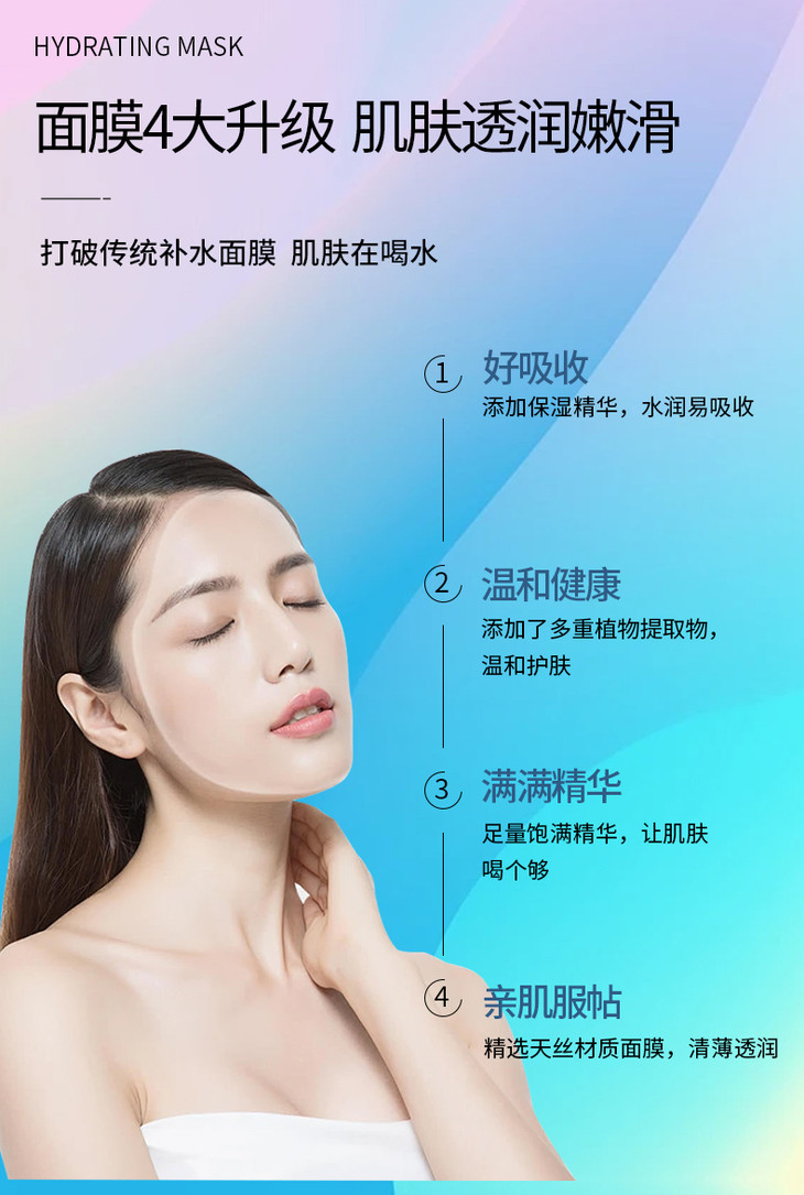 精选天丝材质面膜,立体裁剪,轻薄透润,承载足量饱满精华,贴合肌肤,亲肤细腻;