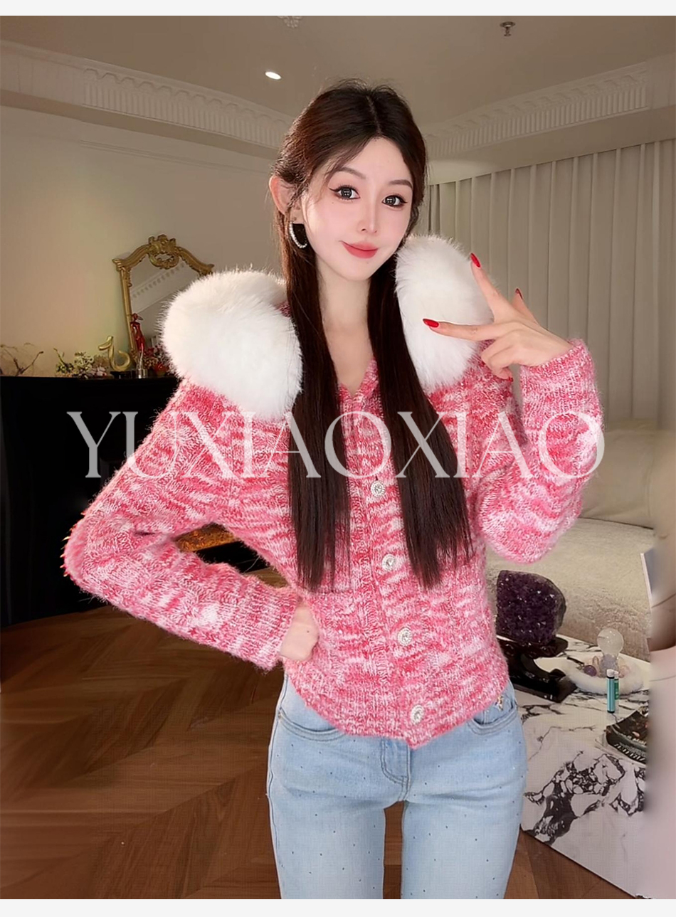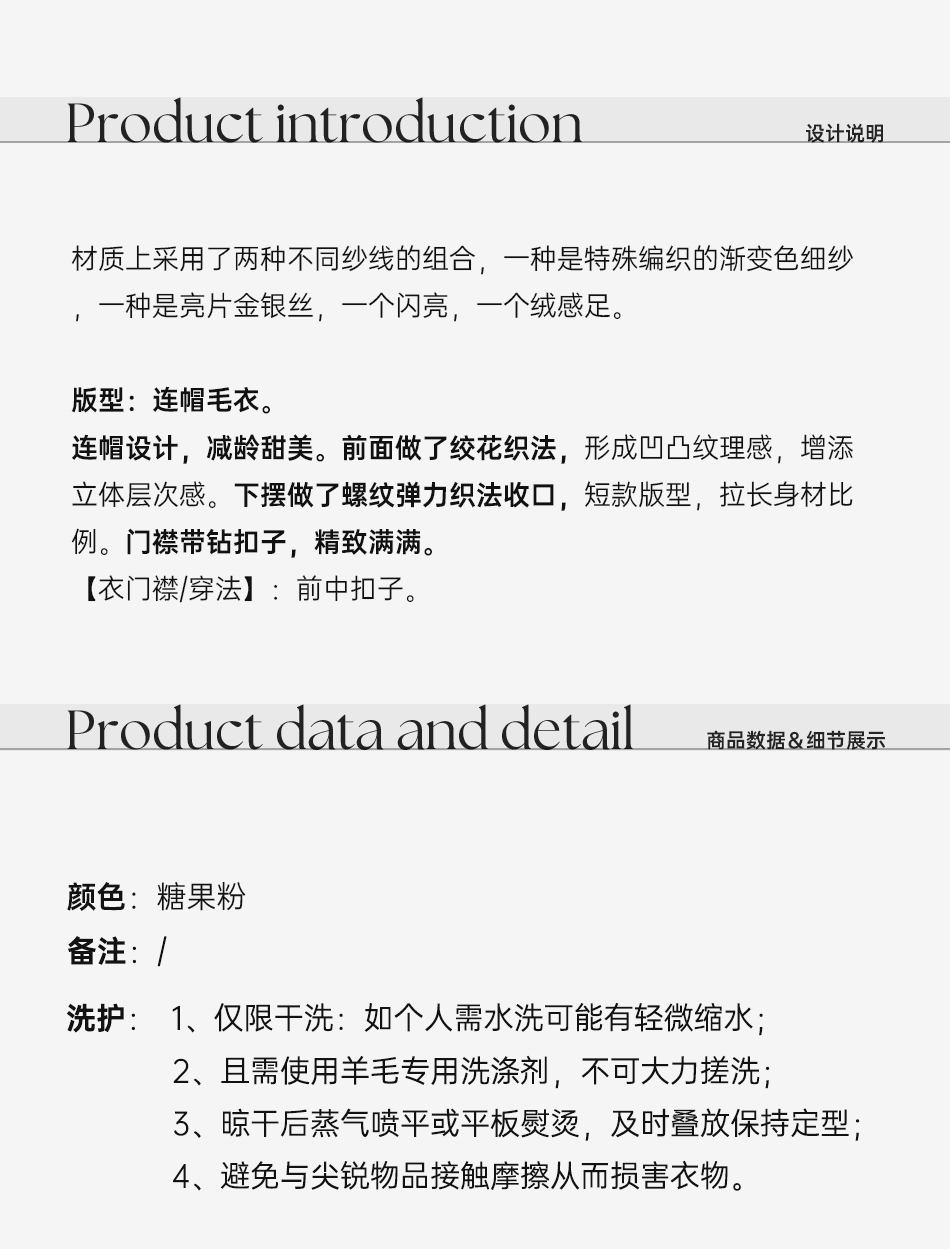 余潇潇【草莓圣代】时尚绵羊毛混纺拼亮钻亮片姣花织法连帽长袖毛衣