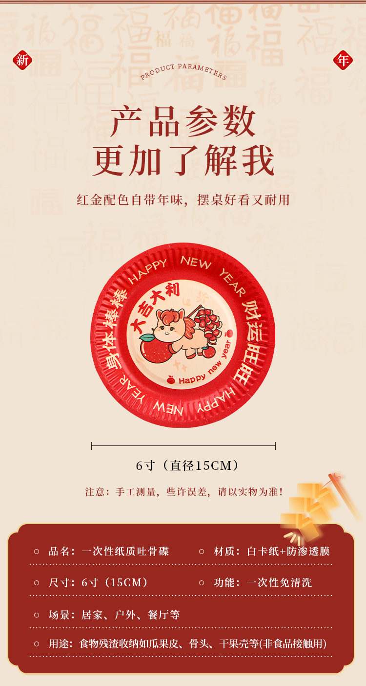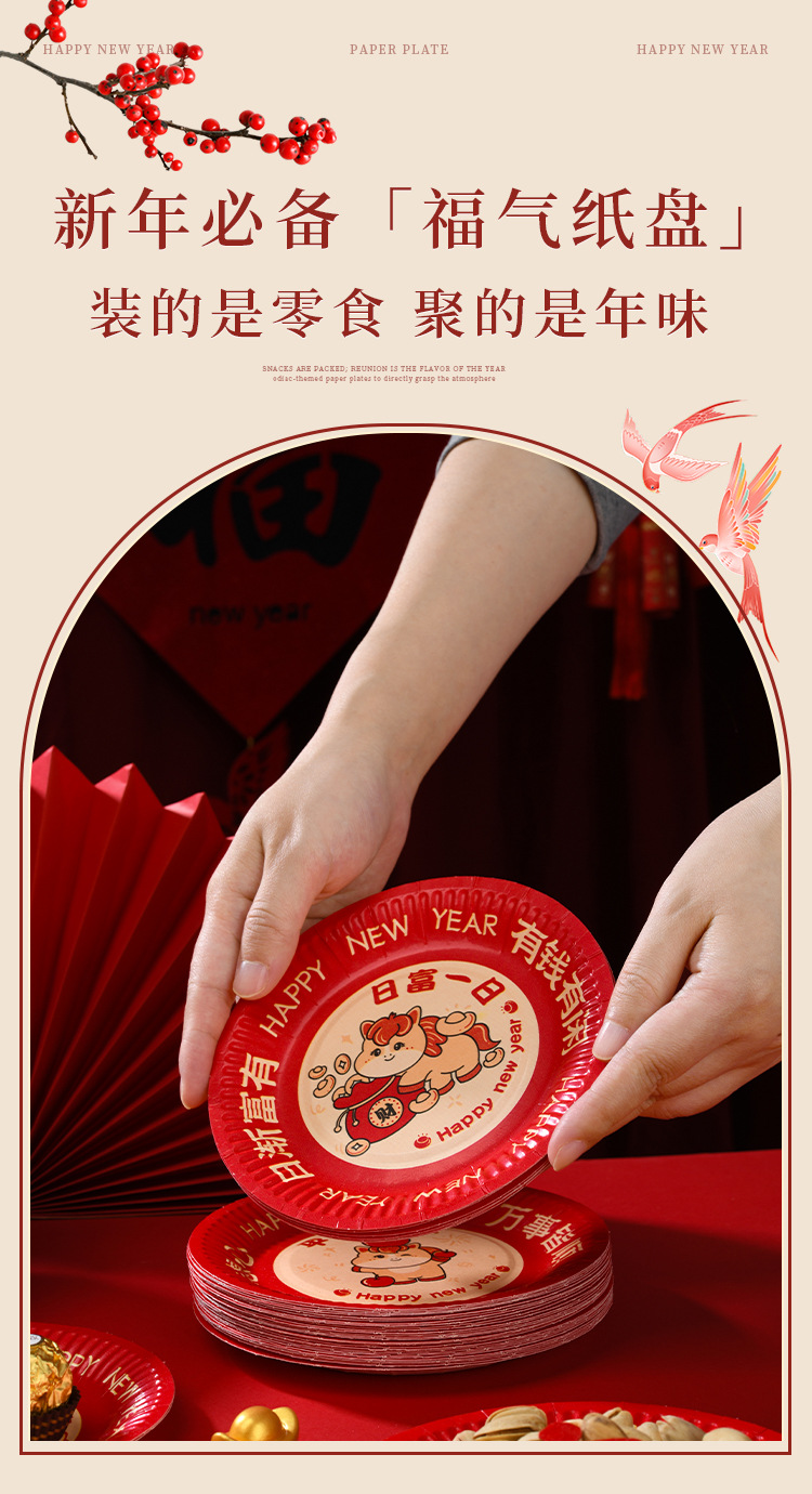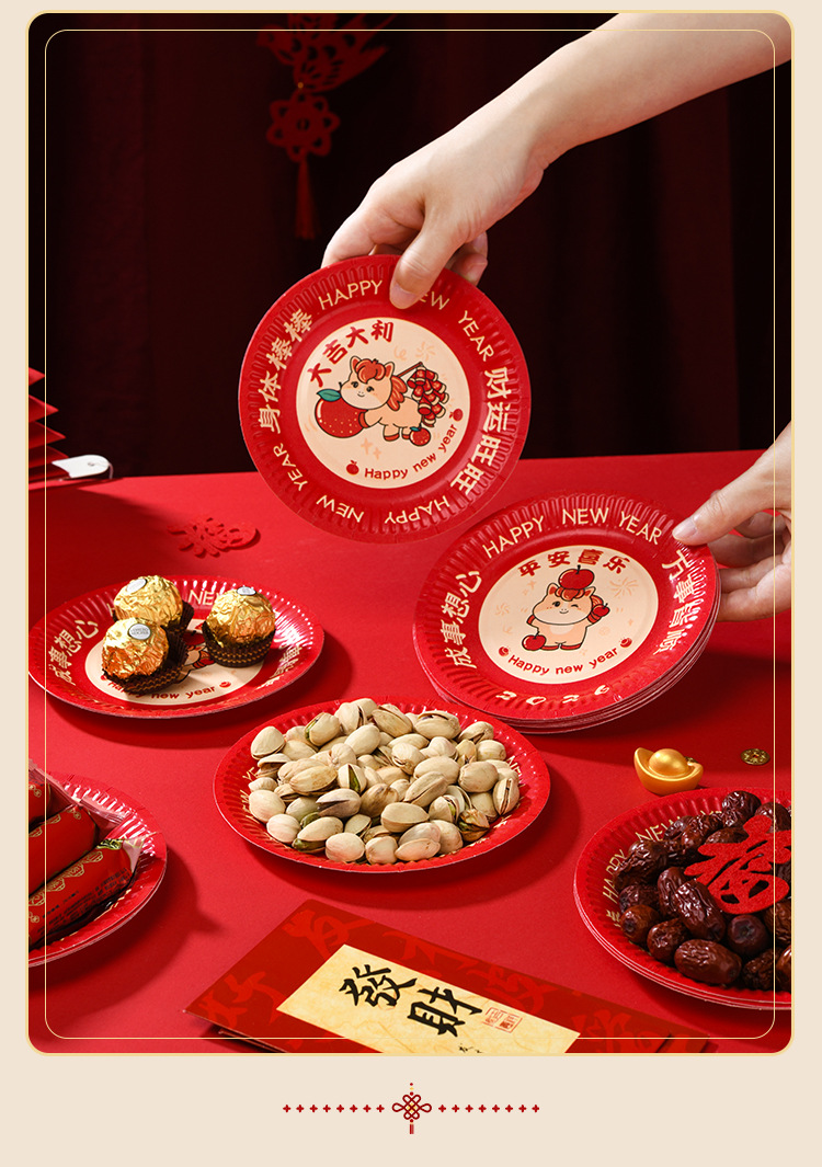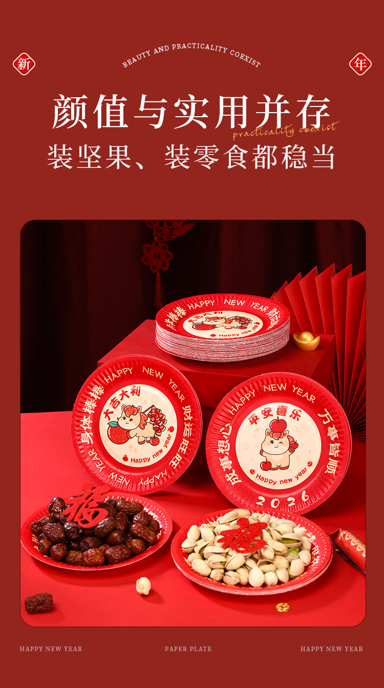 【喜庆新年款】2026马年新年春节吐骨碟客厅家用一次性加厚盘子喜庆纸盘野餐零食干果盘.jc