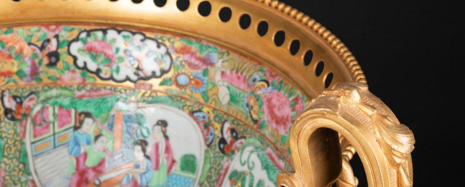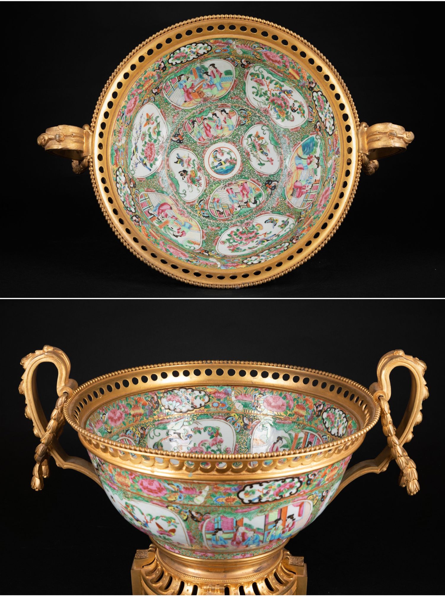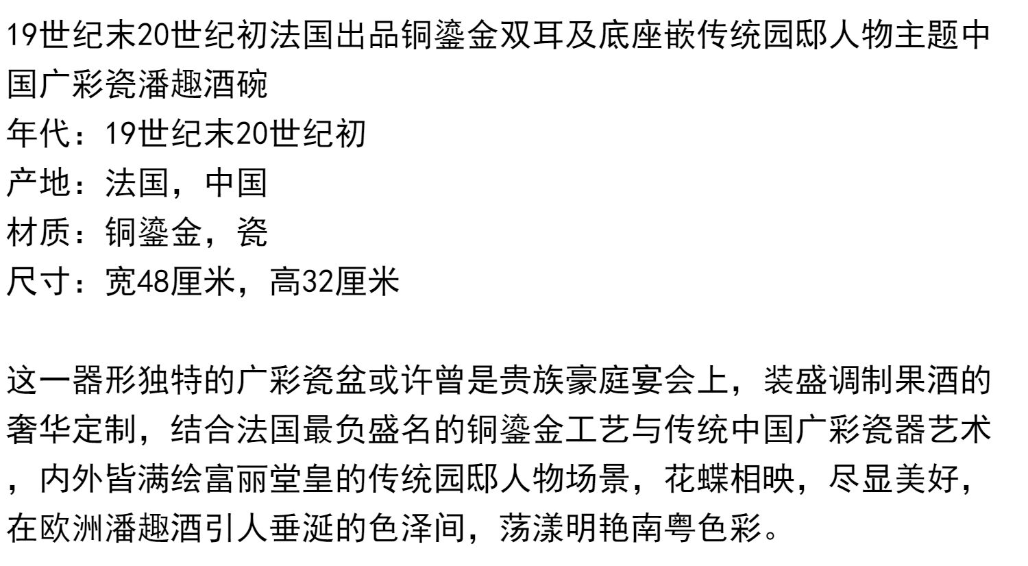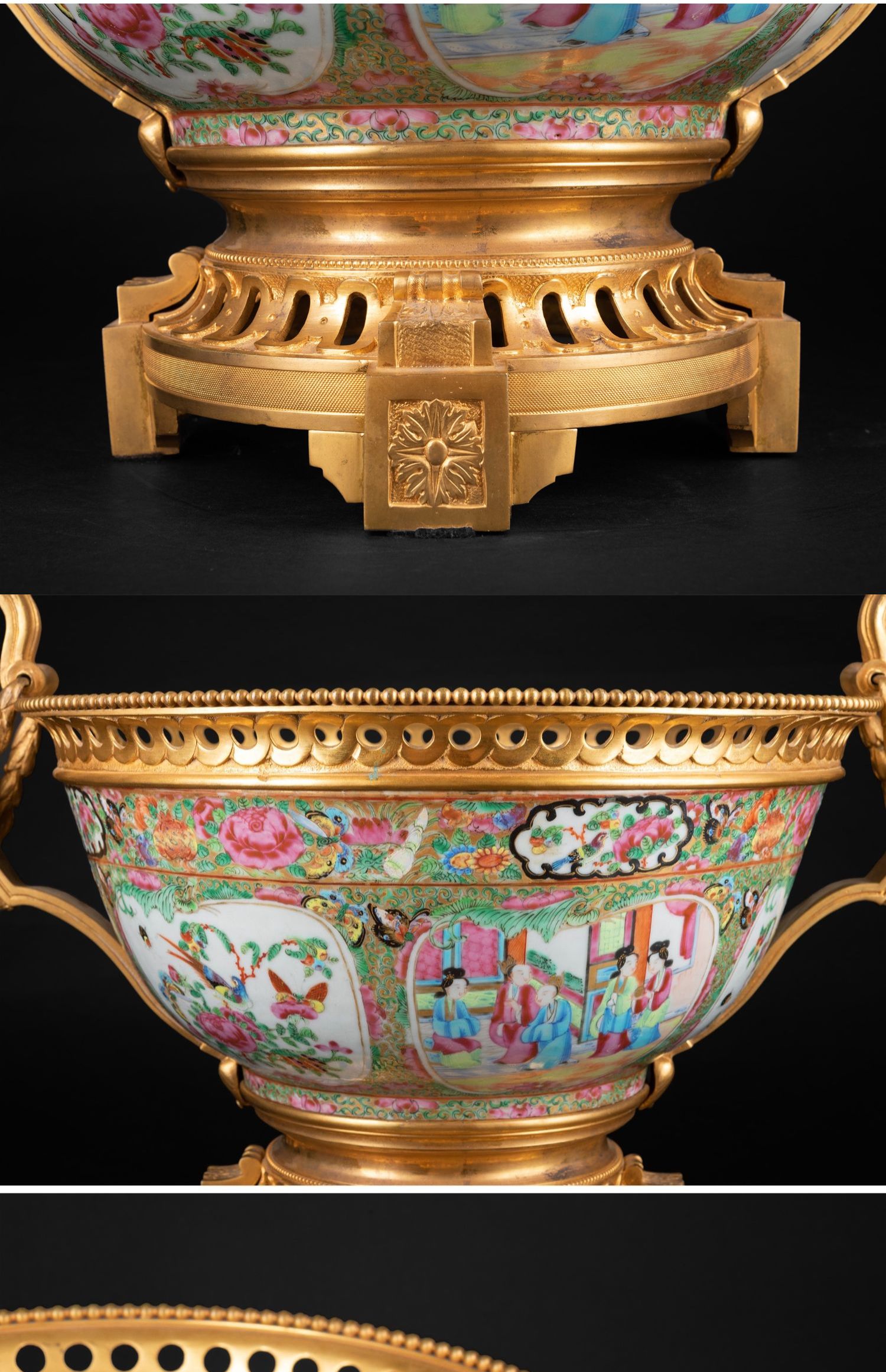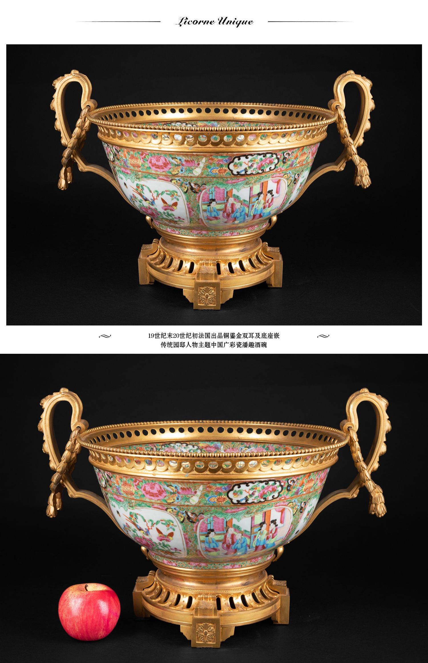 独角鹿西洋古董铜鎏金双耳底座嵌传统园邸人物中国广彩瓷潘趣酒碗