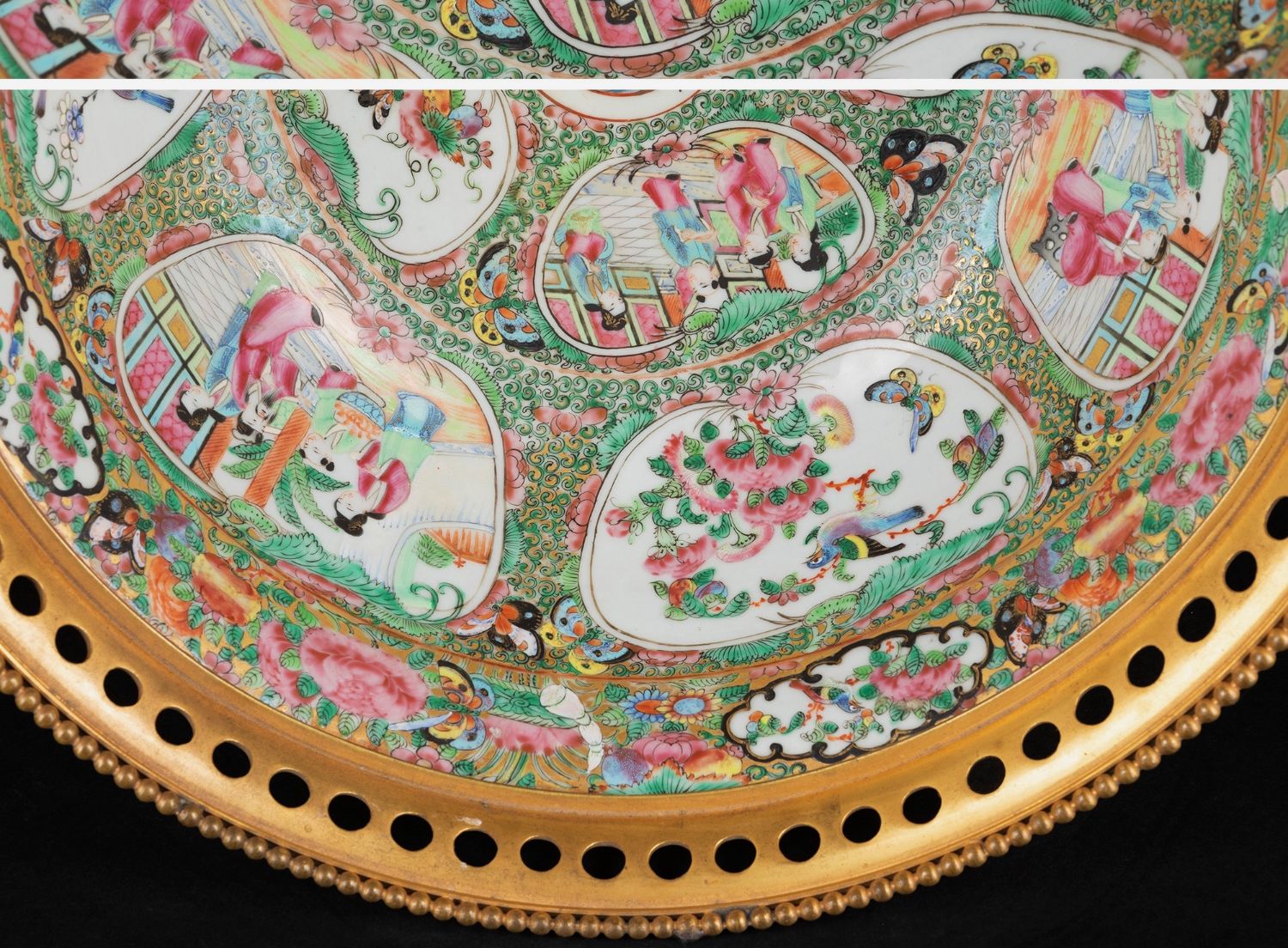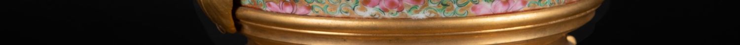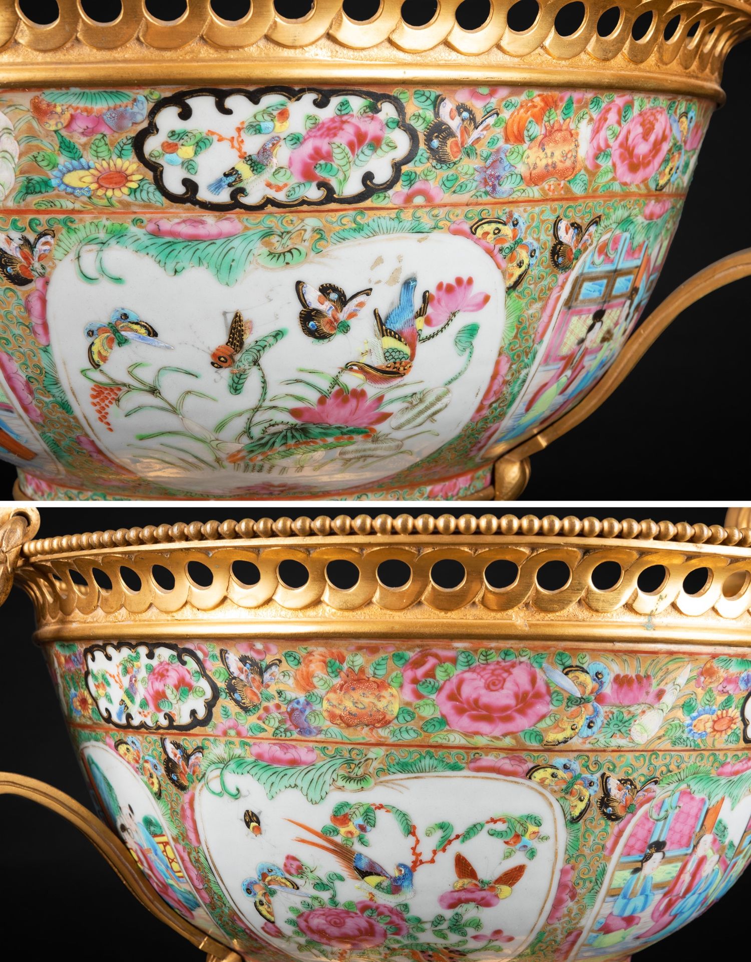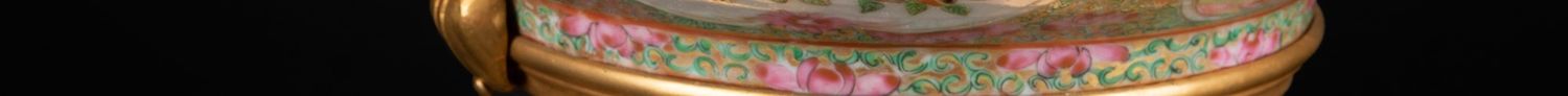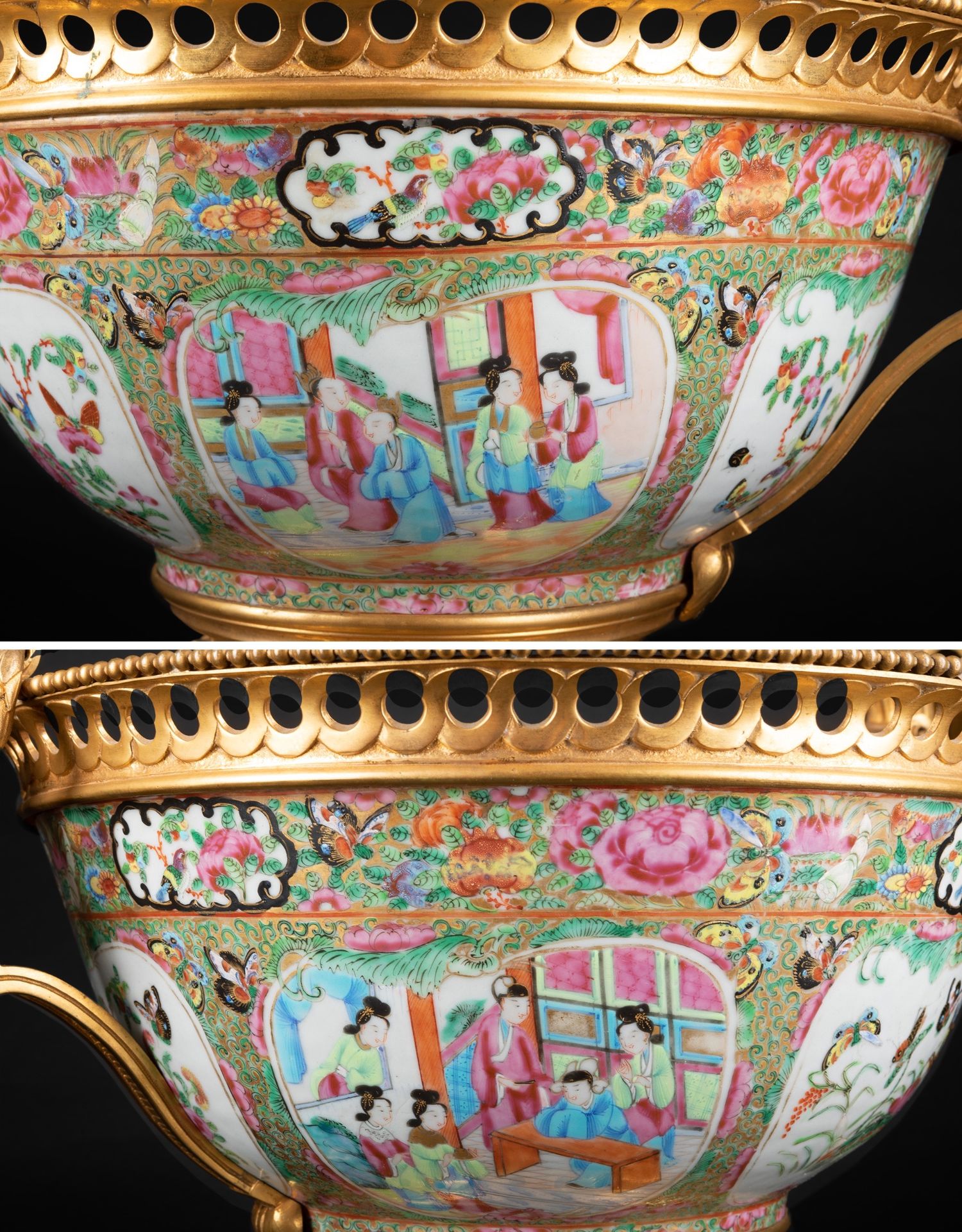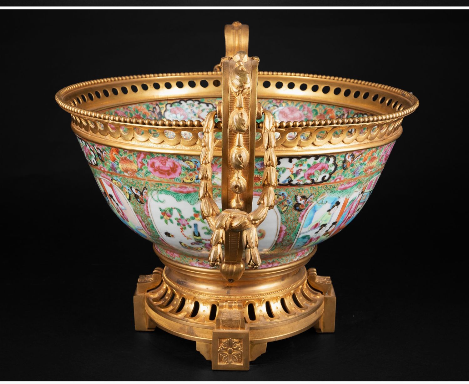 独角鹿西洋古董铜鎏金双耳底座嵌传统园邸人物中国广彩瓷潘趣酒碗