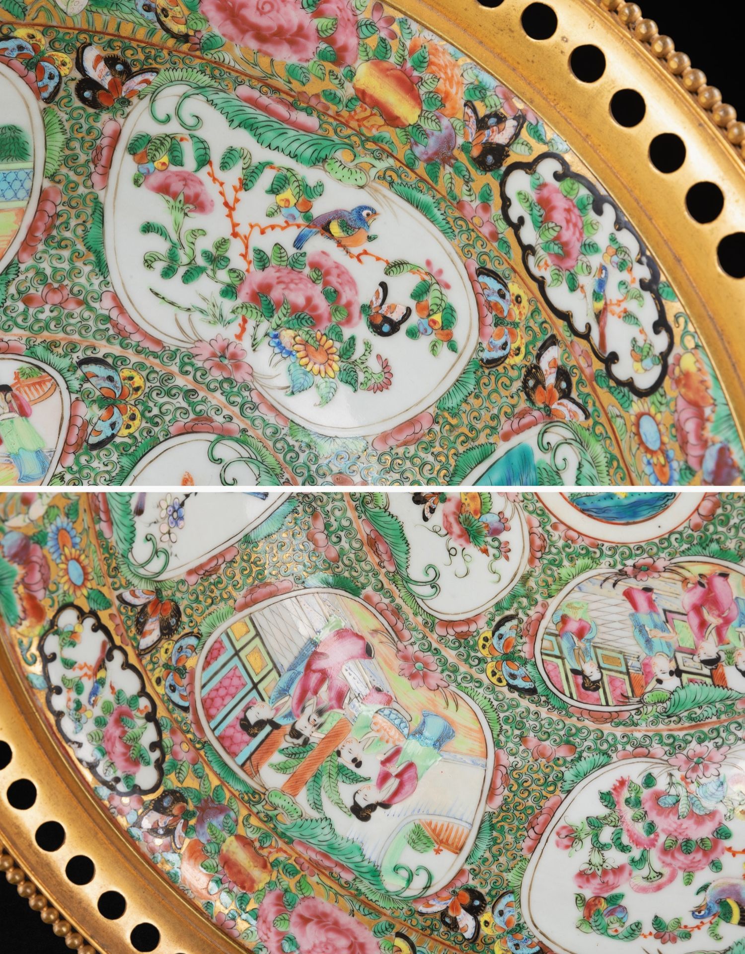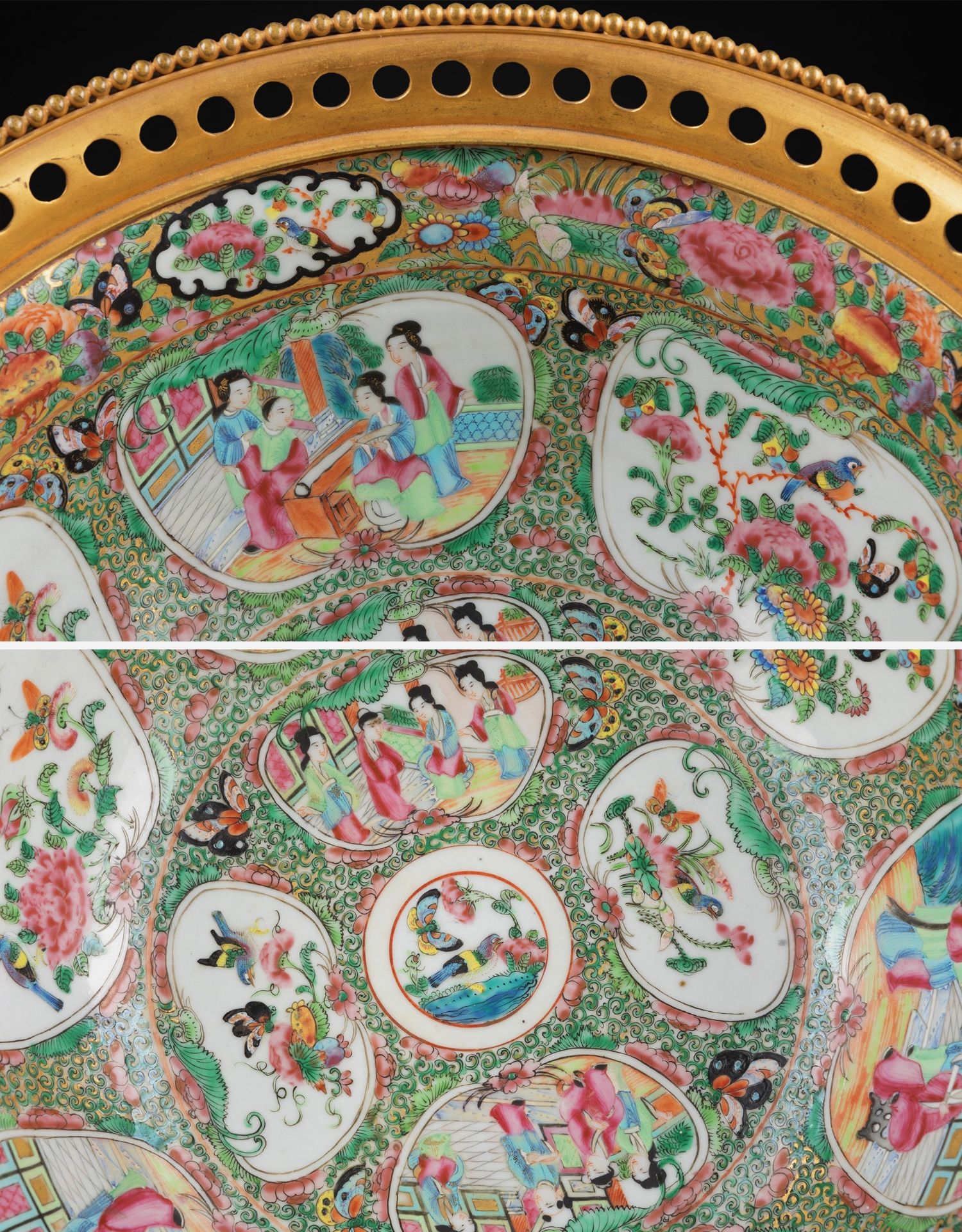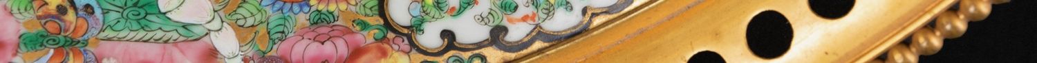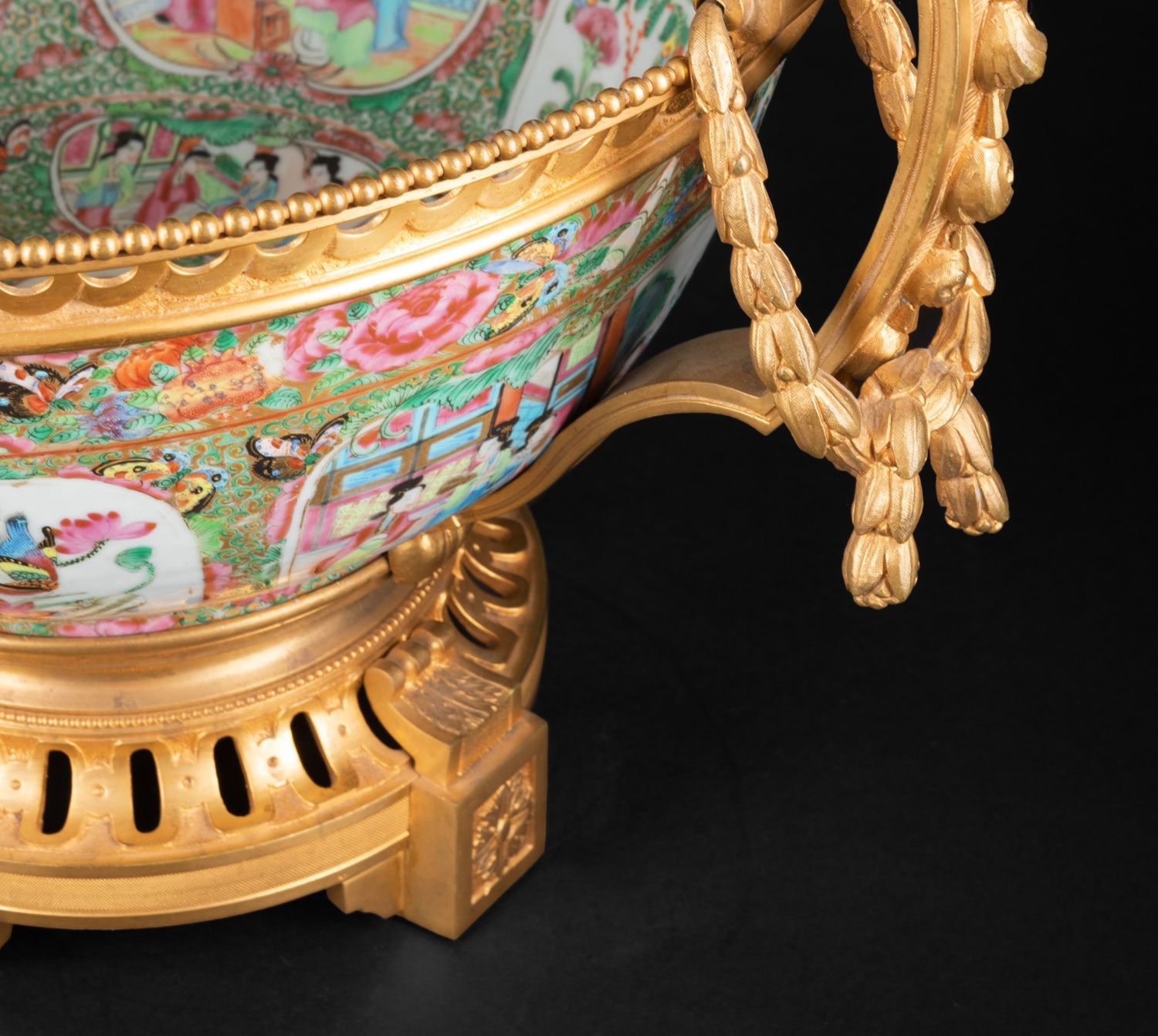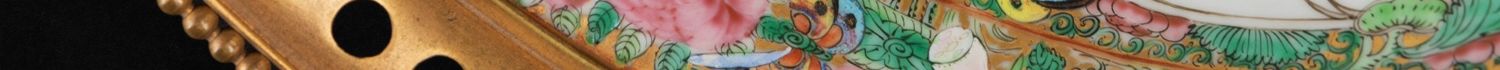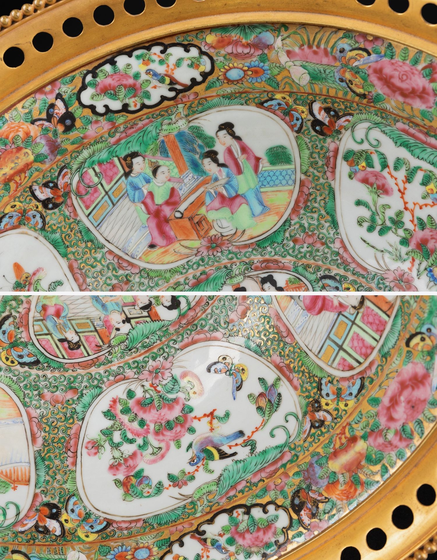 独角鹿西洋古董铜鎏金双耳底座嵌传统园邸人物中国广彩瓷潘趣酒碗