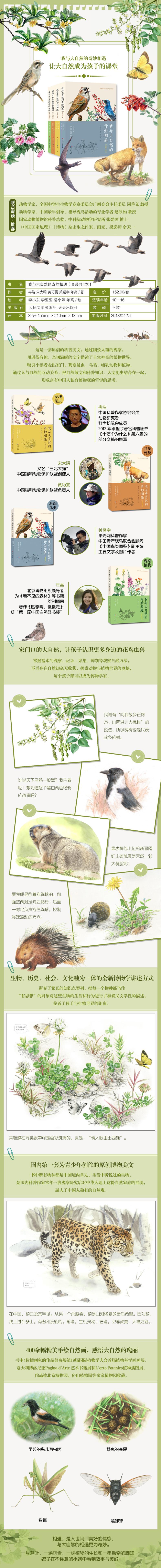中国猫科动物保护联盟(CFCA)两位资深成员深入山野,基于多年对中国12种猫科动物保护调查一手资料与亲身经历创作而成。 在大自然中培养专注力与探索精神。在山野中与每一次动物的相遇,都是偶然,生态环境的脆弱让野生动物越来越稀有;但每一次相遇也是必然,都是长年蹲守、苦苦寻觅后的惊喜出现。 全新的博物学讲述方式。作者突出了寻觅野生动物的过程与前期大量的准备工作,通过近距离长时间相处后用讲故事的方式描述了野生动物的生活习性、生存环境,趣味横生。 贴合中国自然环境的讲述。书中提到的所有动物情况,都是在中国环境背景下的真实现状,激发孩子对中国自然家底的保护与热爱。 插画家为中国猫科动物保护联盟志愿者,手绘百余幅精美博物画,画中的野生动物,让读者感受到野生动物恬静而安逸地享受着大自然的馈赠。 国家动物博物馆科普总监张劲硕博士审读推荐。