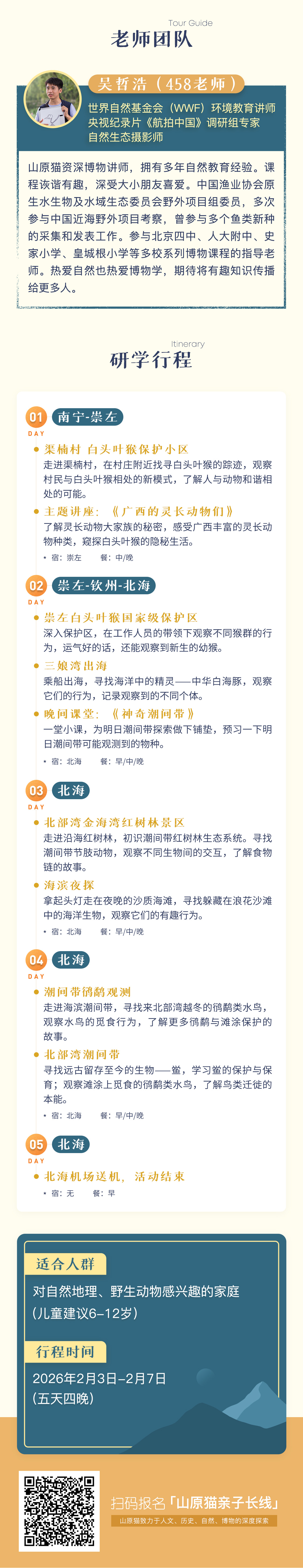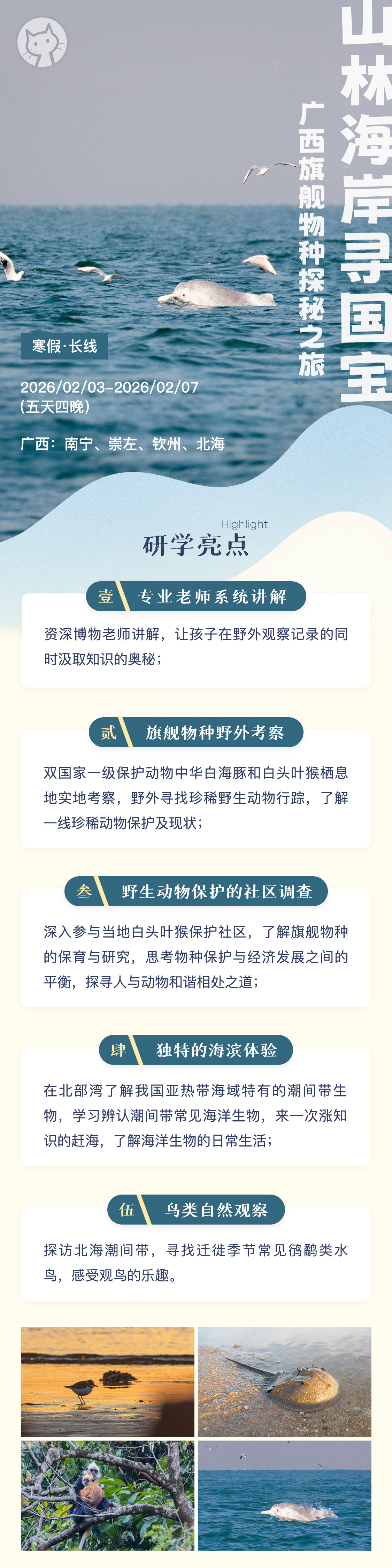 广西旗舰物种探索之旅,大小朋友穿梭于山林、海岸之间,寻找白头叶猴、中华白海豚的身影;倾听旗舰物种保护与保育的故事,思考人与自然和谐共生的方式。