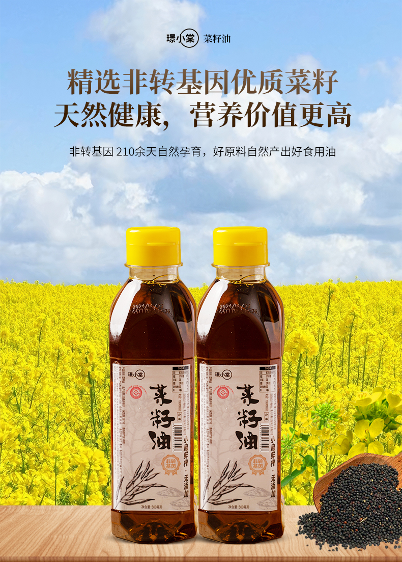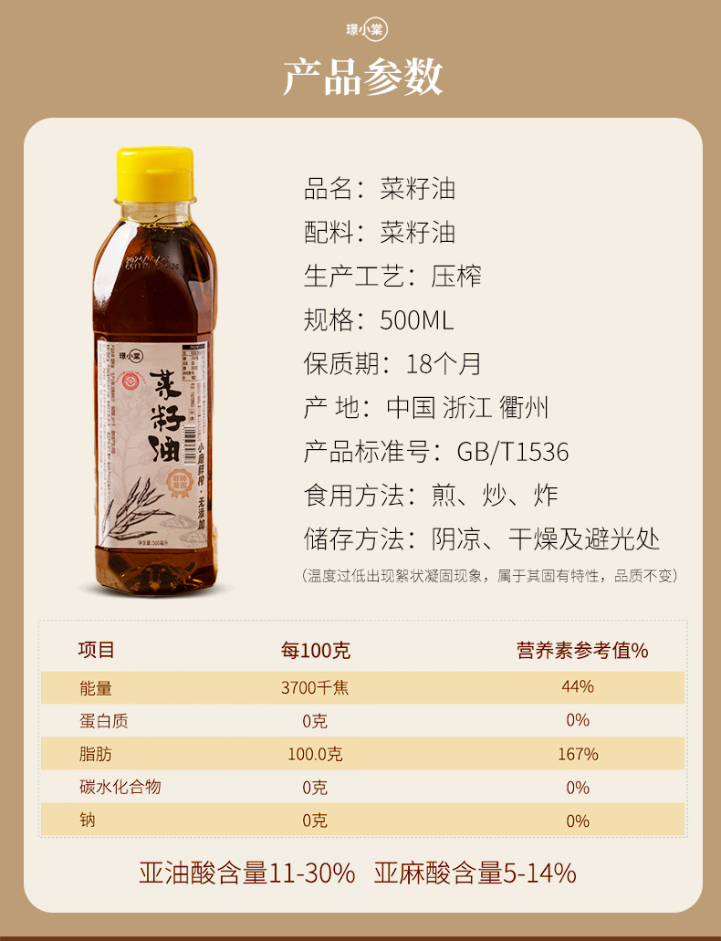 新年专享#【告别不健康食用油】物理压榨·低芥酸·菜籽油 浙江老字号 杭州亚运会运动员餐厅供应商 非转基因菜籽 高烟点 油烟少 500ml/瓶