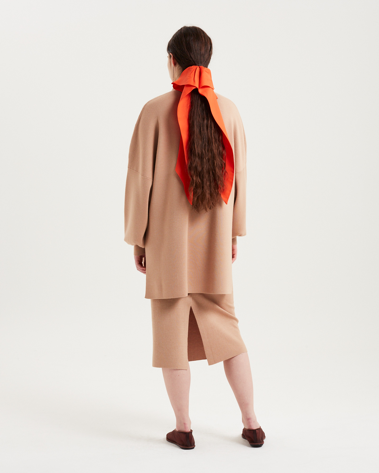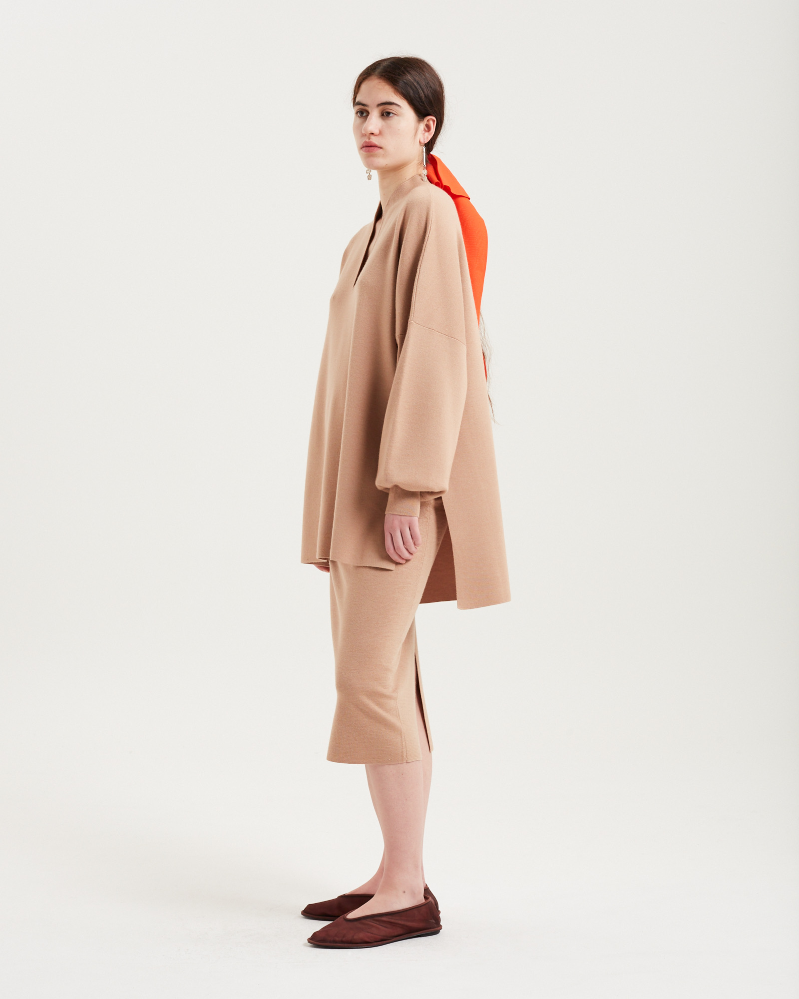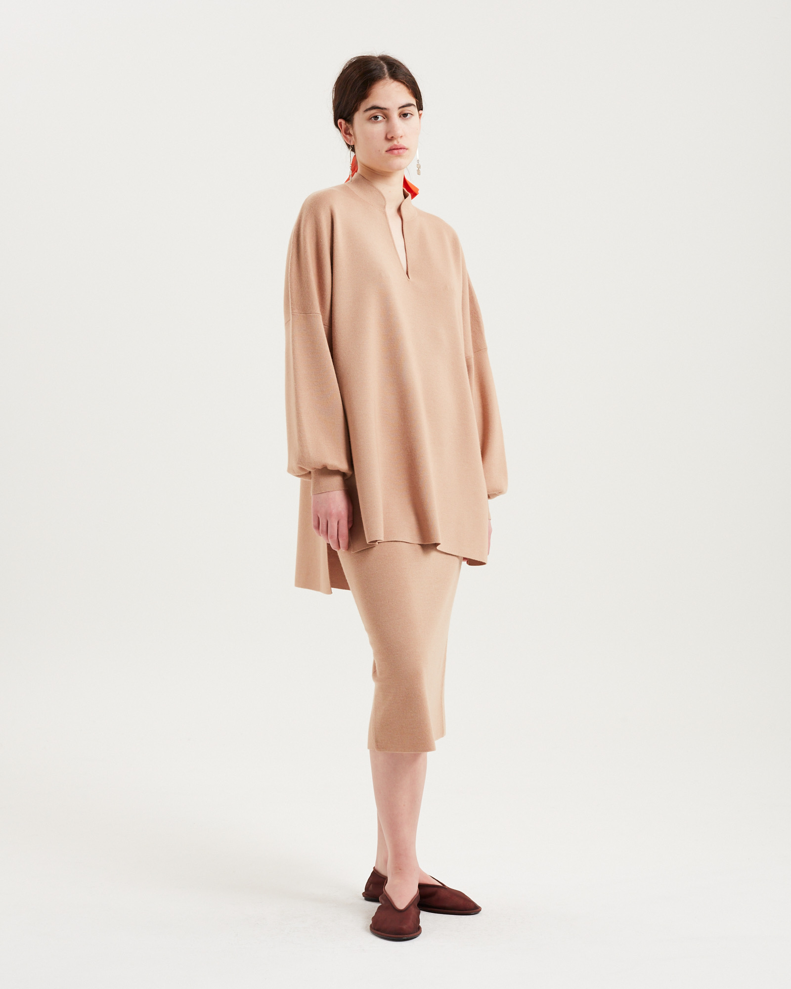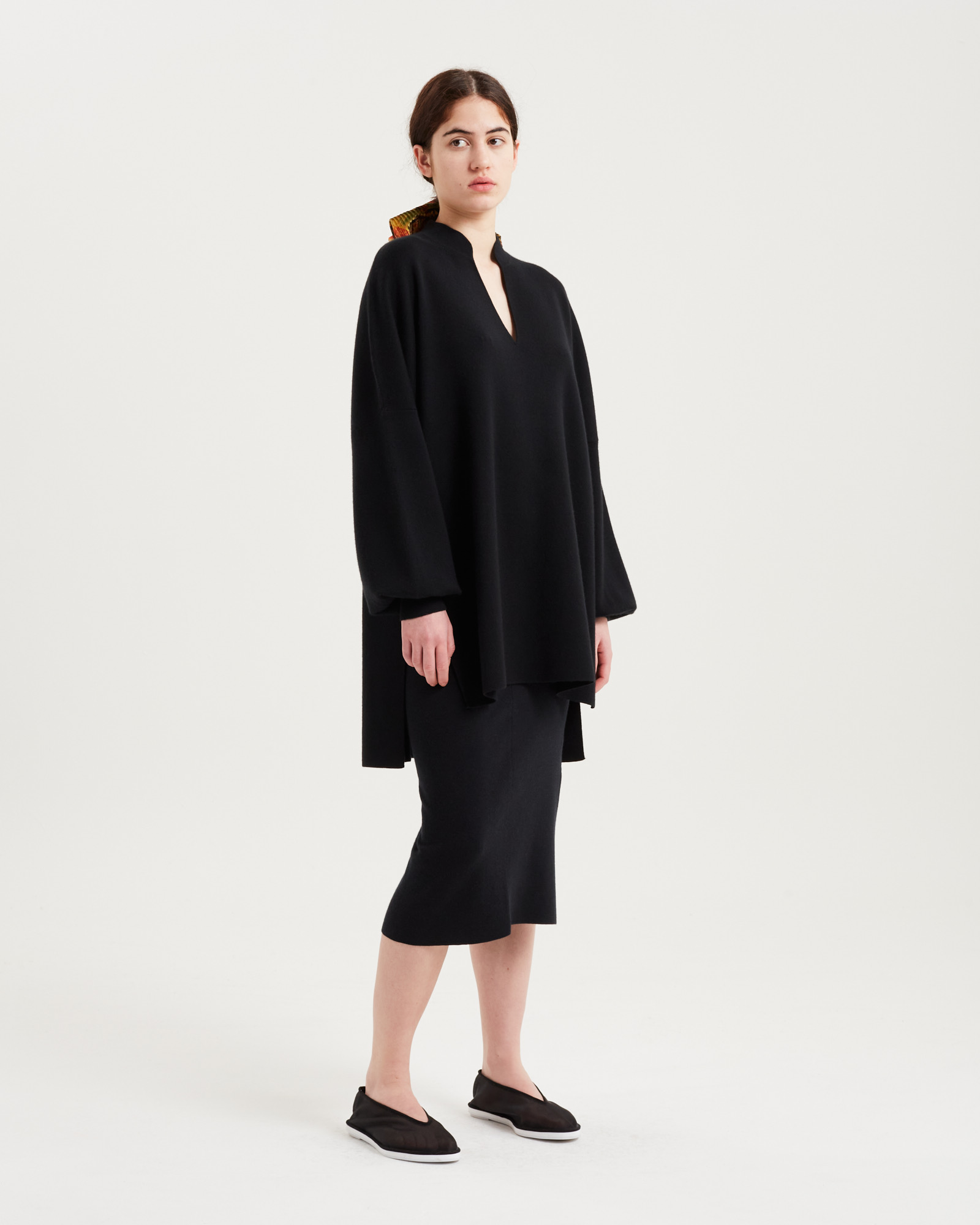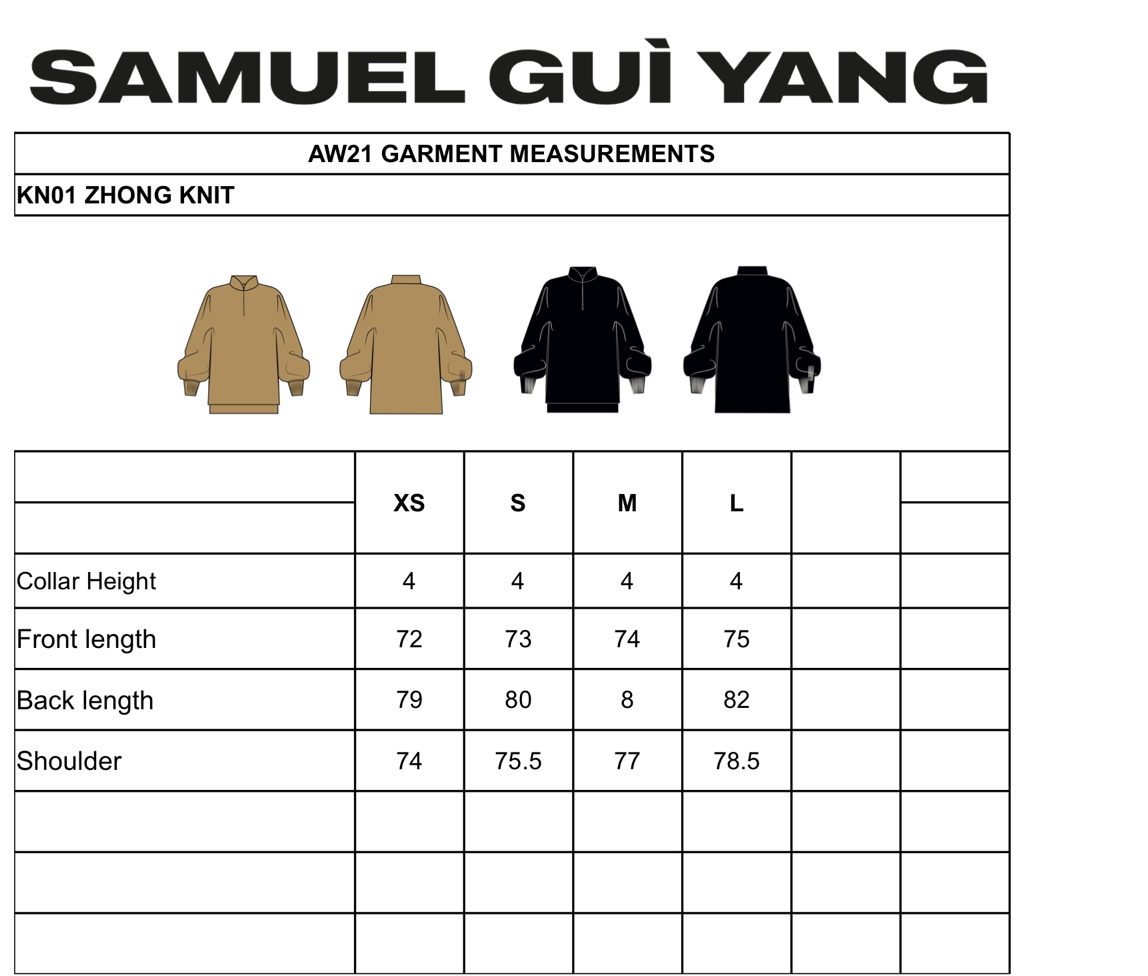 Zhong knit是一款舒适精致的针织单品,款式休闲宽松,面料采用结实、紧密和抛光的针织料,营造出正式、权威的感觉。深而收紧的袖口增加了服装的沉着感。设计师还在袖子增加了一些滚动的松量,表达了对功夫制服的致敬。领口在前中心呈弧形 V 形开口,顶部有一个中式立领,打造出优美的流线型。