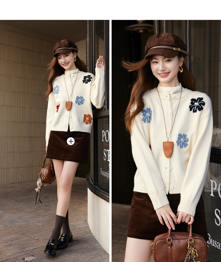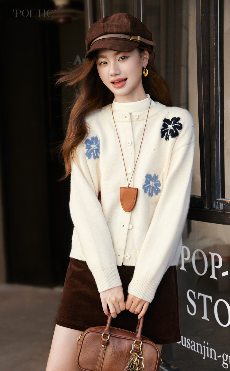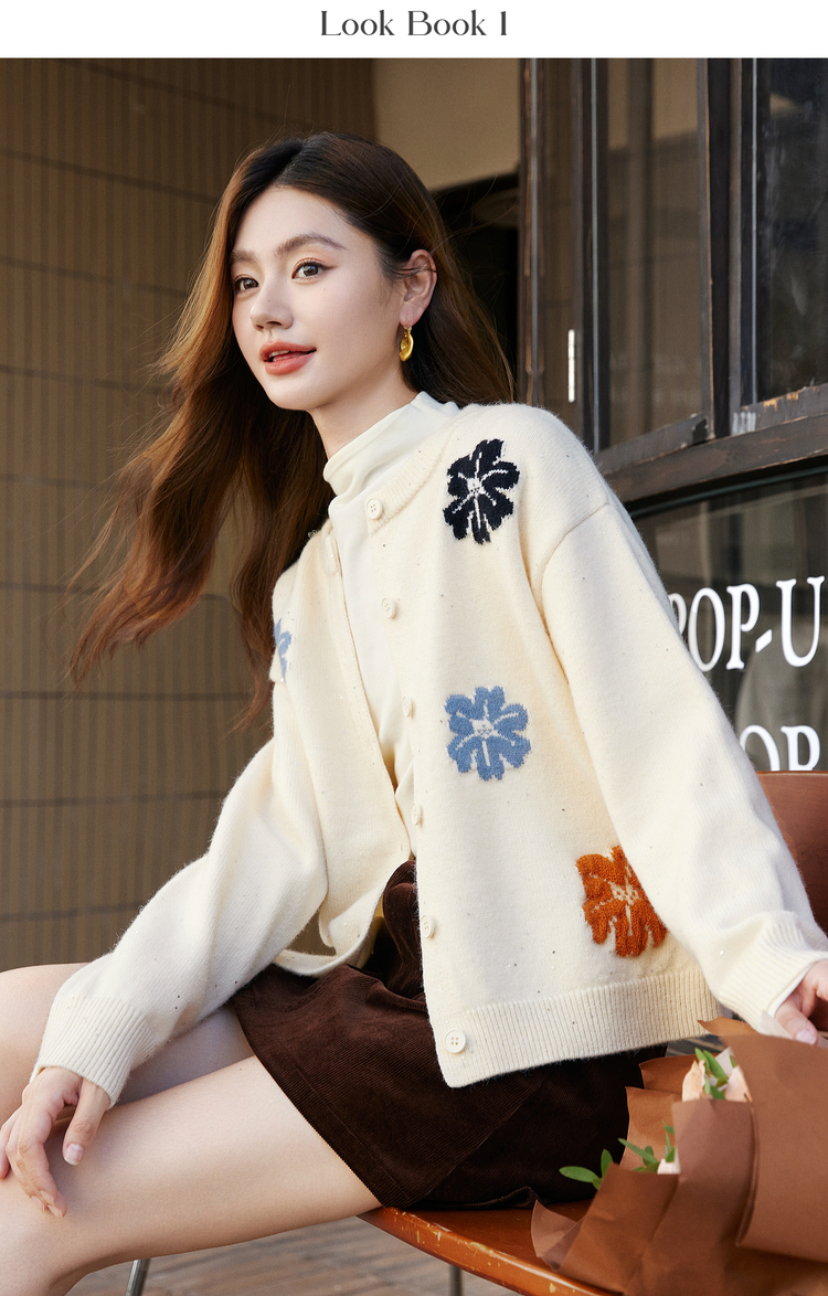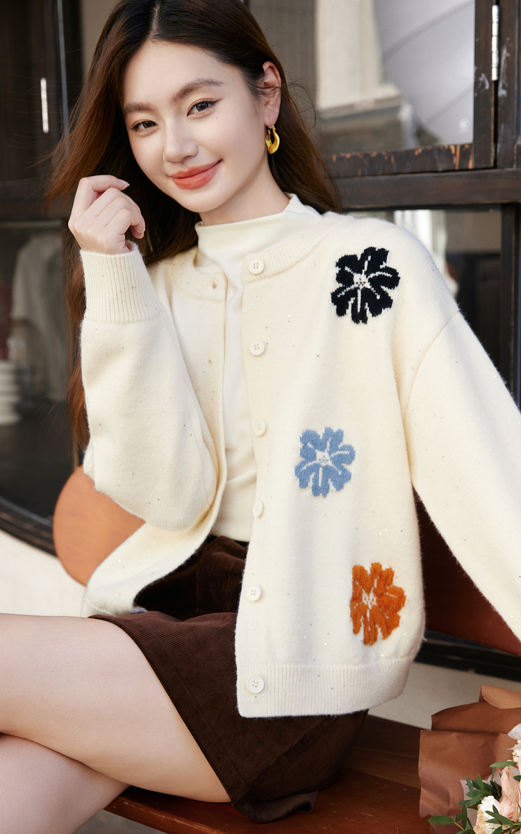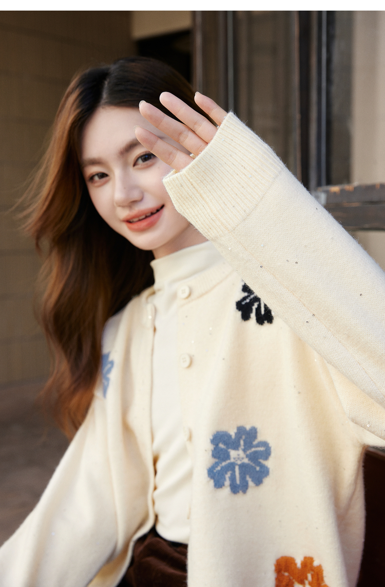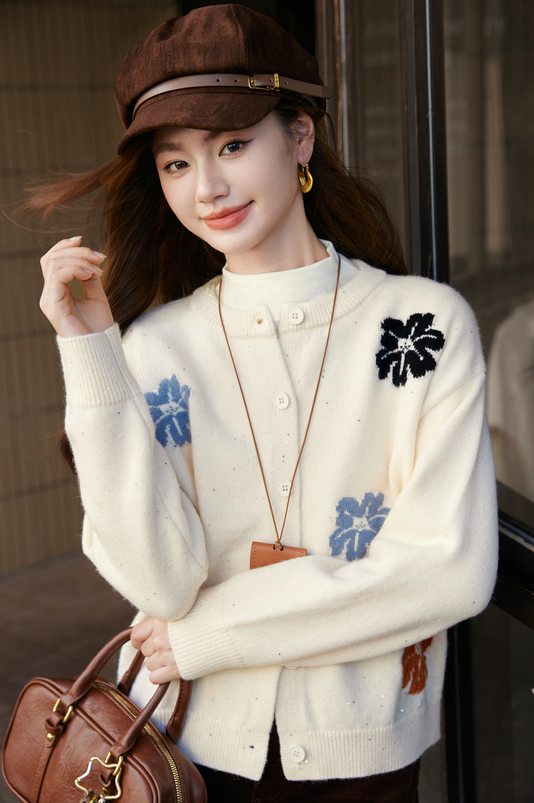 【10/29新品】熙世界珠片绣花卉针织开衫女2025秋冬款圆领长袖北极绒毛衣短外套