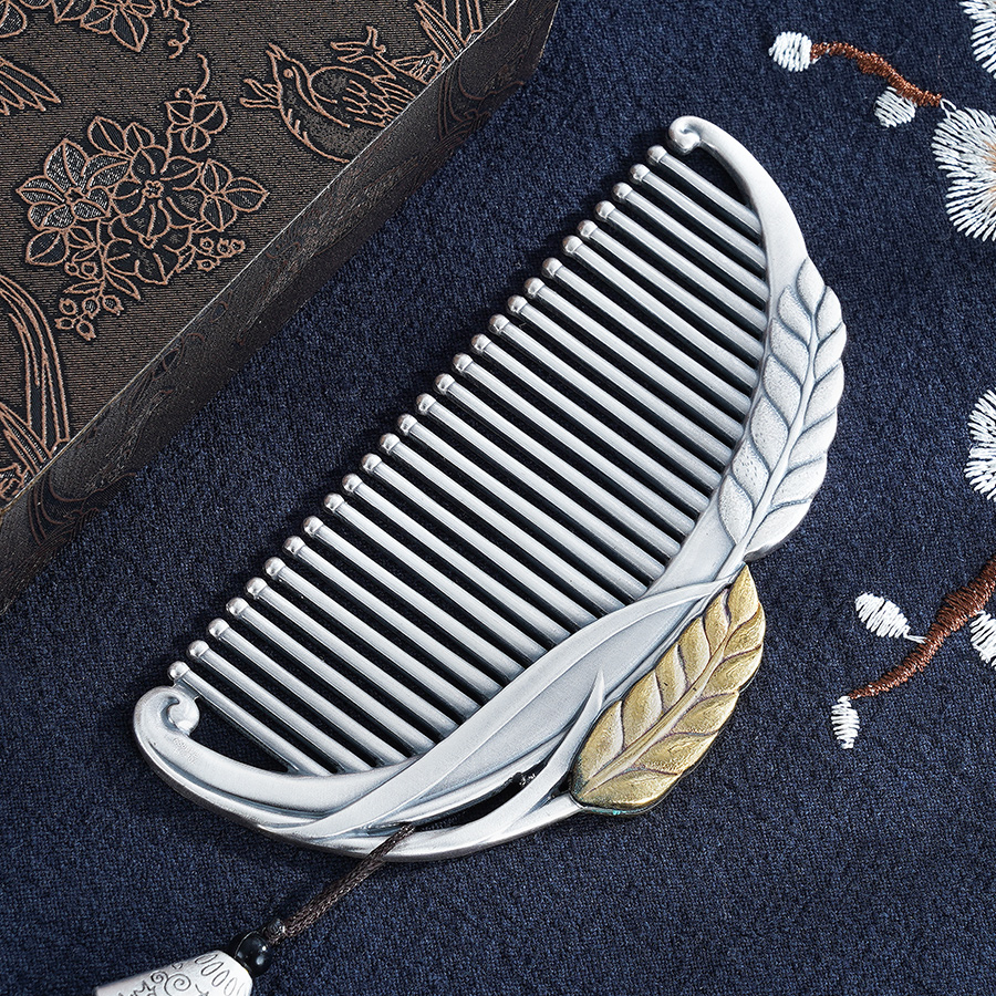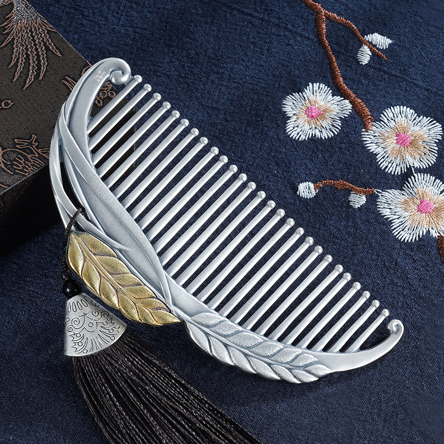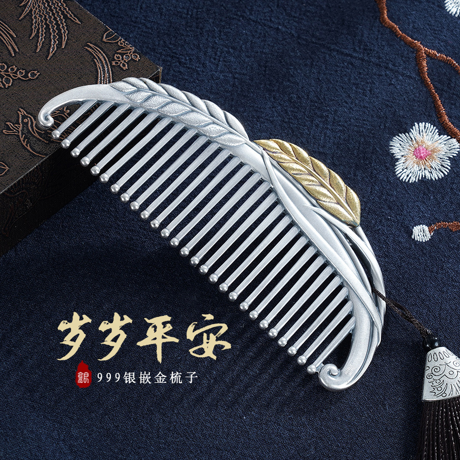 【寓意】:银梳以“麦穗”为灵感打造,采用仿古与镀金工艺,配以流苏坠饰,古朴典雅,又不失灵动婉约。寓意岁岁平安,岁岁优雅。