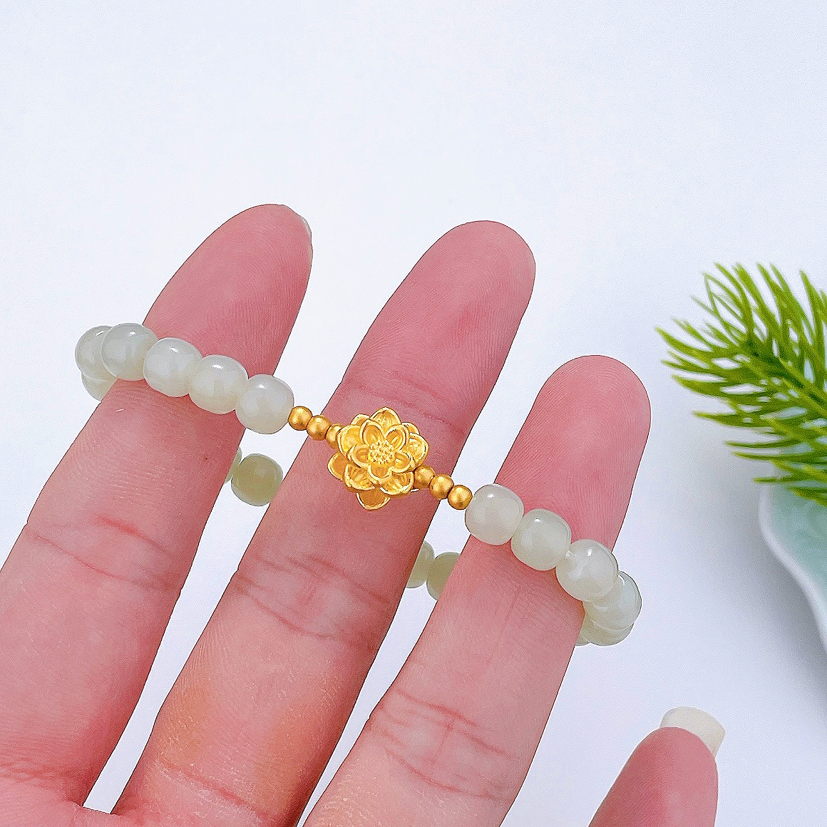 【限时7.5折】【定价黄金】足金 #小红书 3D硬金莲花金珠间天然和田玉(约7mm)成品手串(AL3DSC00010)(预售产品下单后不退款不退货不换货不补差价)