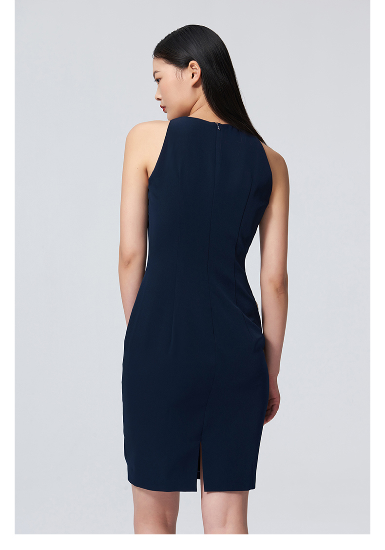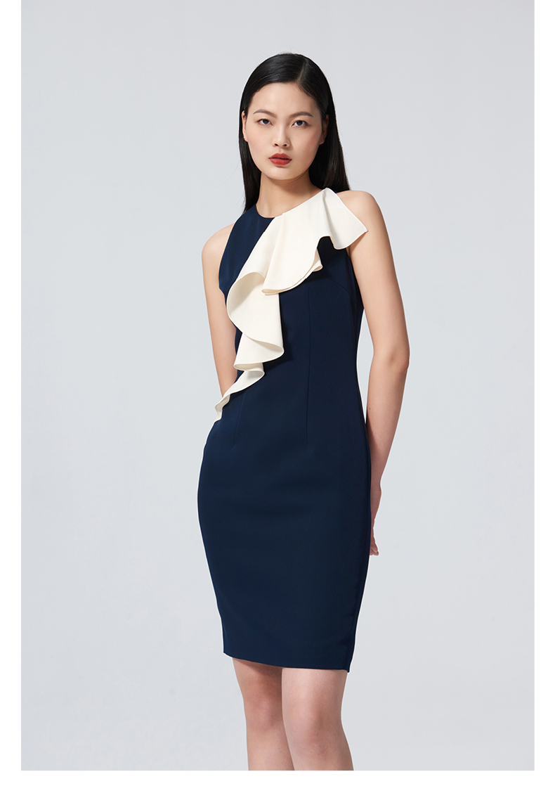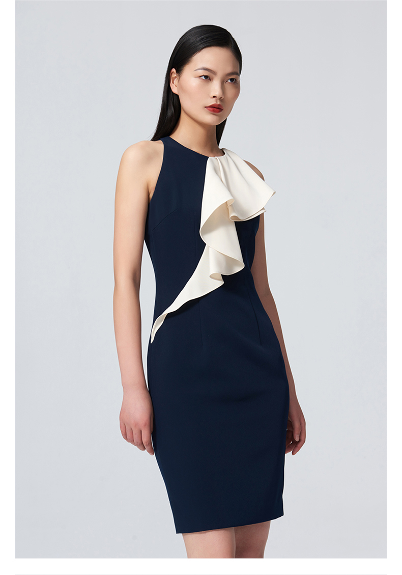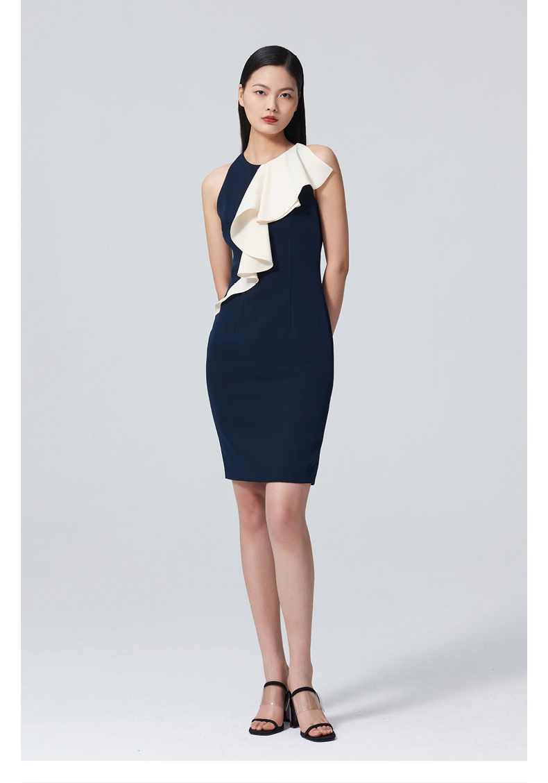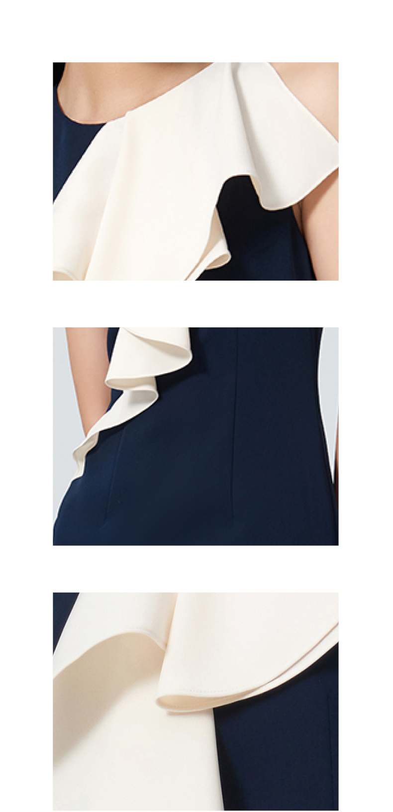 【木星浪花】设计款荷叶边藏青拼米白修身连衣裙/0000681A