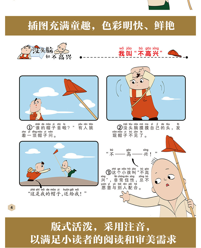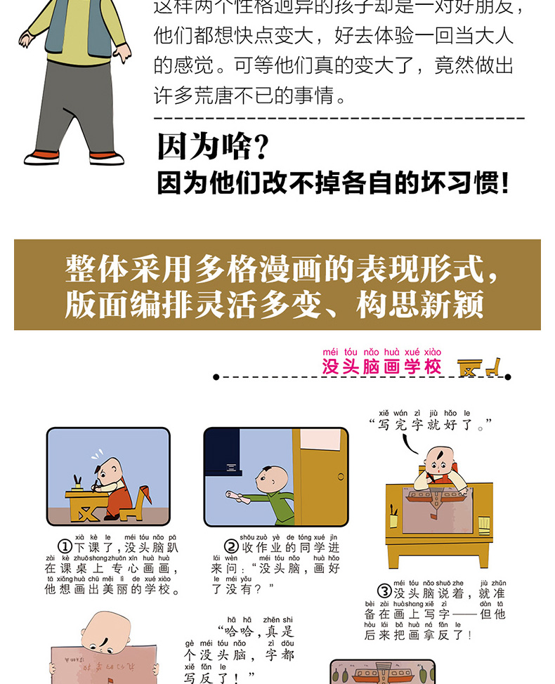 1.一个叫“没头脑”,做事情丢三落四;一个叫“不高兴”,喜欢由着自己性子。这样两个性格迥异的孩子却是一对好朋友,他们都想快点变大,好去体验一回当大人的感觉。可等他们真的变大了,竟然做出许多荒唐不已的事情。因为啥?因为他们改不掉各自的坏习惯!
