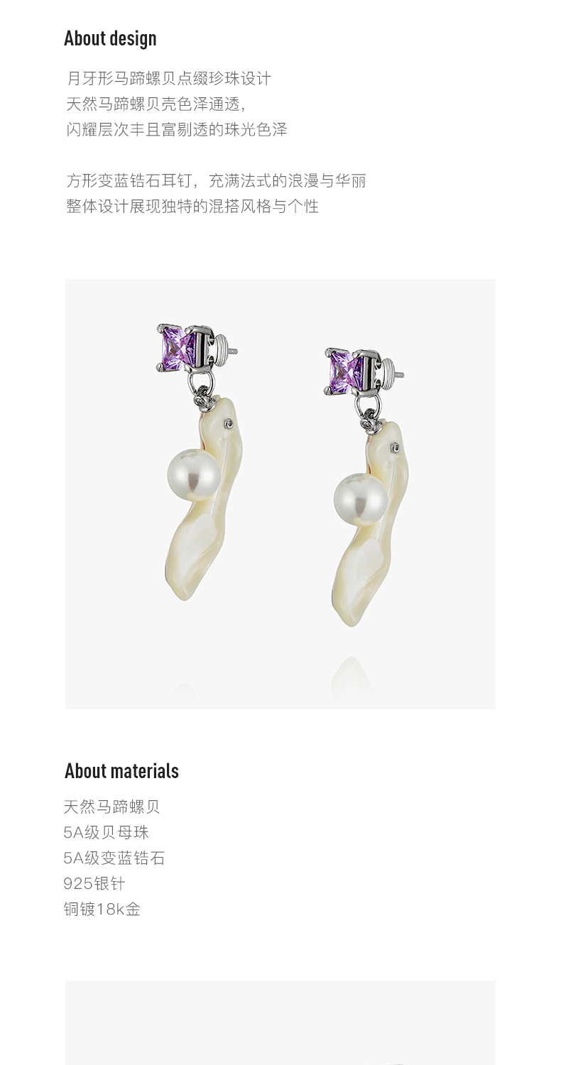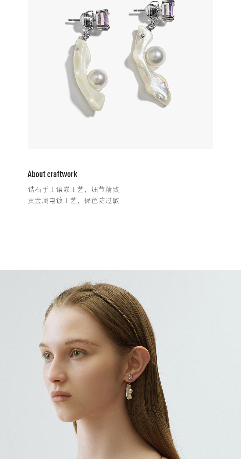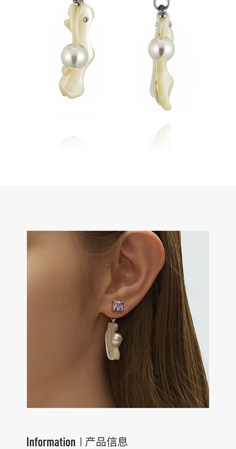 lost in echo 天然马蹄螺贝壳锆石法式珍珠耳环