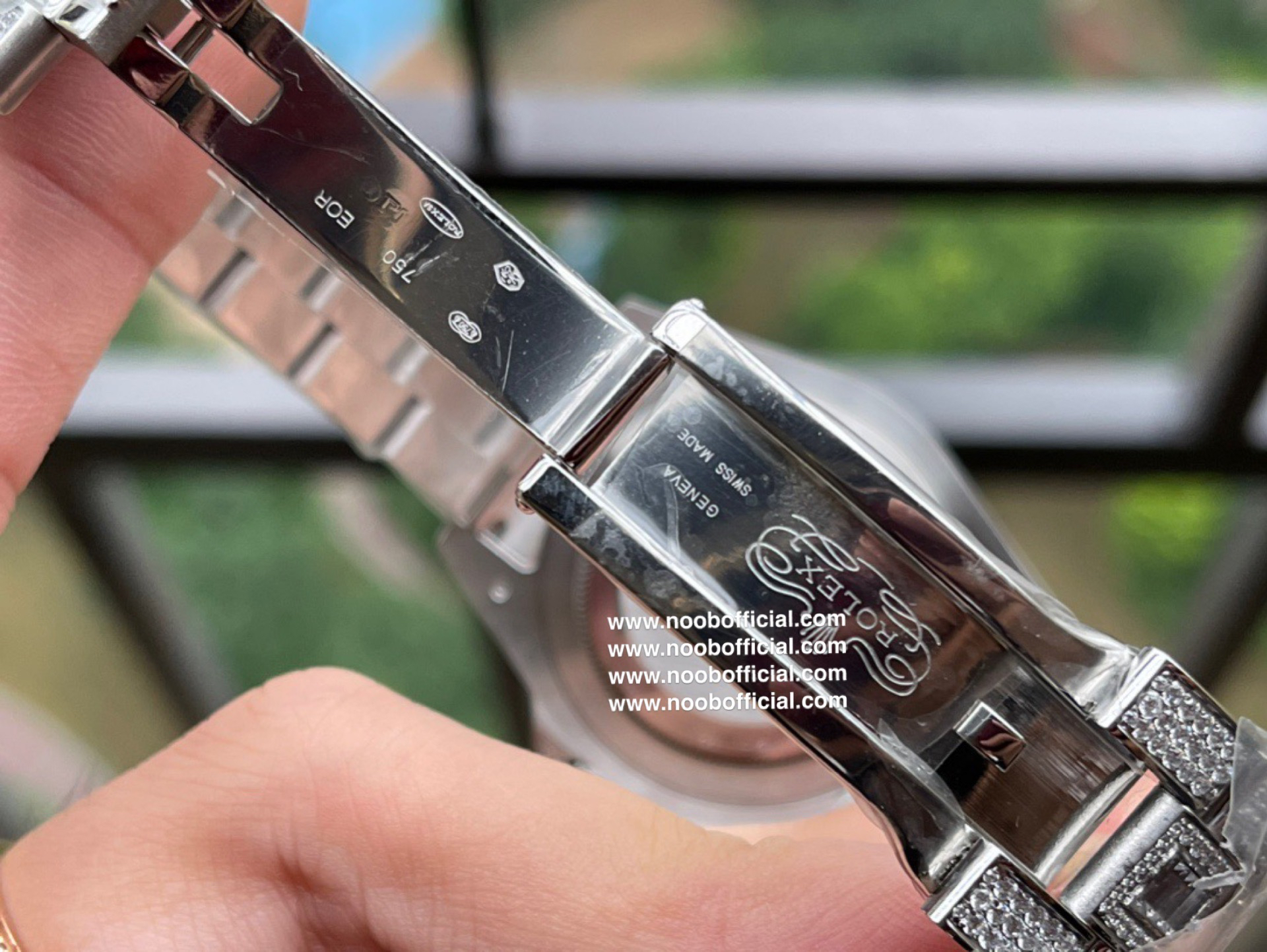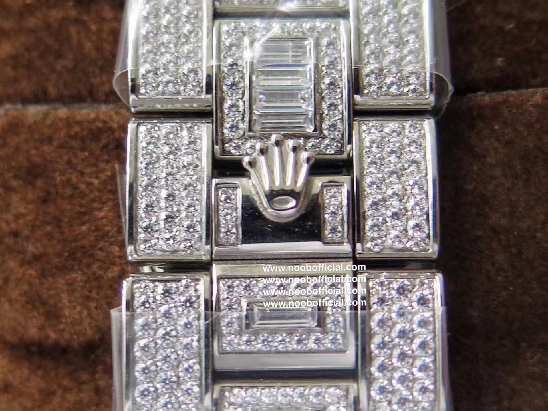 【表带】采用904L蚝式钢打造,蚝式表带于1930年代末推出,由三排宽大、平整的链节组成,极其坚固,表链全身也整齐缜密的镶满美钻,效果光华四射。