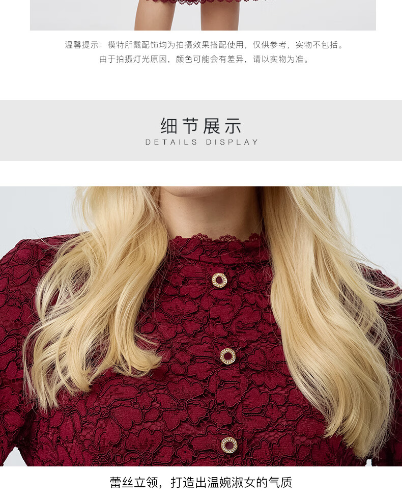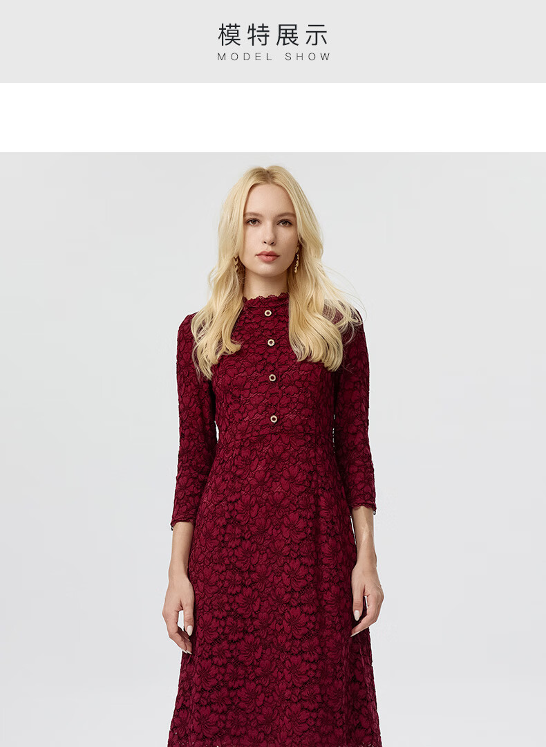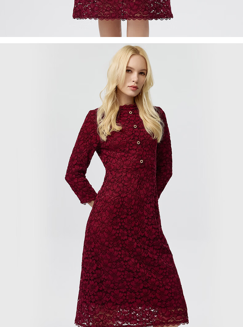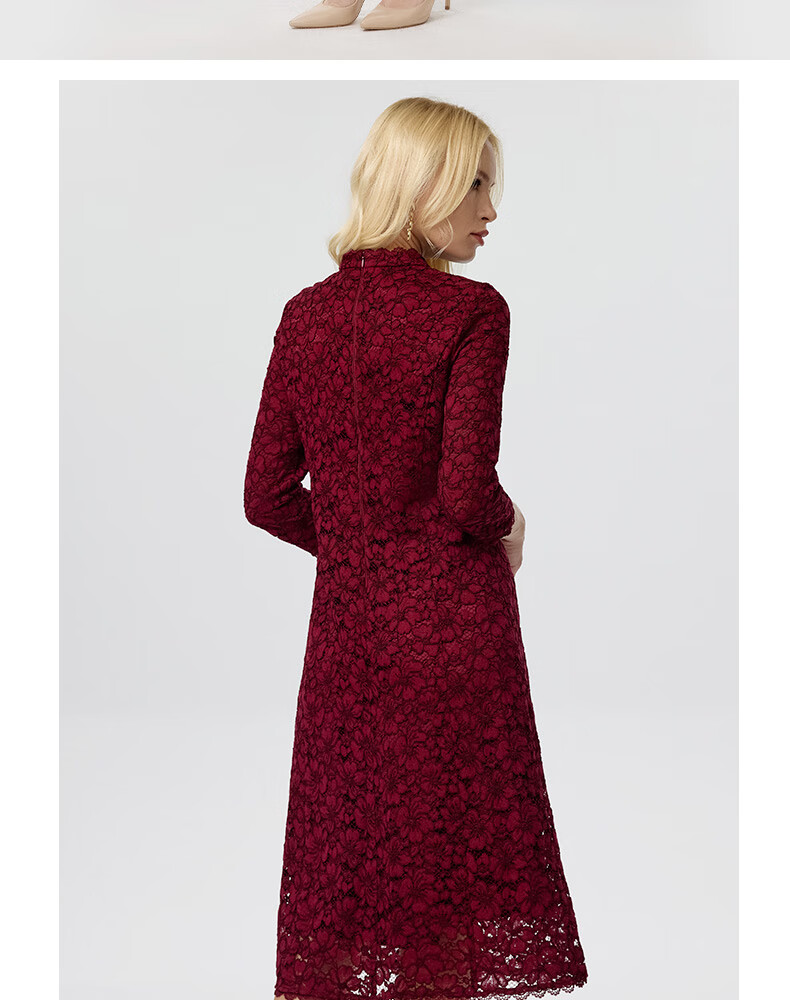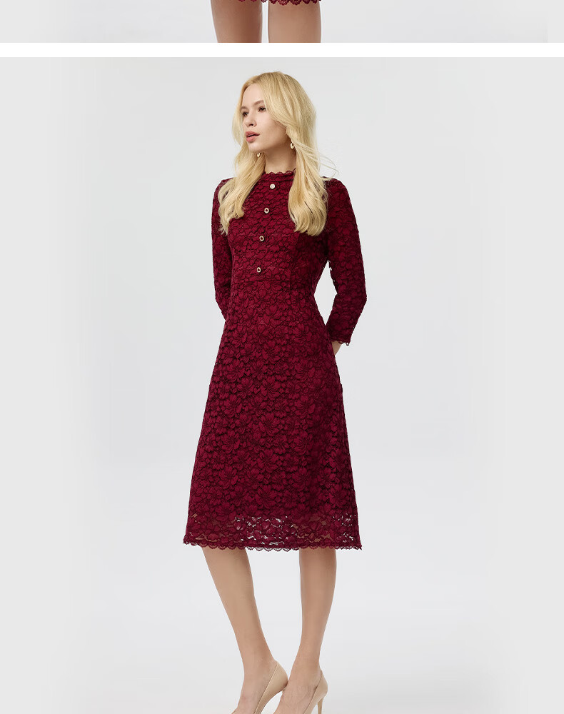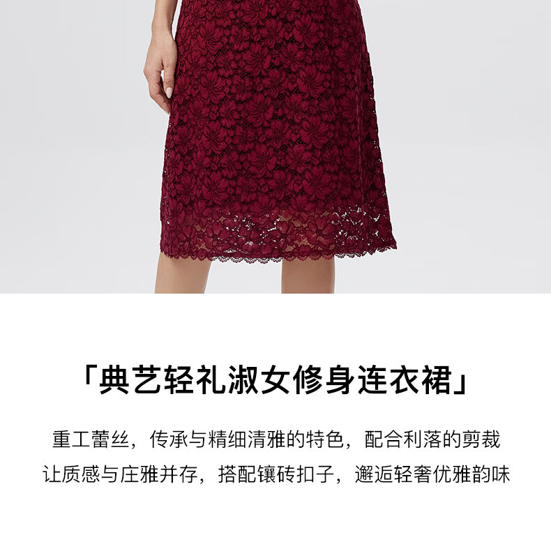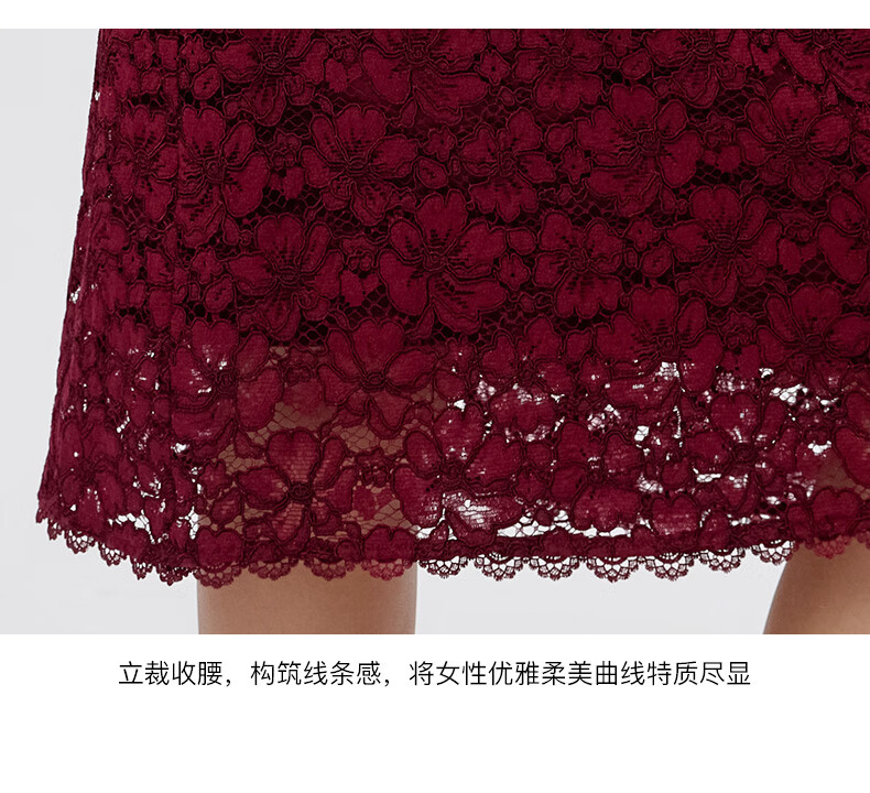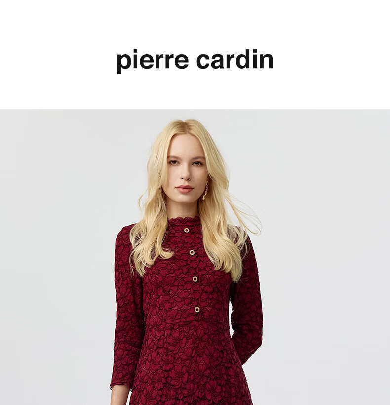 皮尔卡丹女装连衣裙蕾丝酒红色花边领宴会A摆轻礼服P3323E3863T0