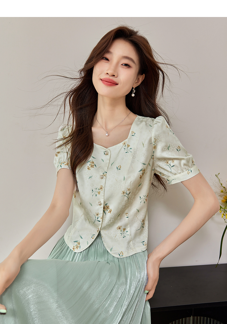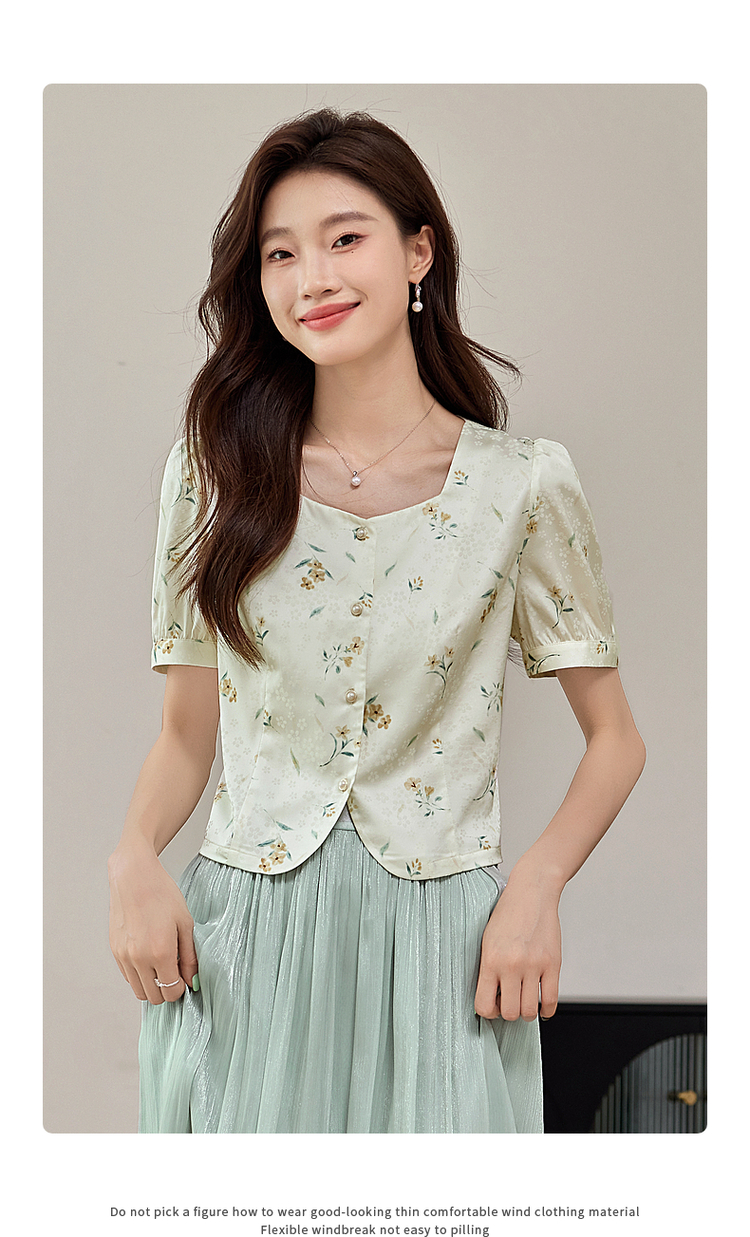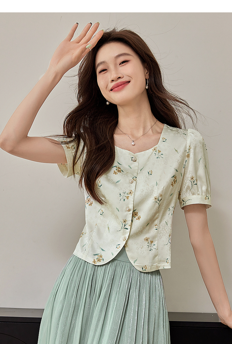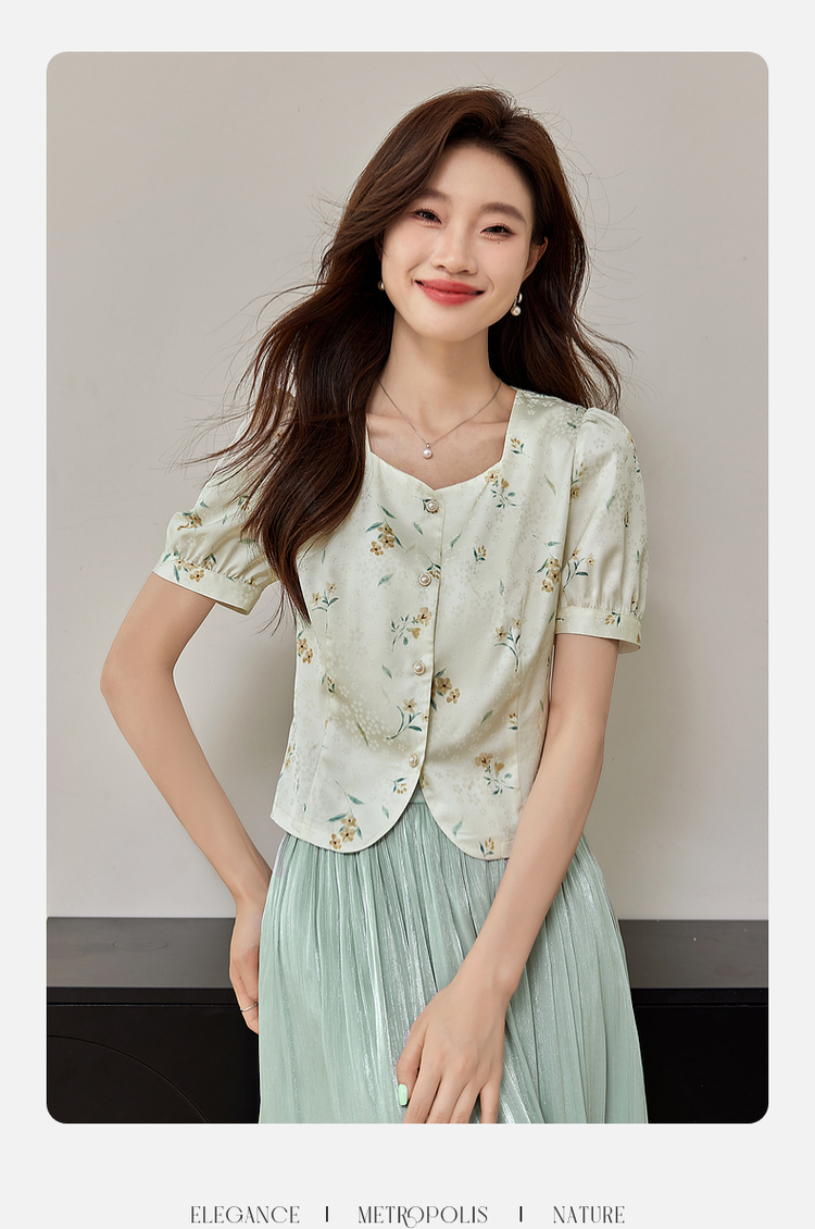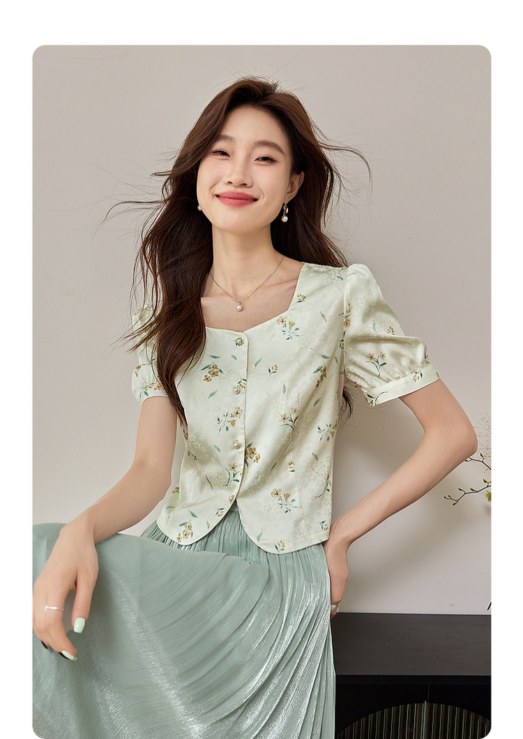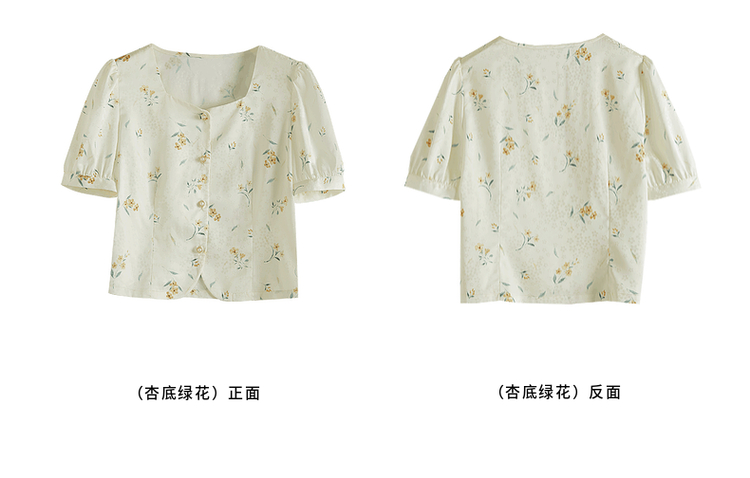 【专属特价】熙世界法式方领碎花雪纺衬衫2025夏日新款小个子泡泡袖短款上衣