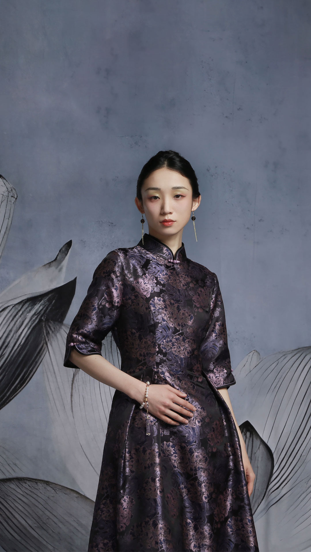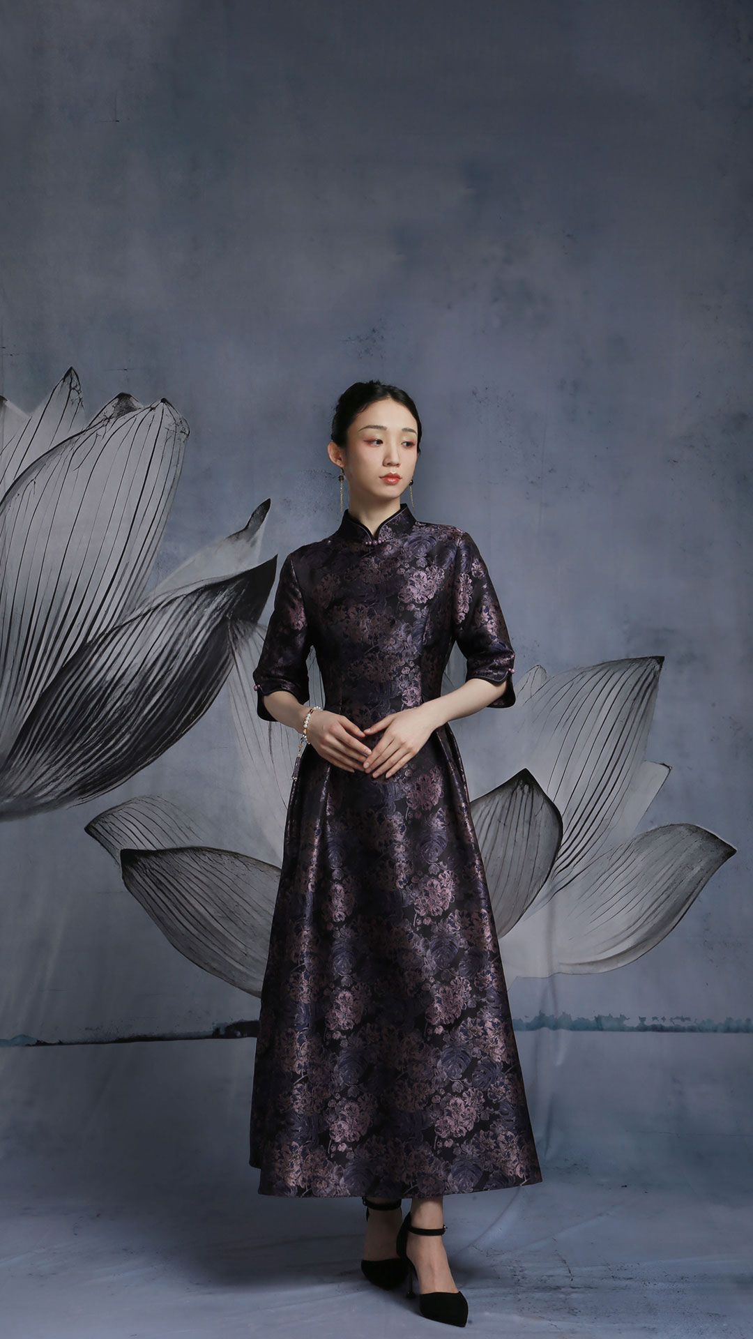 吉祥衣家新中式国风新款高端气质显瘦修身女装红紫斗芳菲连衣裙