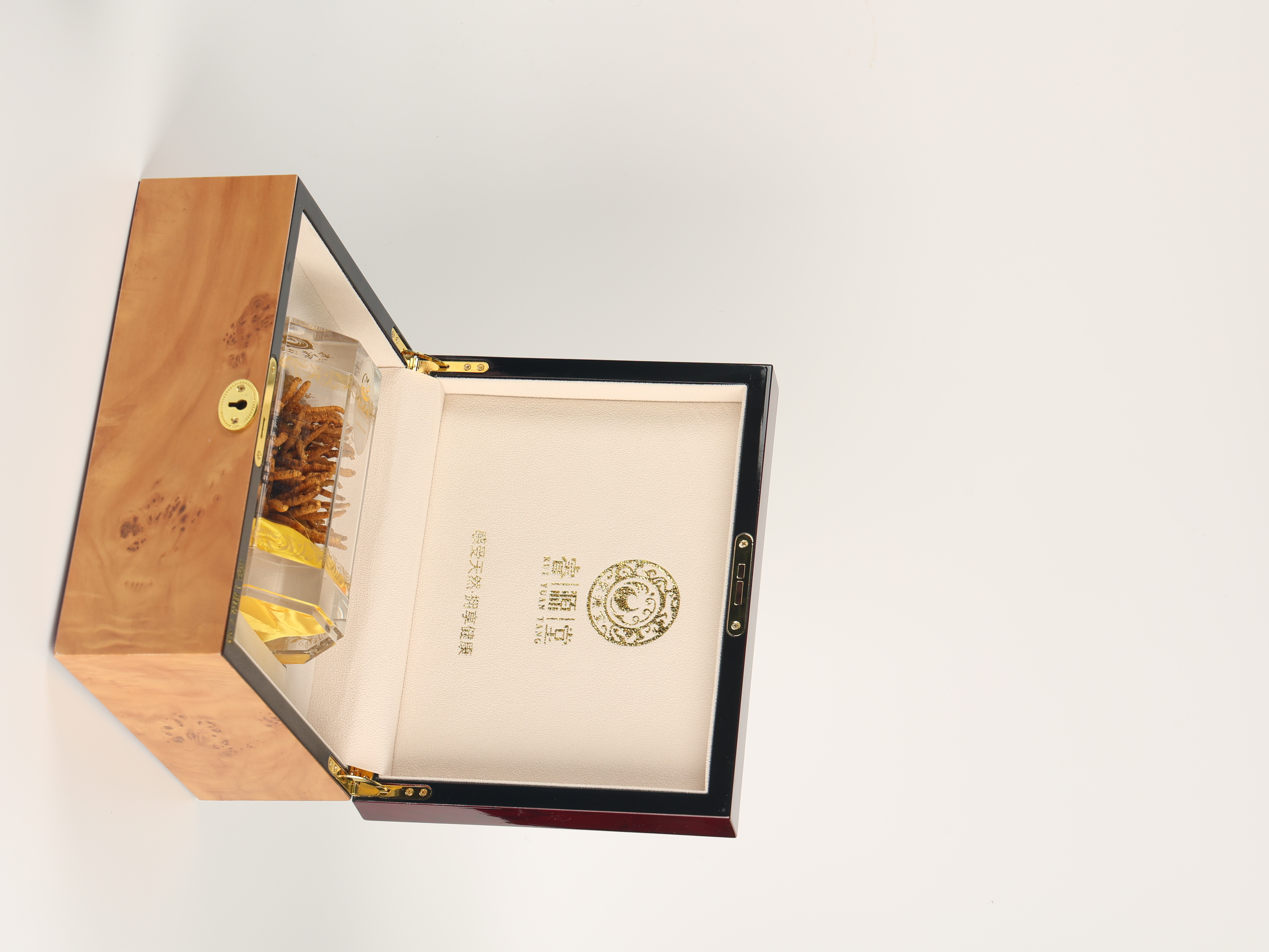 当您选购50g-100g时即可搭配高端大气的礼盒噢~流畅的花梨木纹礼盒,内配高透明度八棱瓶,让每一根冬虫夏草更显高贵