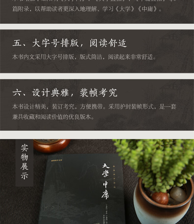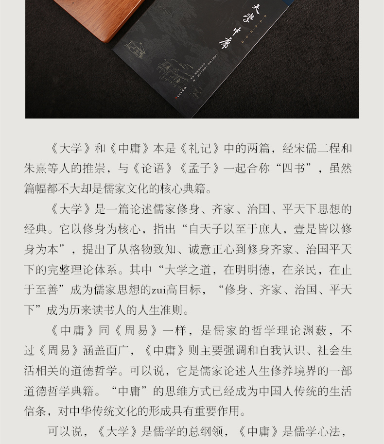 《中庸》原是《礼记》中的一篇,全篇以"中庸"作为超高的道德准则和自然法律。中庸之道亦被古人称为中道或中和之道。本次出版,为方便现代读者阅读,我们在对原文进行精心校对的基础上,又进行了详尽的注释和准确流畅的翻译。
