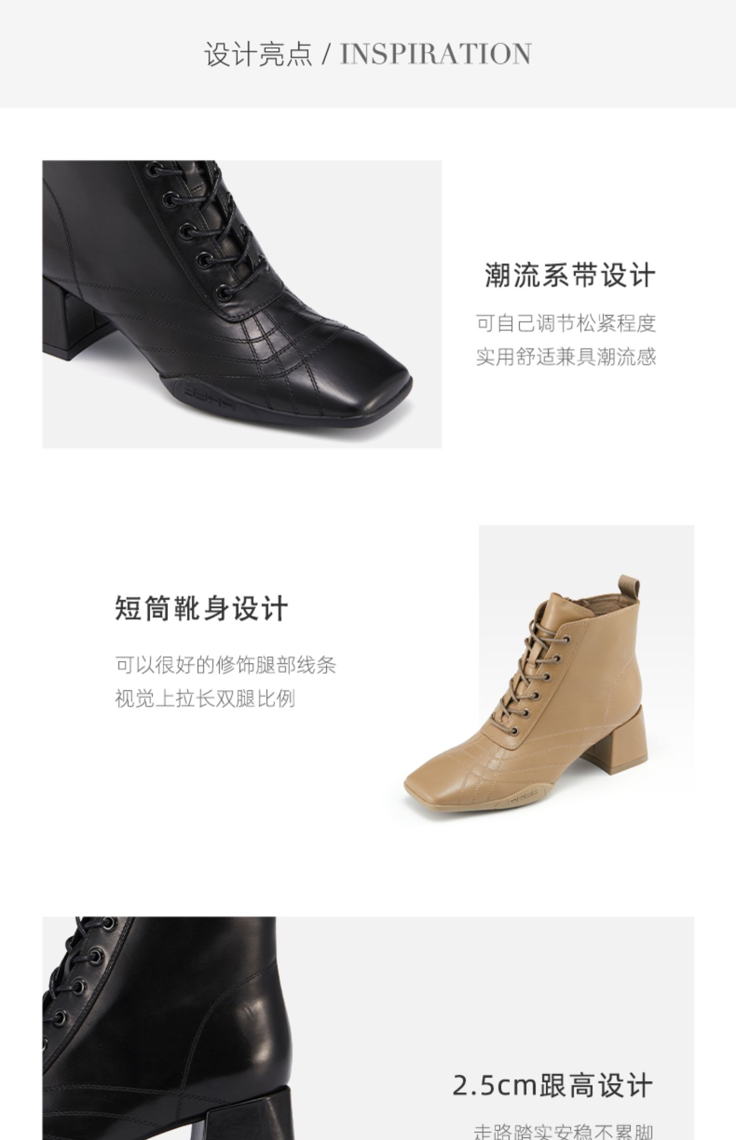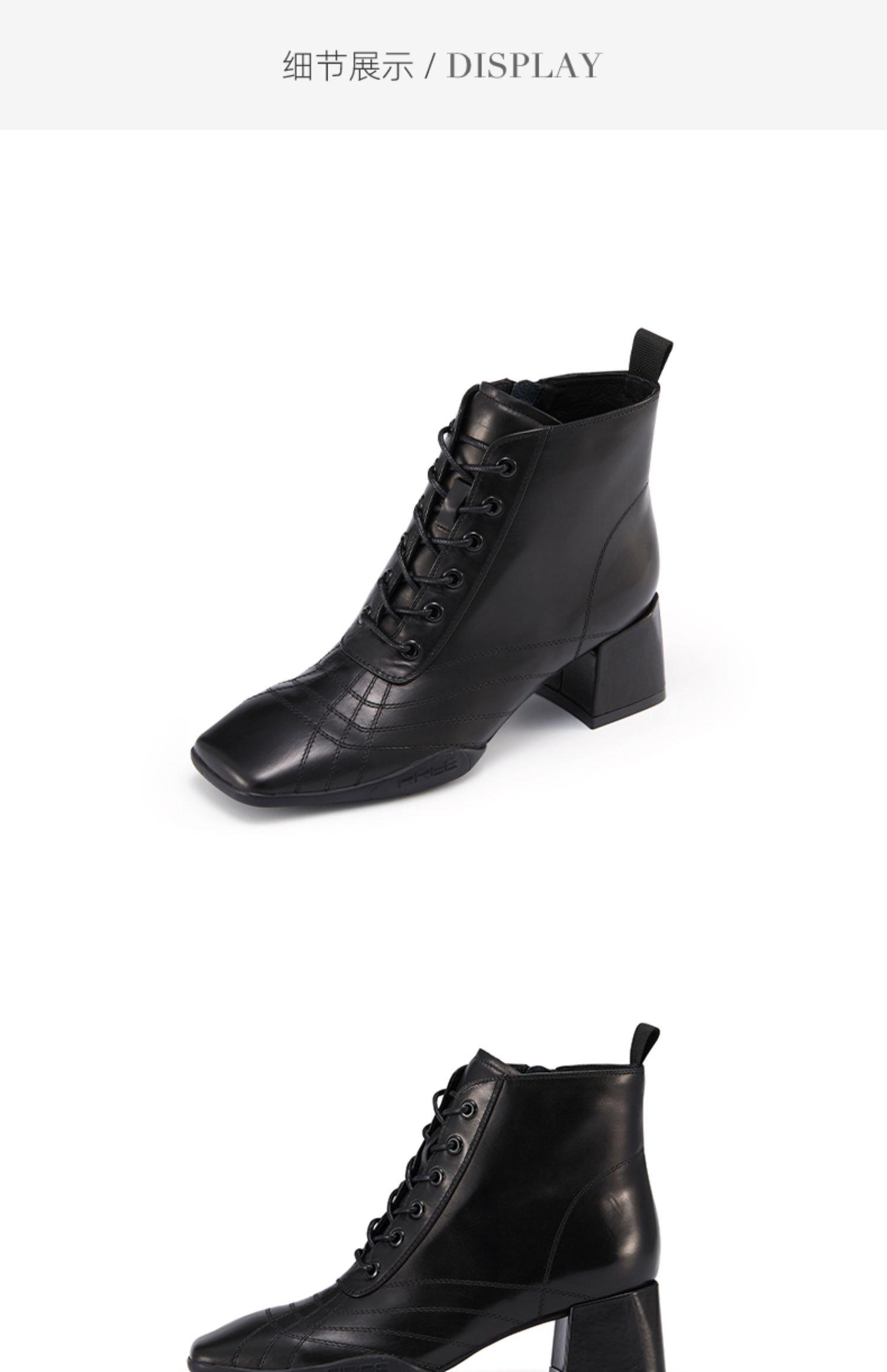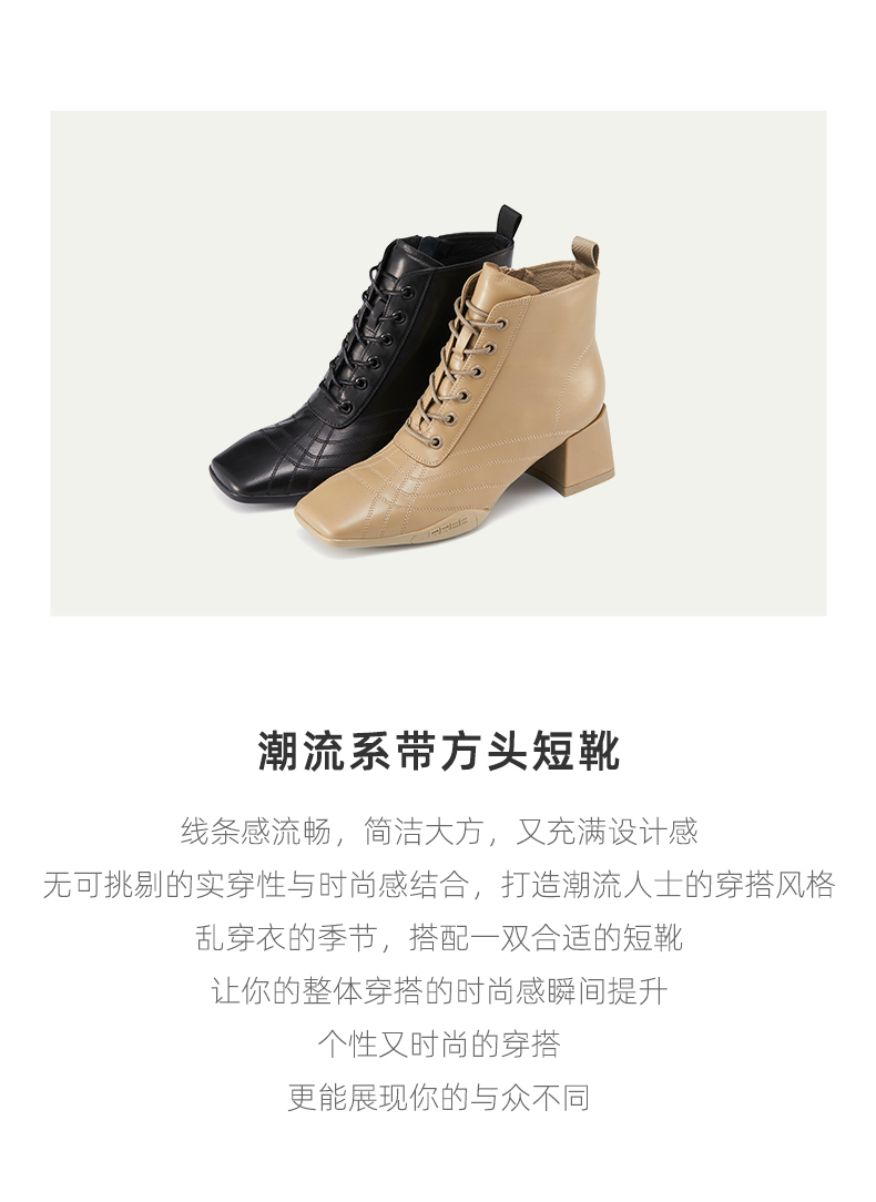 westory2021秋季新款粗跟时装靴系带压纹方头短靴S21DS44621