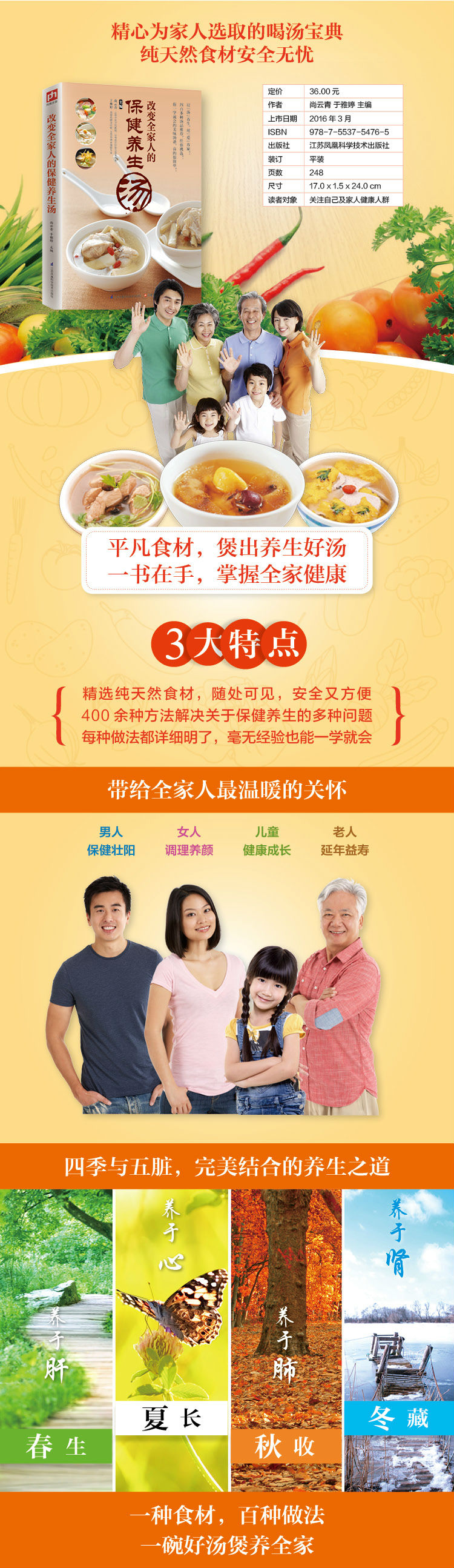 本书根据养生原则与要点,给男人、女人、老人、孩子量身定制了功效不同的健康汤品,并结合四季养生、五脏保健,有针对性地选择营养汤品,图文并茂地进行讲解,给您全家带来简约而不简单的健康养生之路。