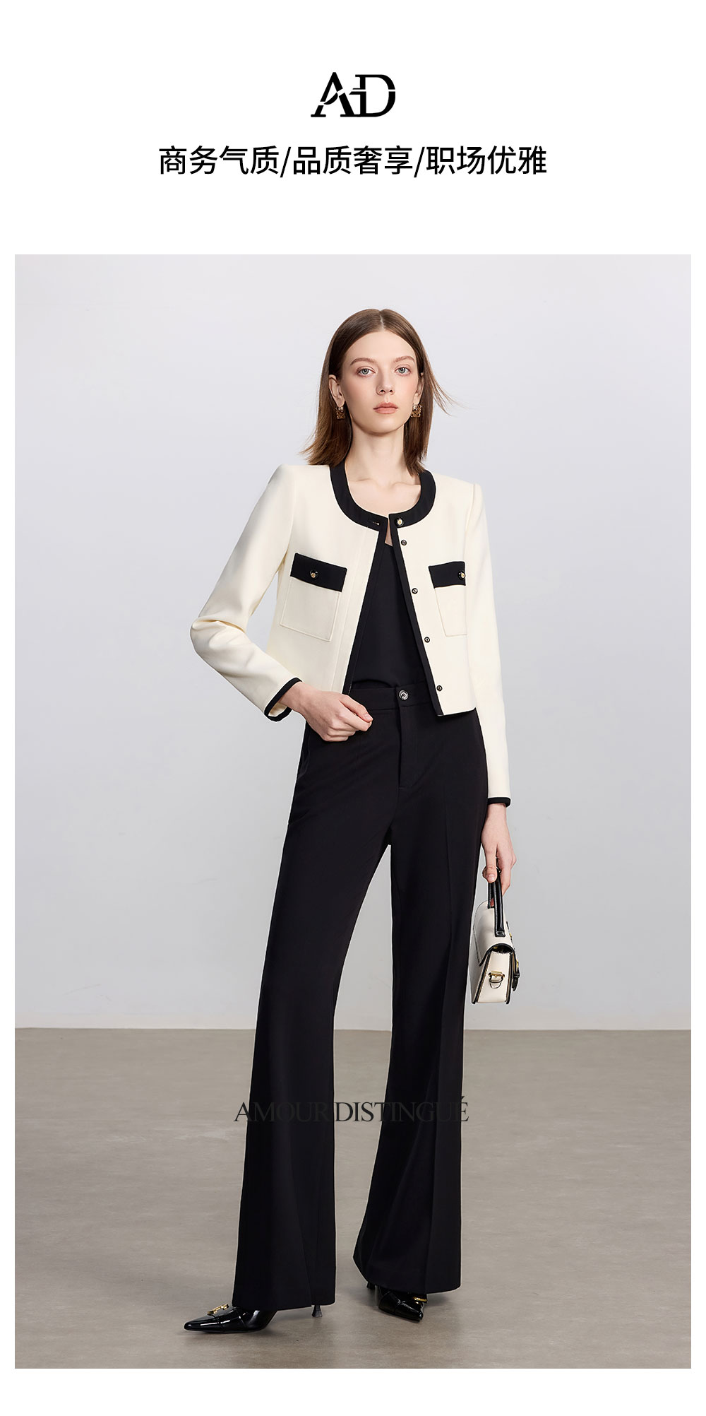 IWY/高端干练通勤西装套装女新款秋气质米白色长袖圆领小香风外套C2358+P2357
