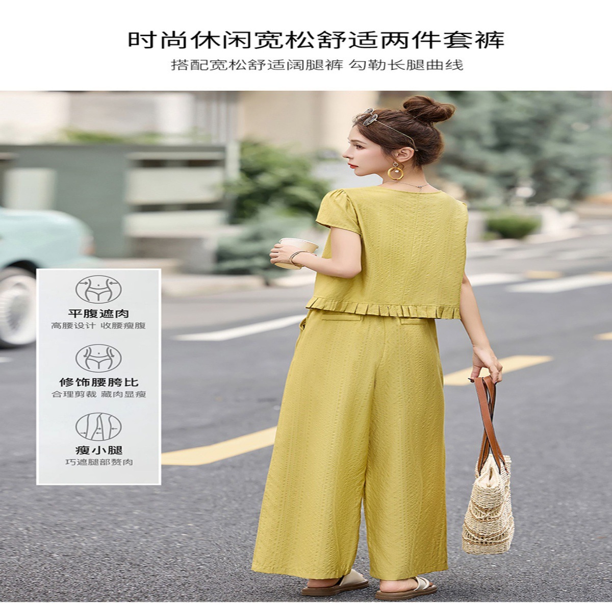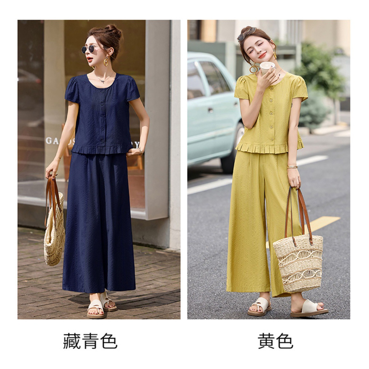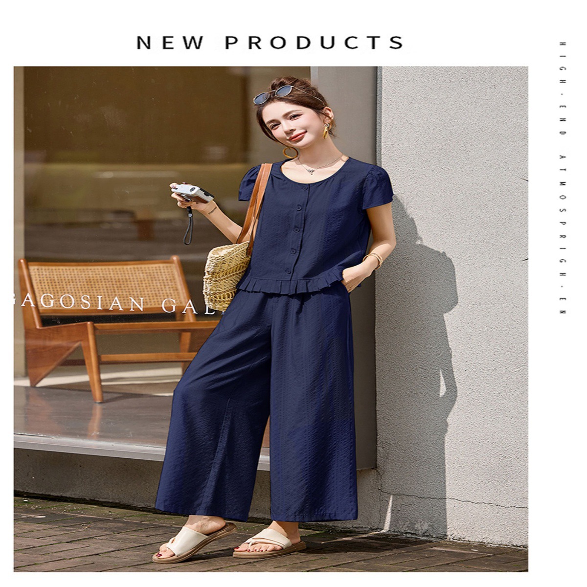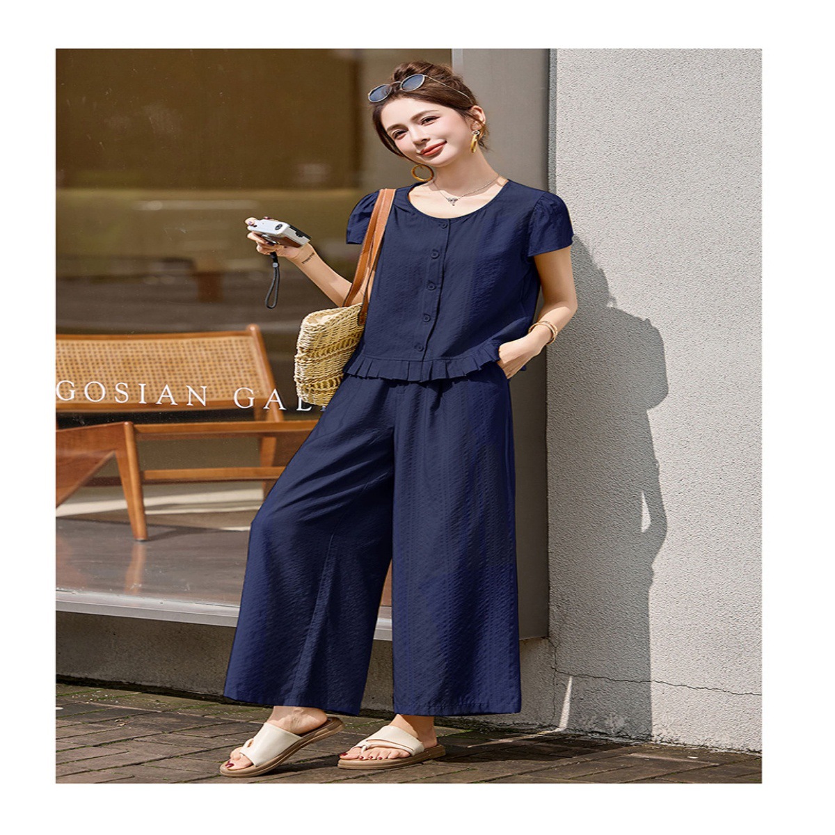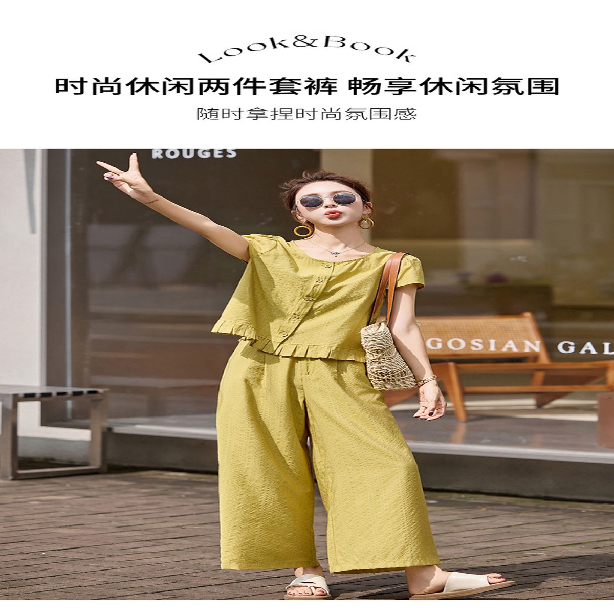 时尚通勤套装女2025夏季新款韩系圆领木耳边拼接衬衫阔腿裤两件套LNS9763