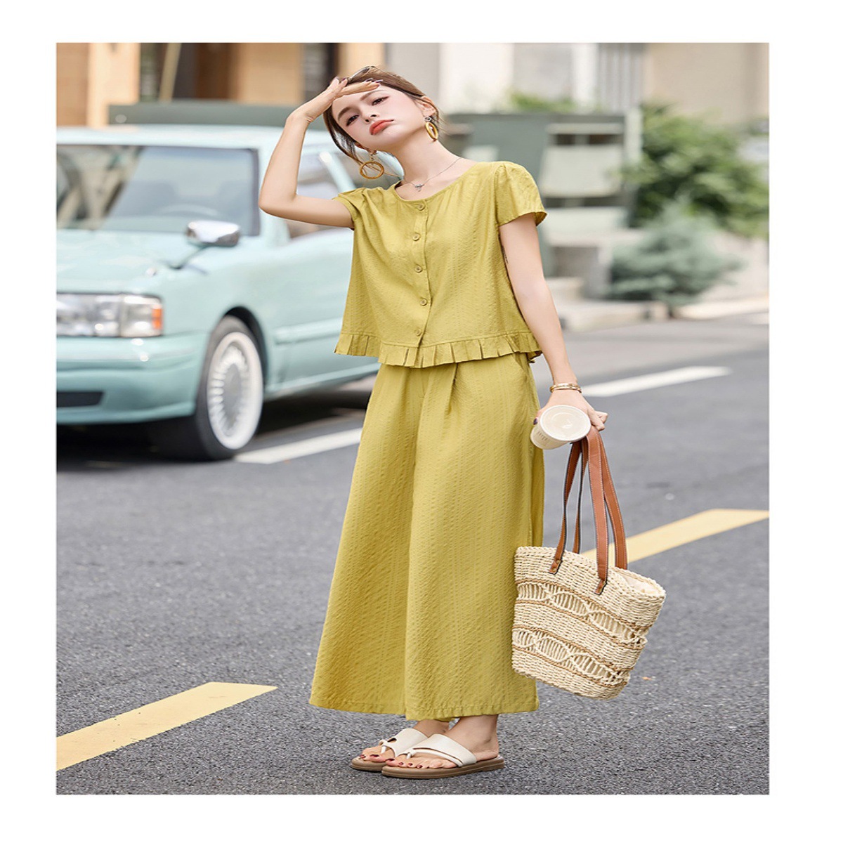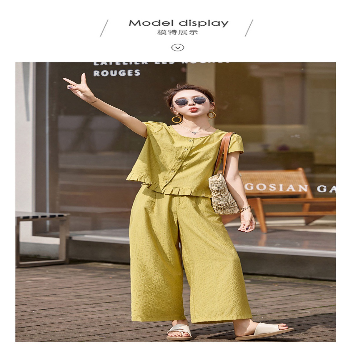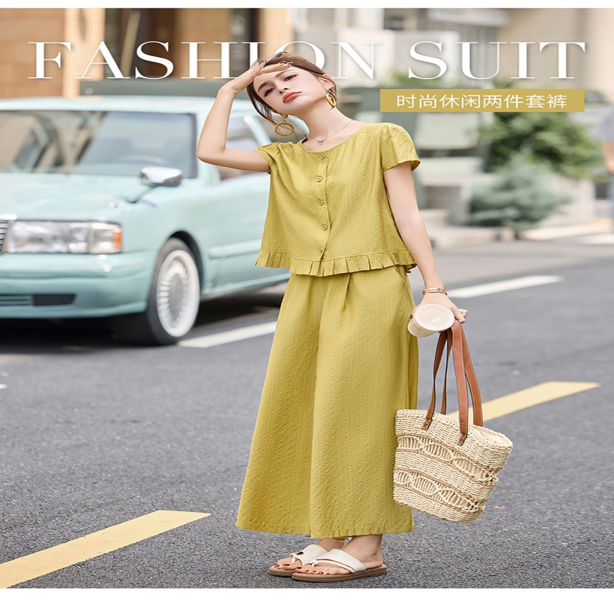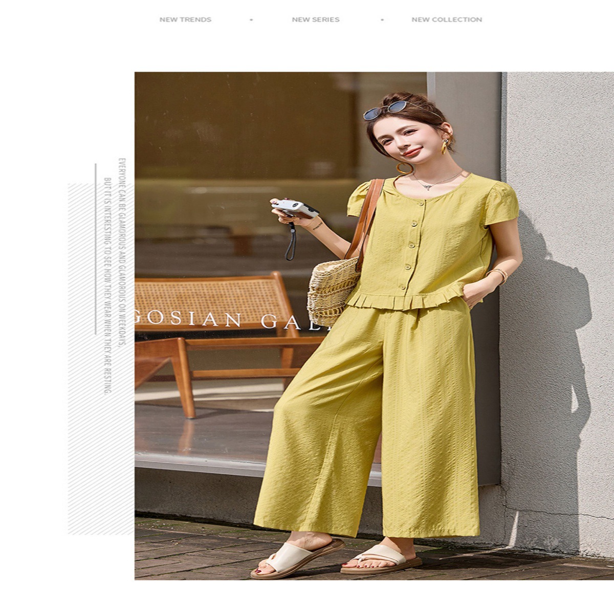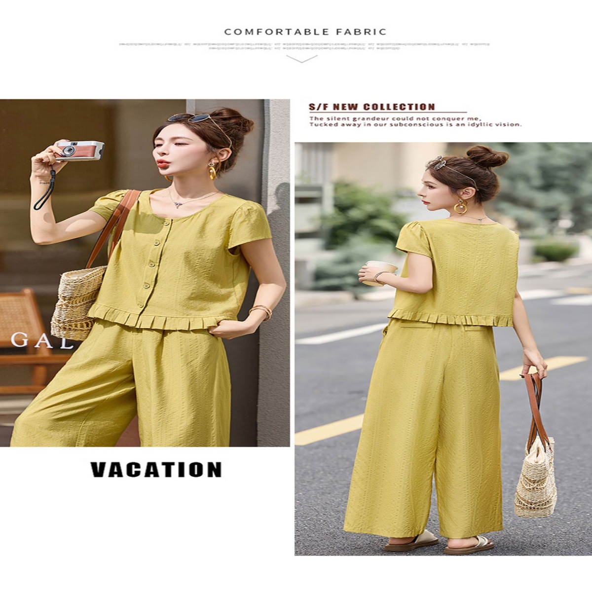 时尚通勤套装女2025夏季新款韩系圆领木耳边拼接衬衫阔腿裤两件套LNS9763