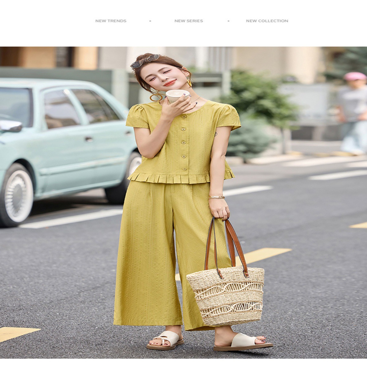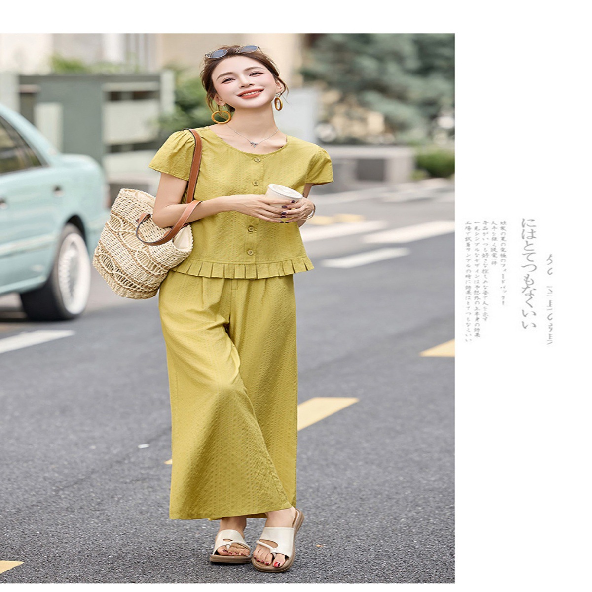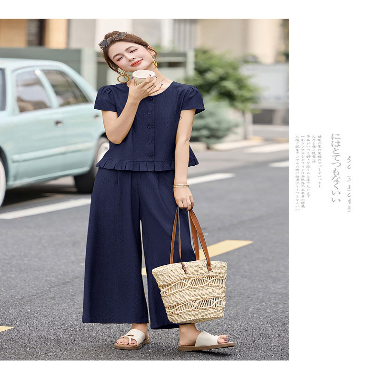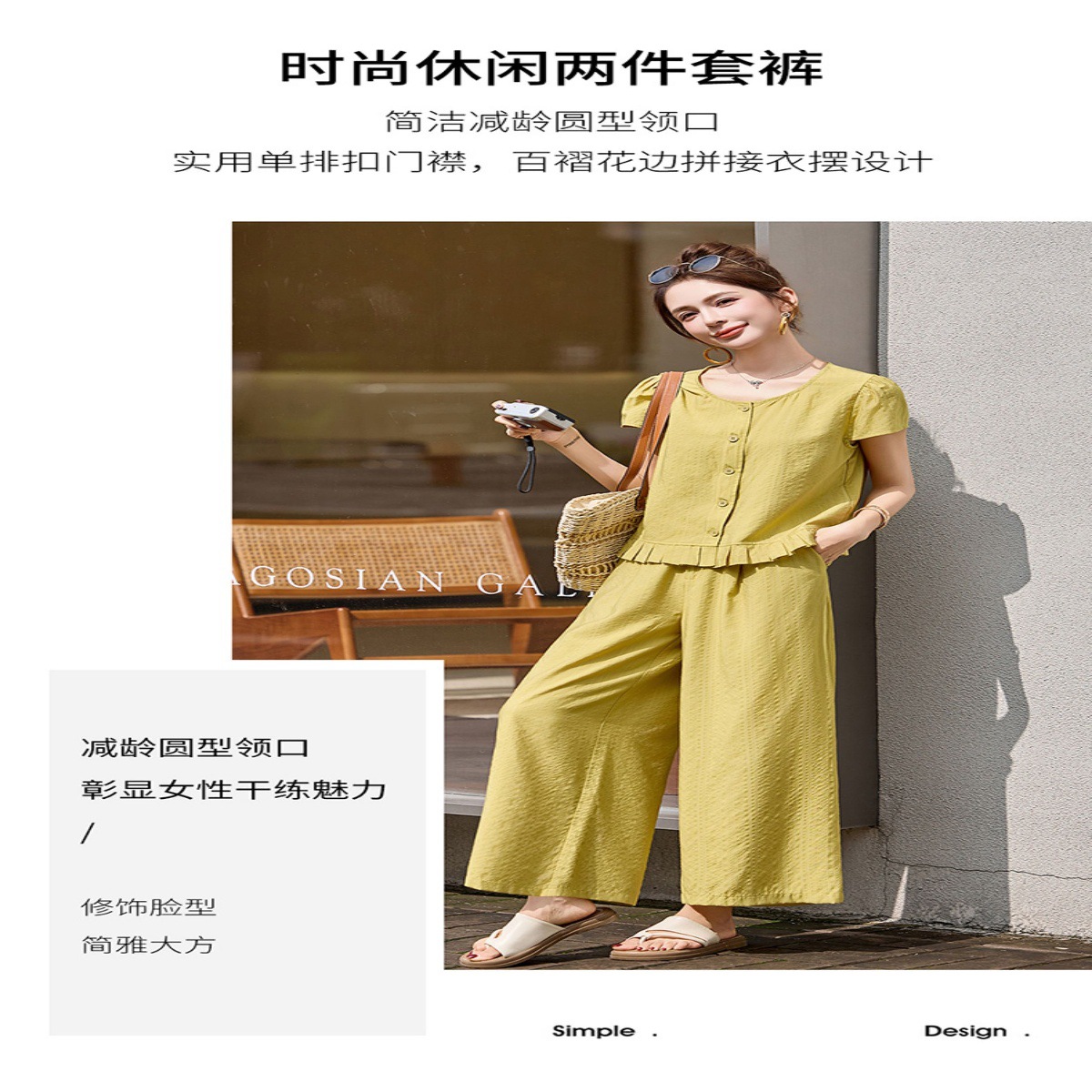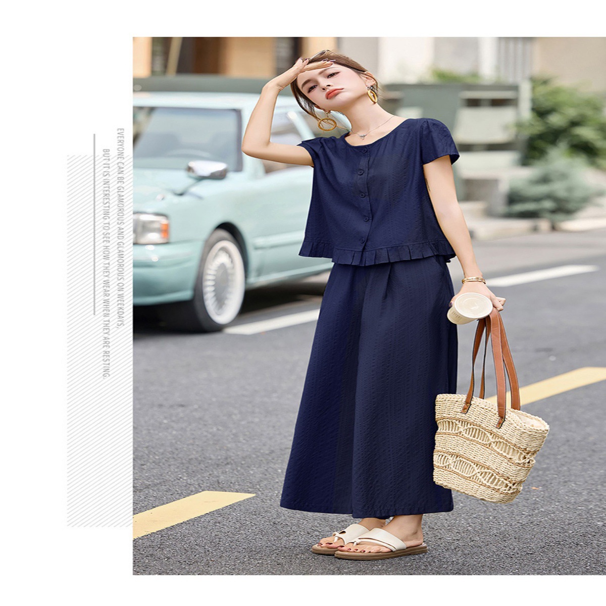 时尚通勤套装女2025夏季新款韩系圆领木耳边拼接衬衫阔腿裤两件套LNS9763