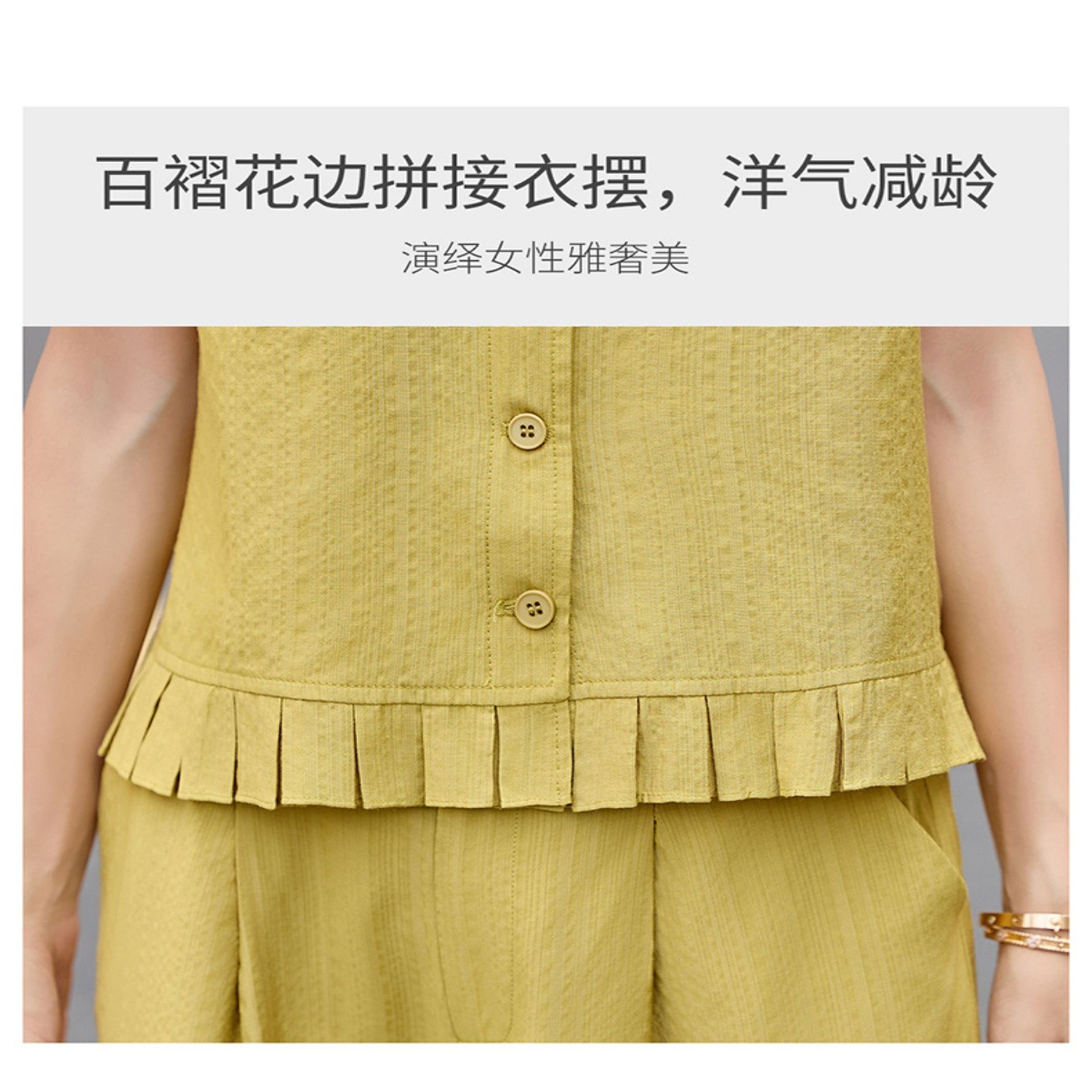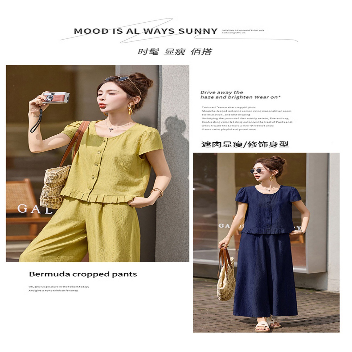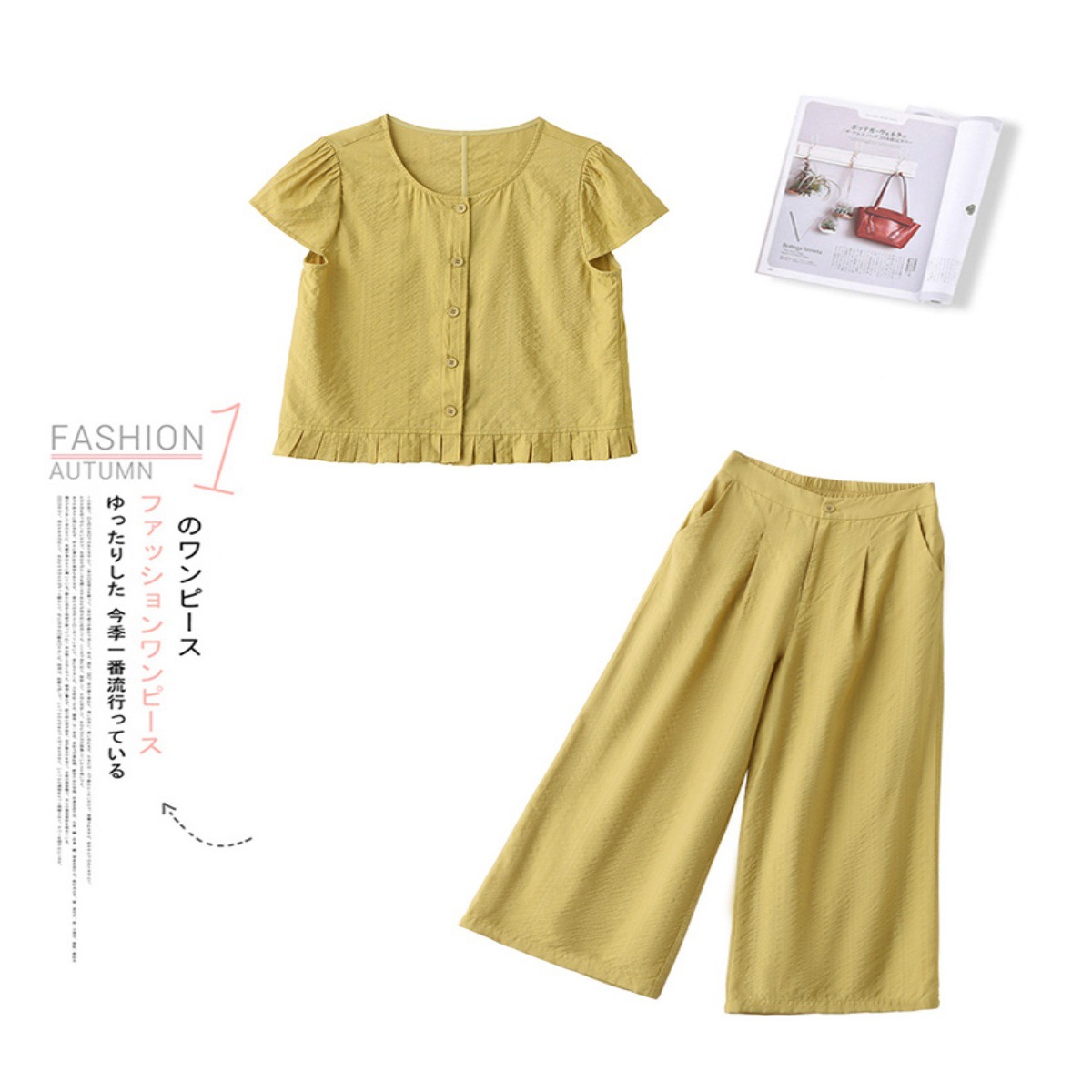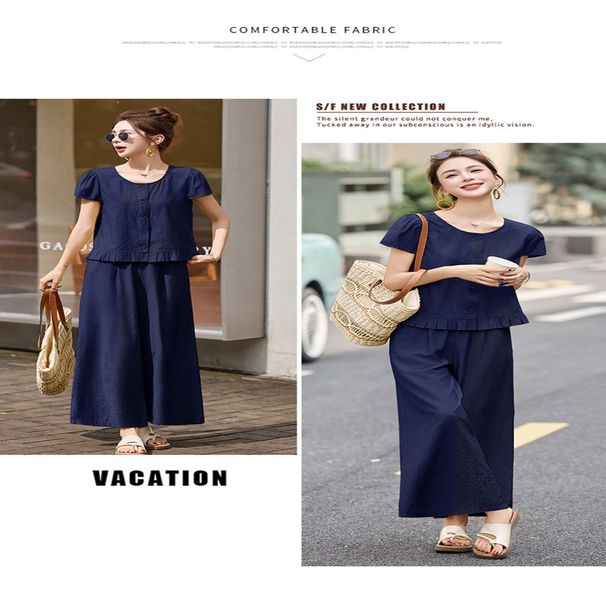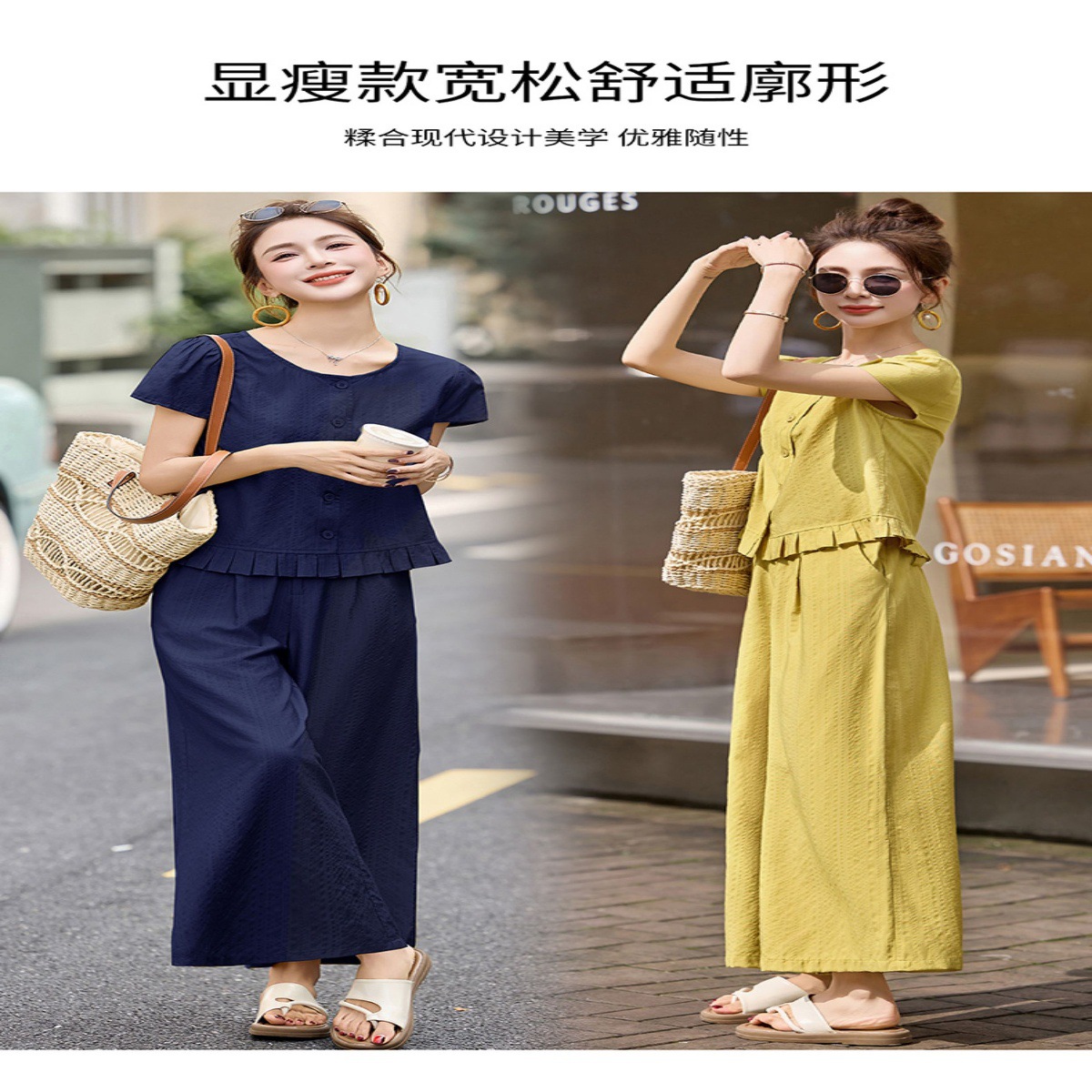 时尚通勤套装女2025夏季新款韩系圆领木耳边拼接衬衫阔腿裤两件套LNS9763