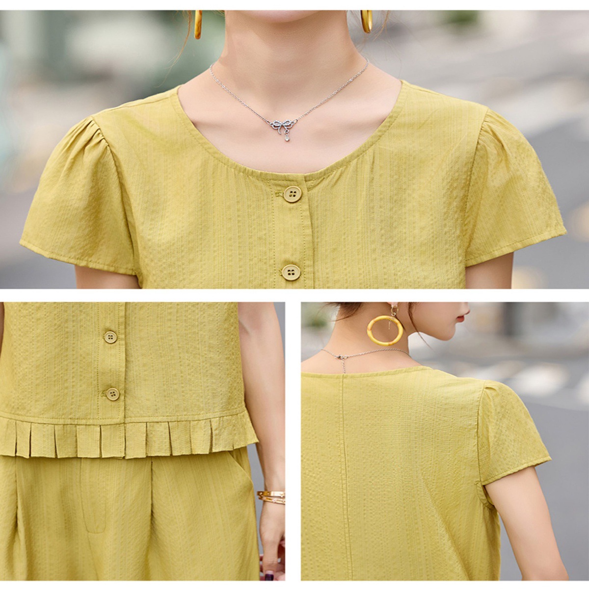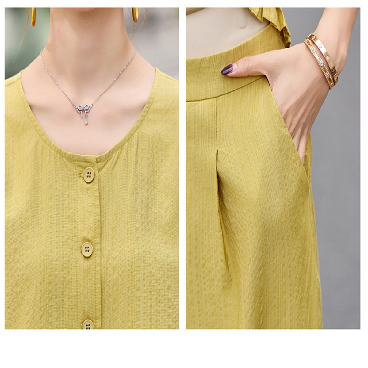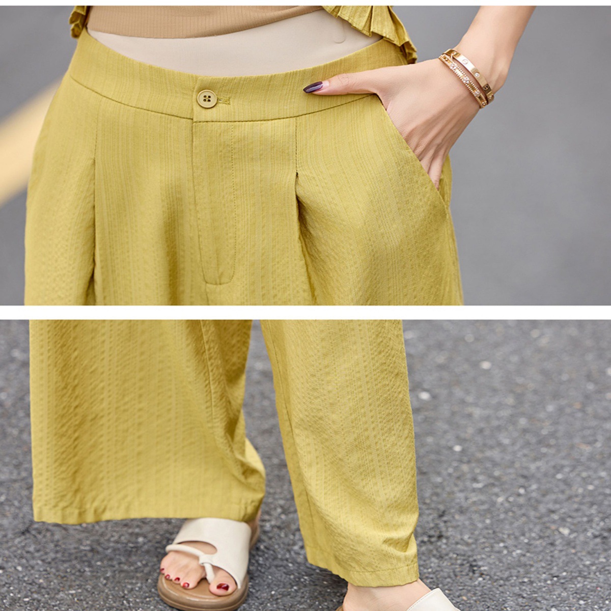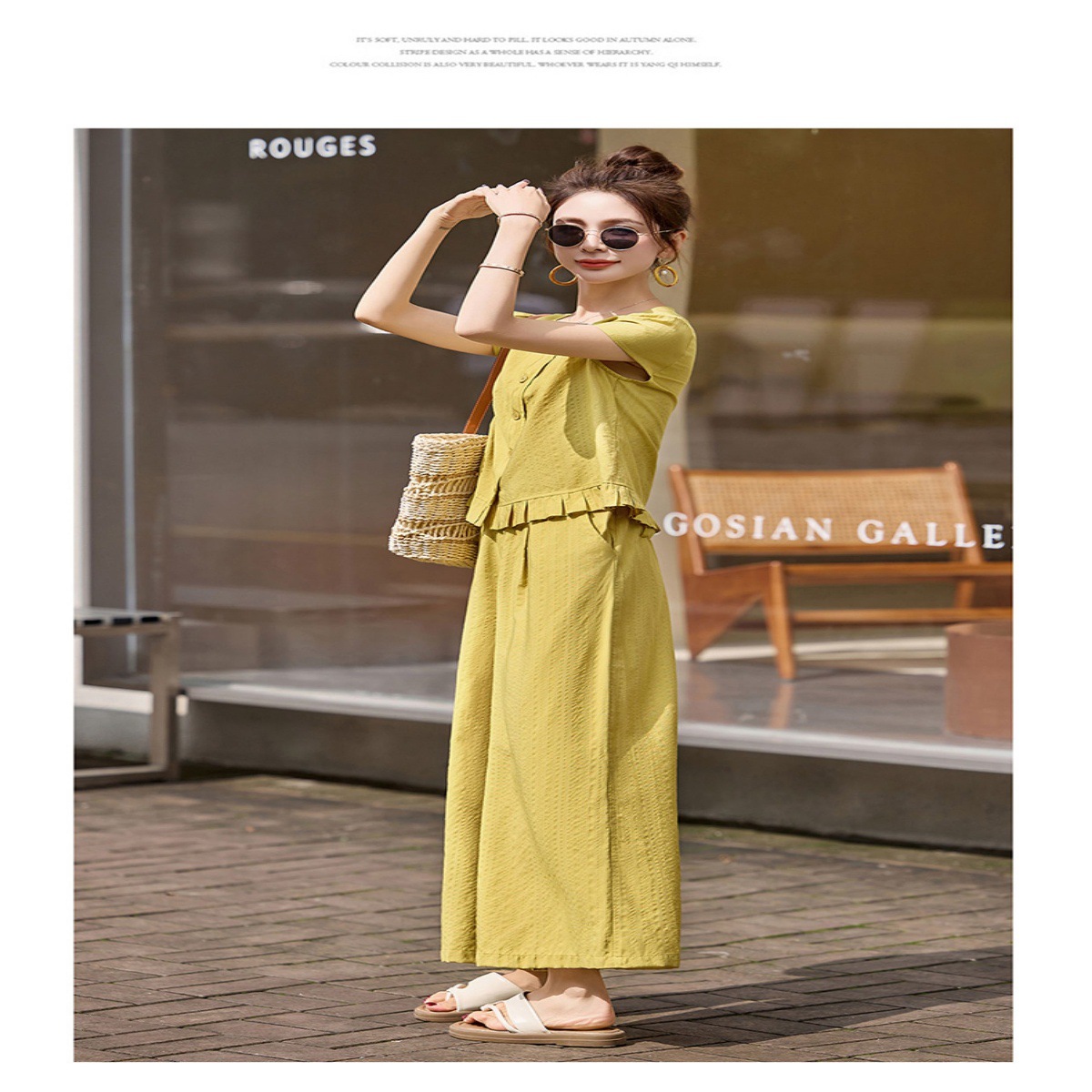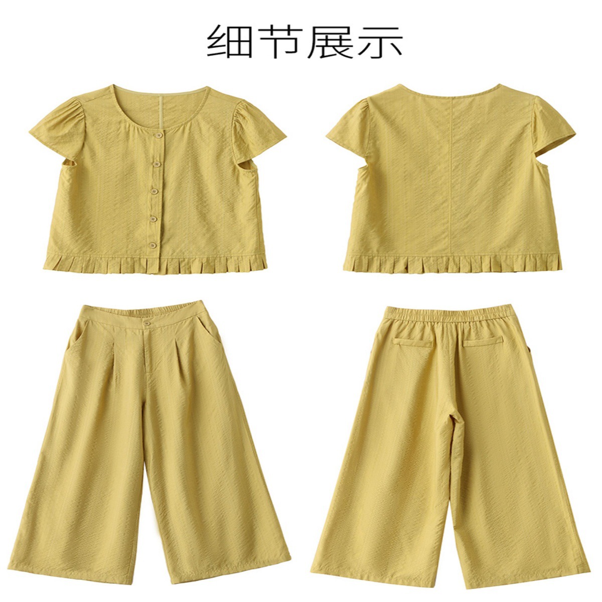 时尚通勤套装女2025夏季新款韩系圆领木耳边拼接衬衫阔腿裤两件套LNS9763