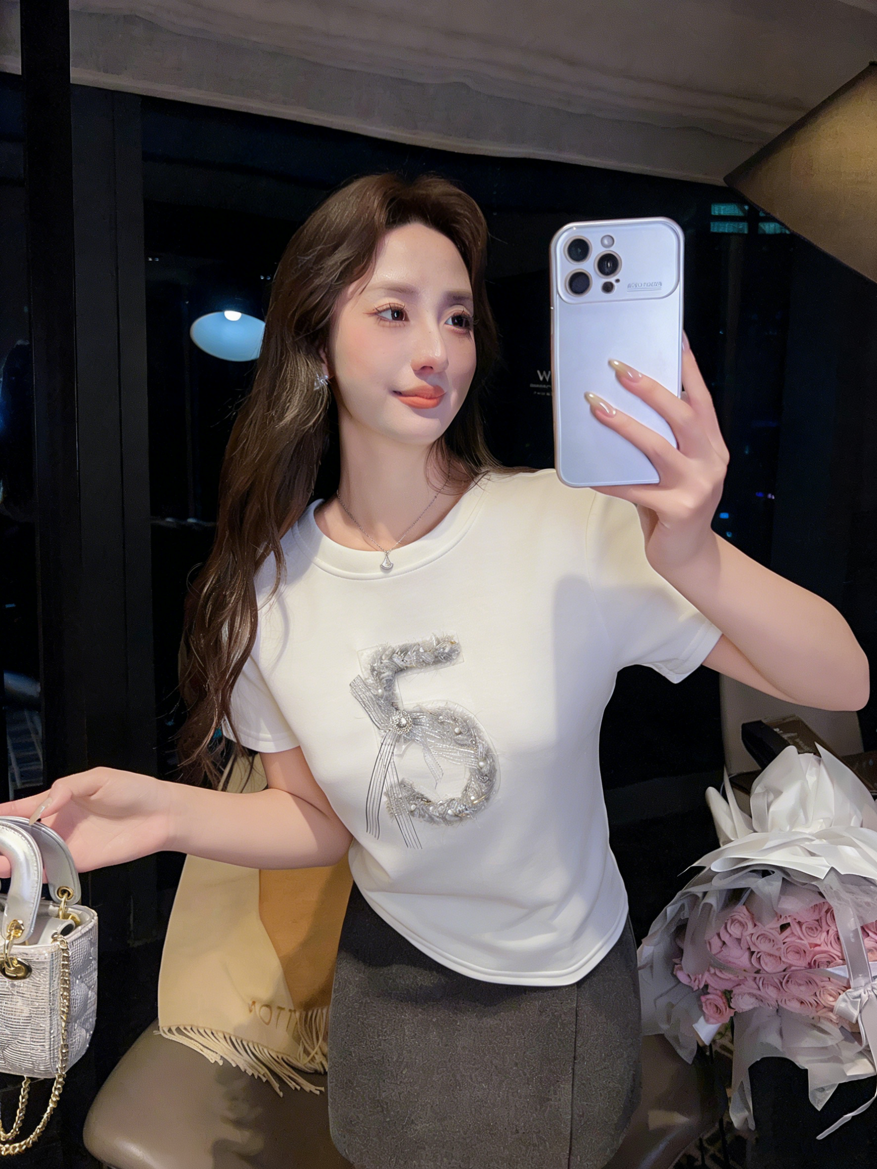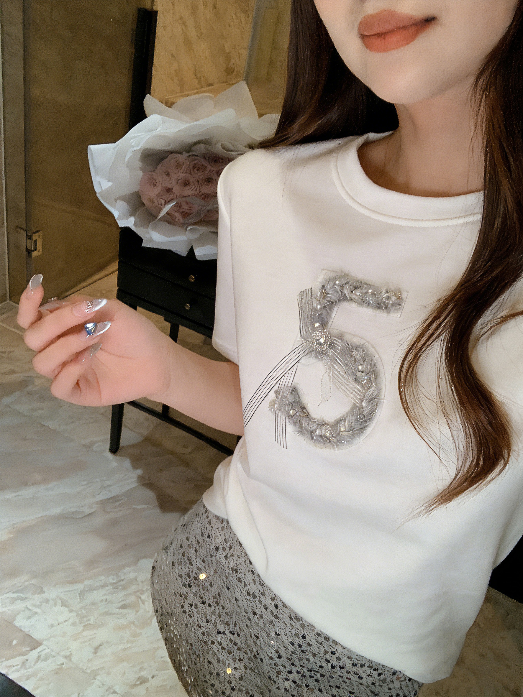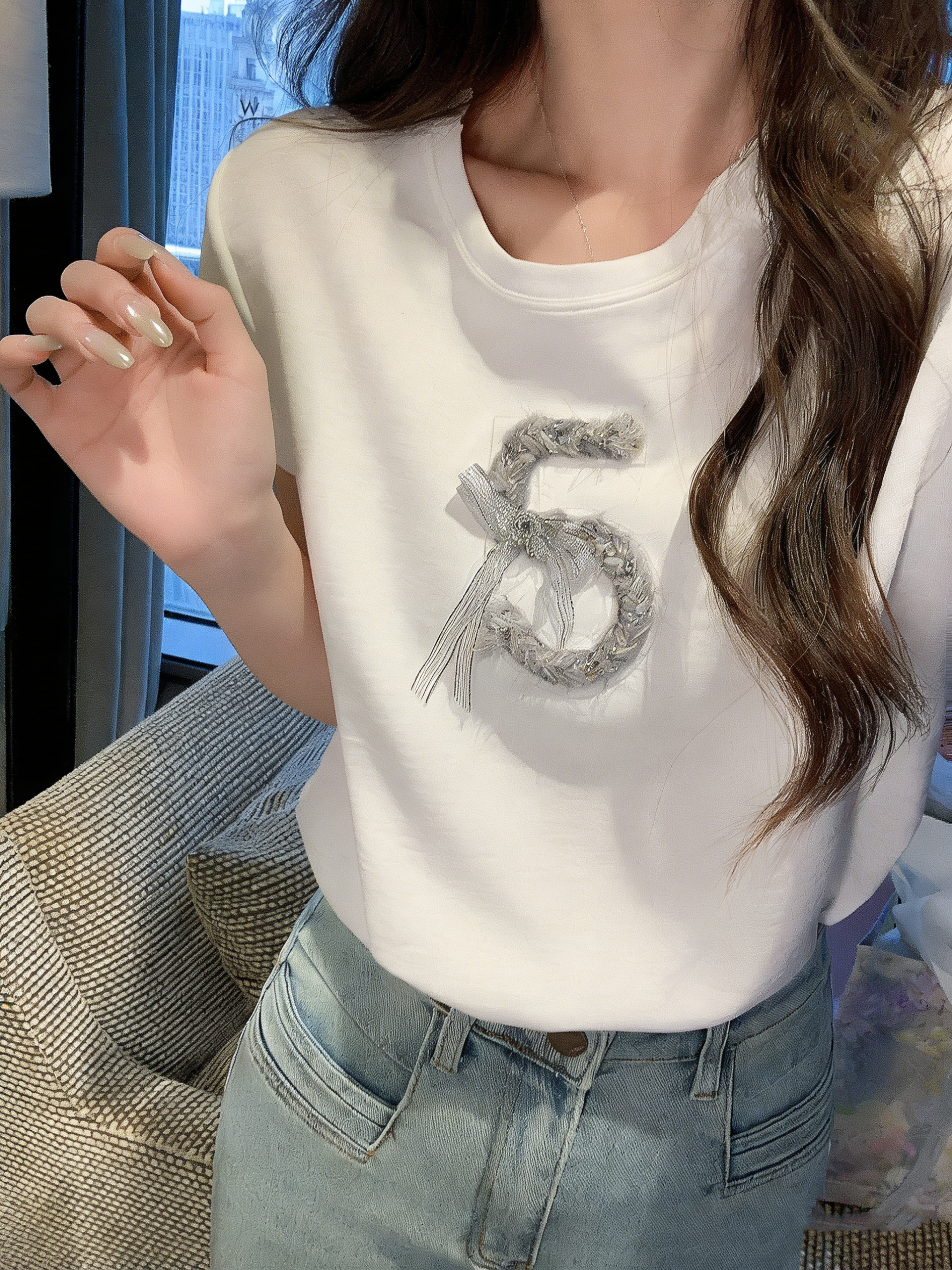 张心子【5号可可白茶】圆领通勤高级感立体数字5号T恤上衣 U2603004
