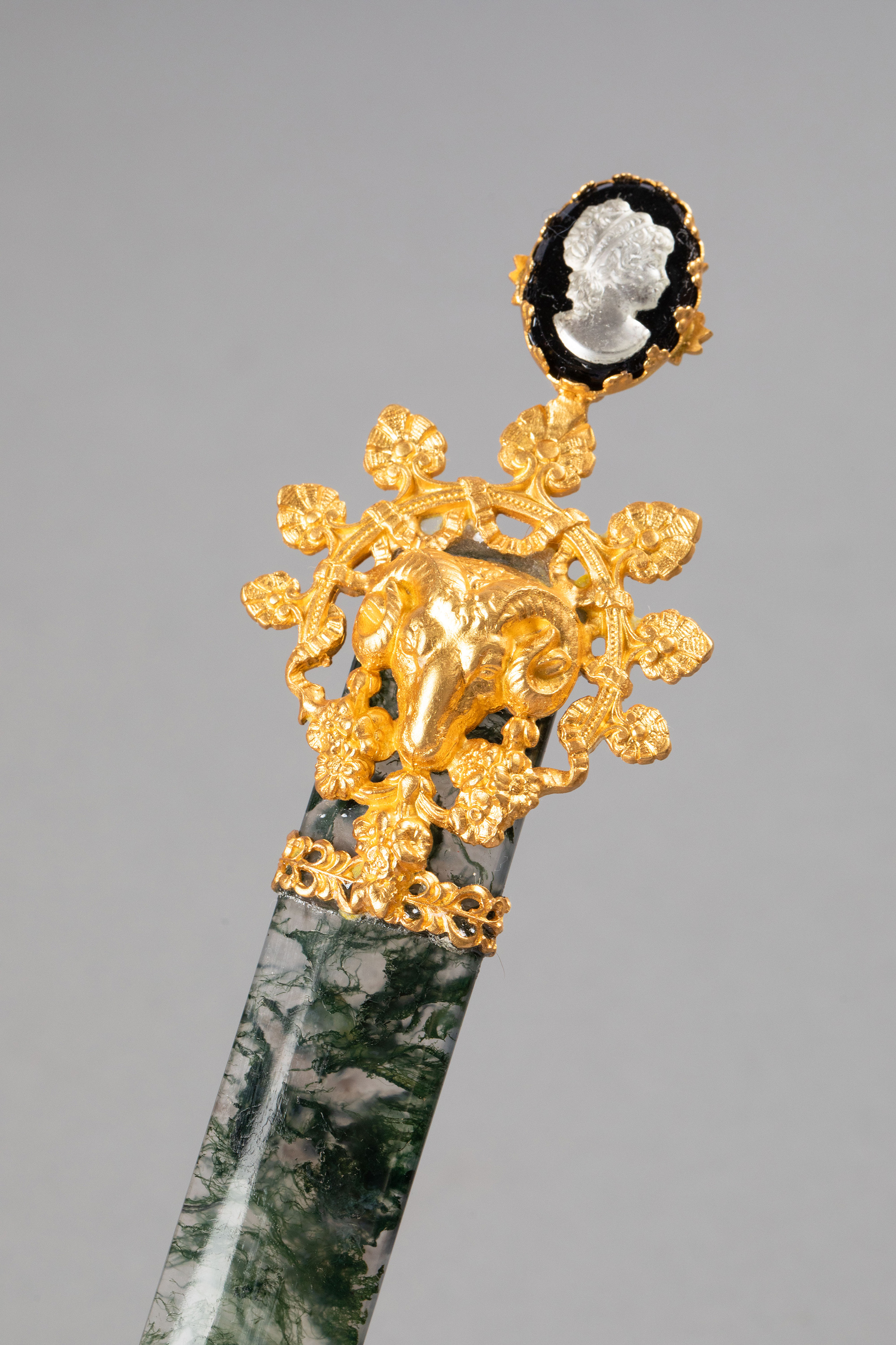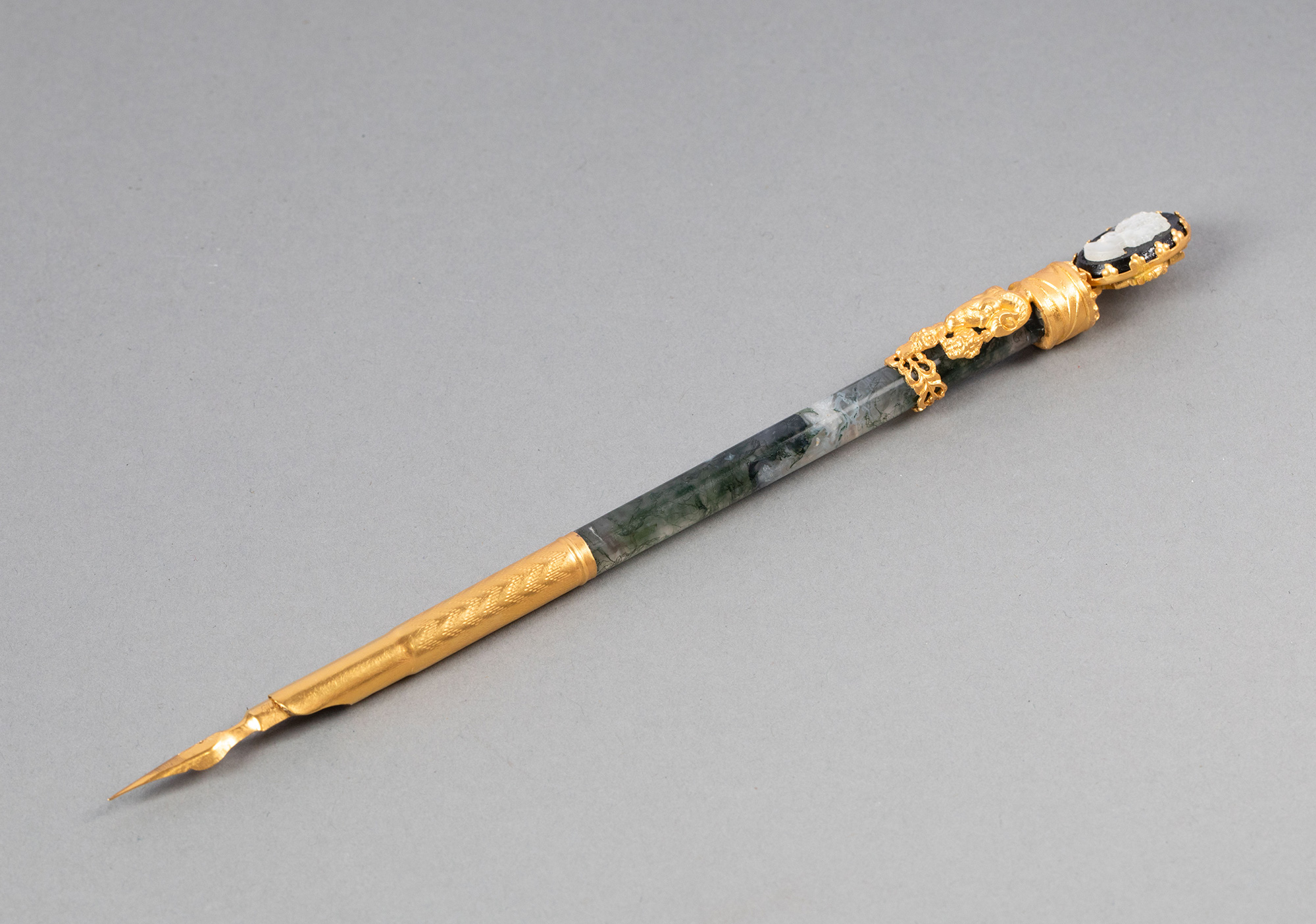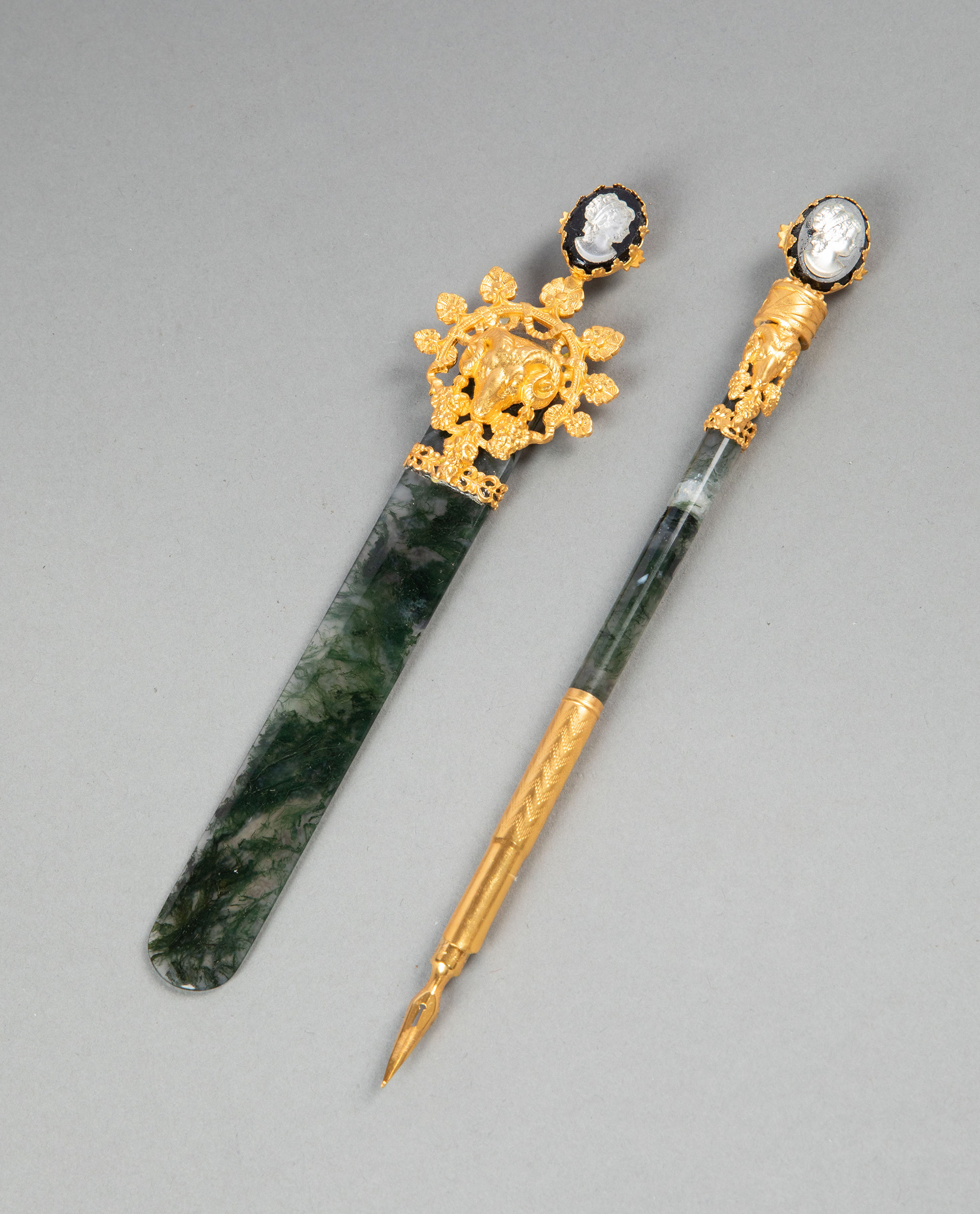 19世纪法国出品羊首主题铜鎏金精雕嵌卡梅奥古典女子肖像浮雕装饰绿色玛瑙翻书杖及蘸水钢笔套件