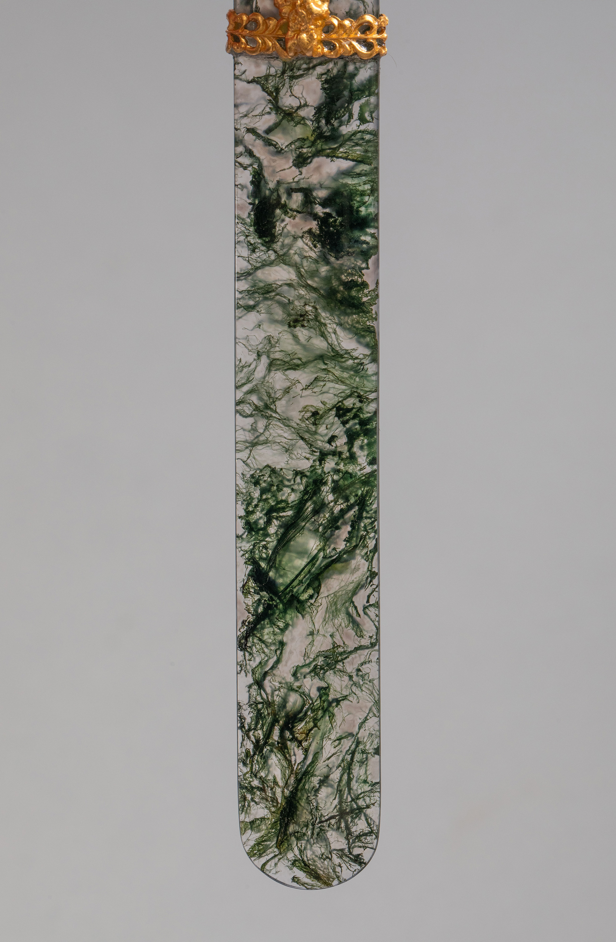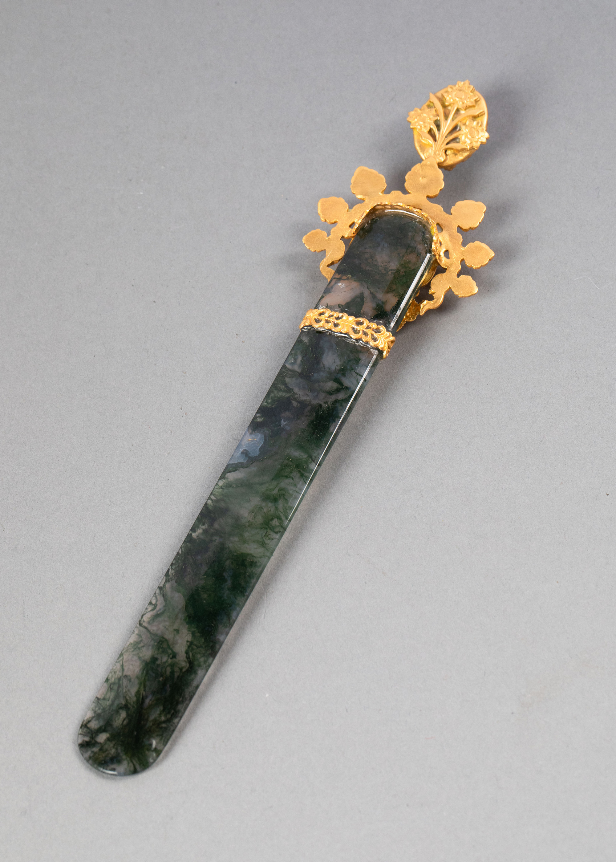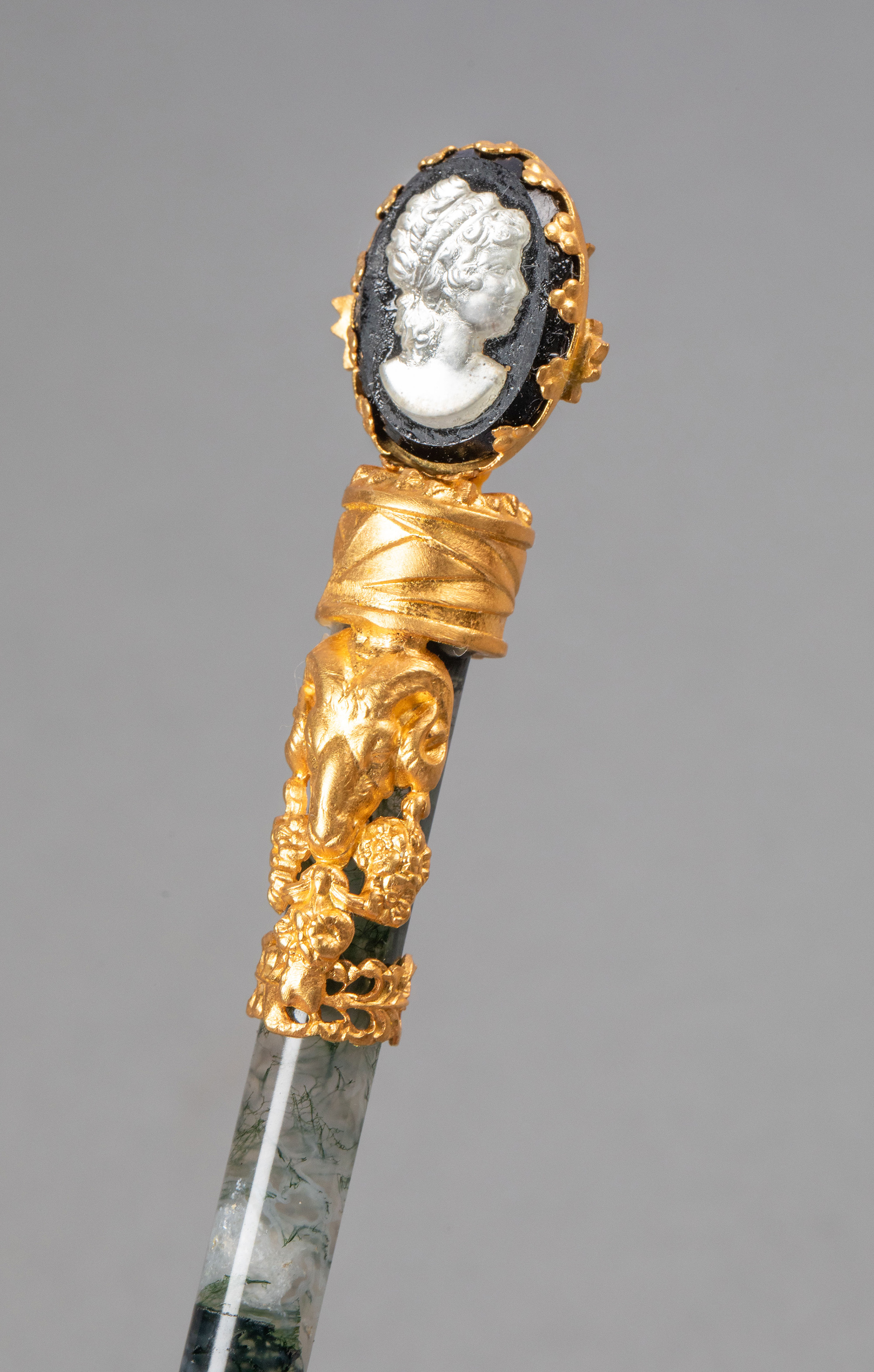 19世纪法国出品羊首主题铜鎏金精雕嵌卡梅奥古典女子肖像浮雕装饰绿色玛瑙翻书杖及蘸水钢笔套件