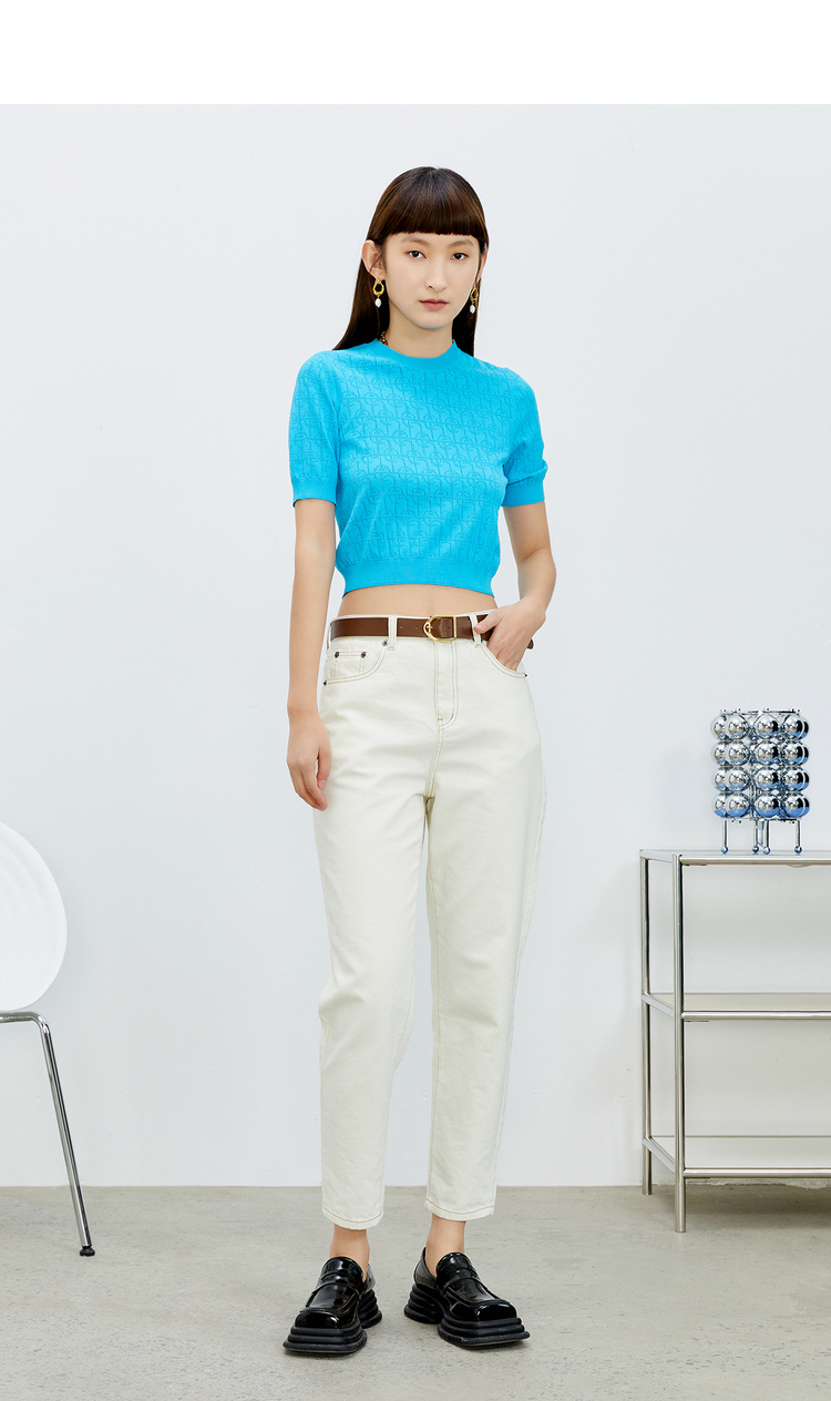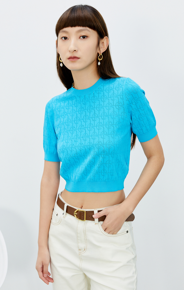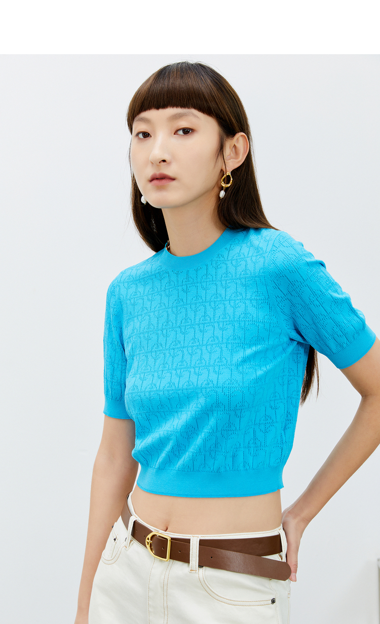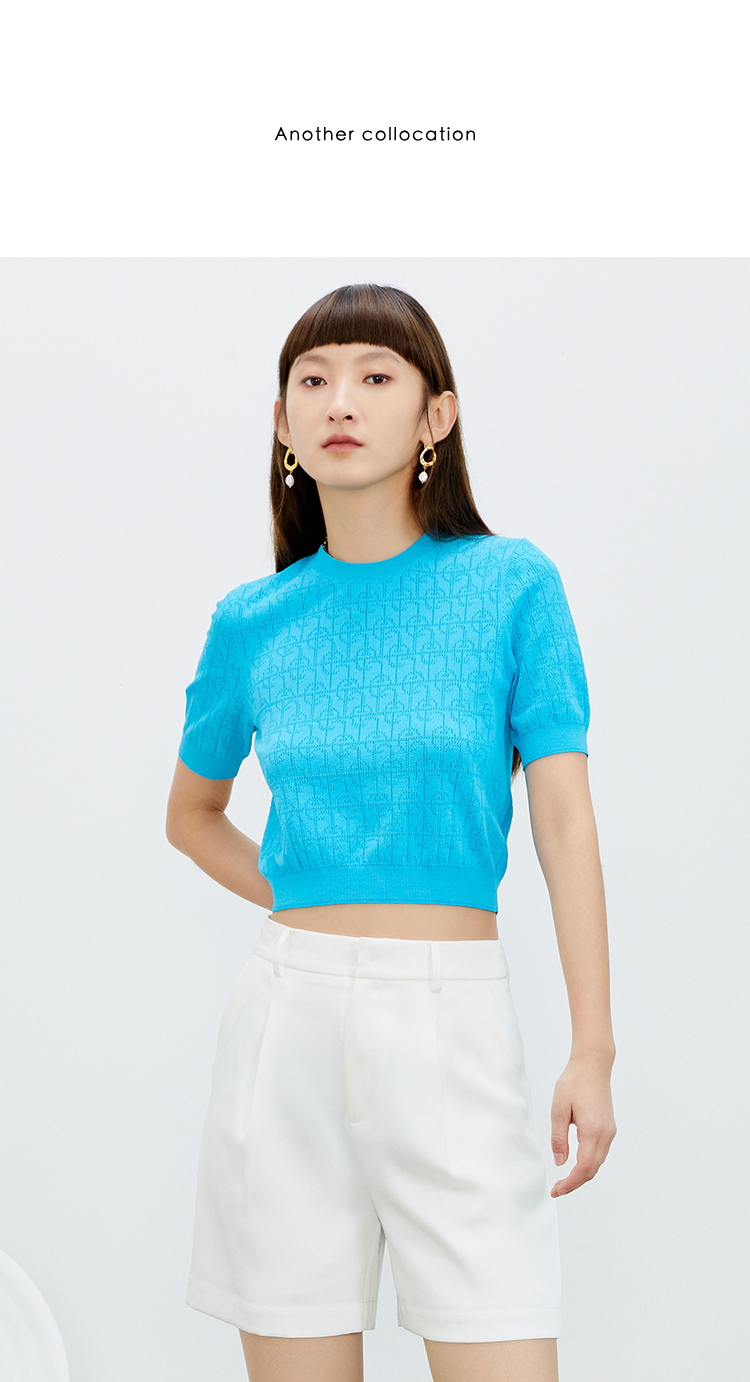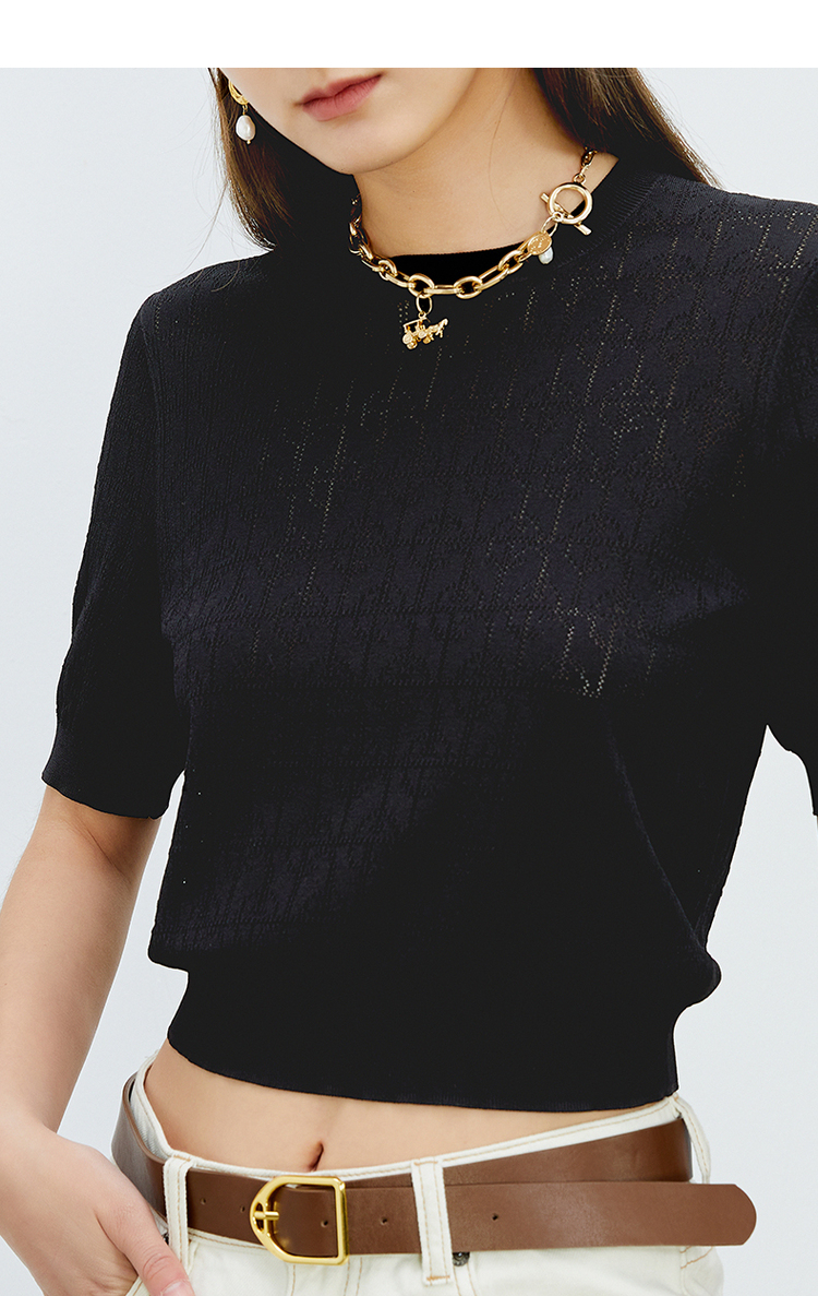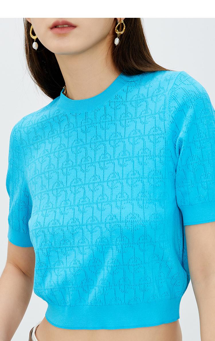 NEELLY纳俪商场同款圆领针织衫女短袖修身套头衫春夏新款短款时尚N22032A01144