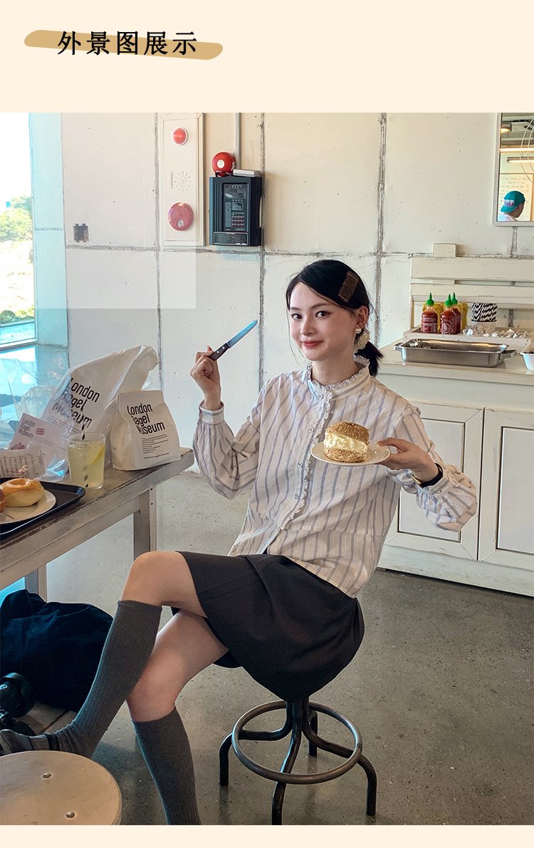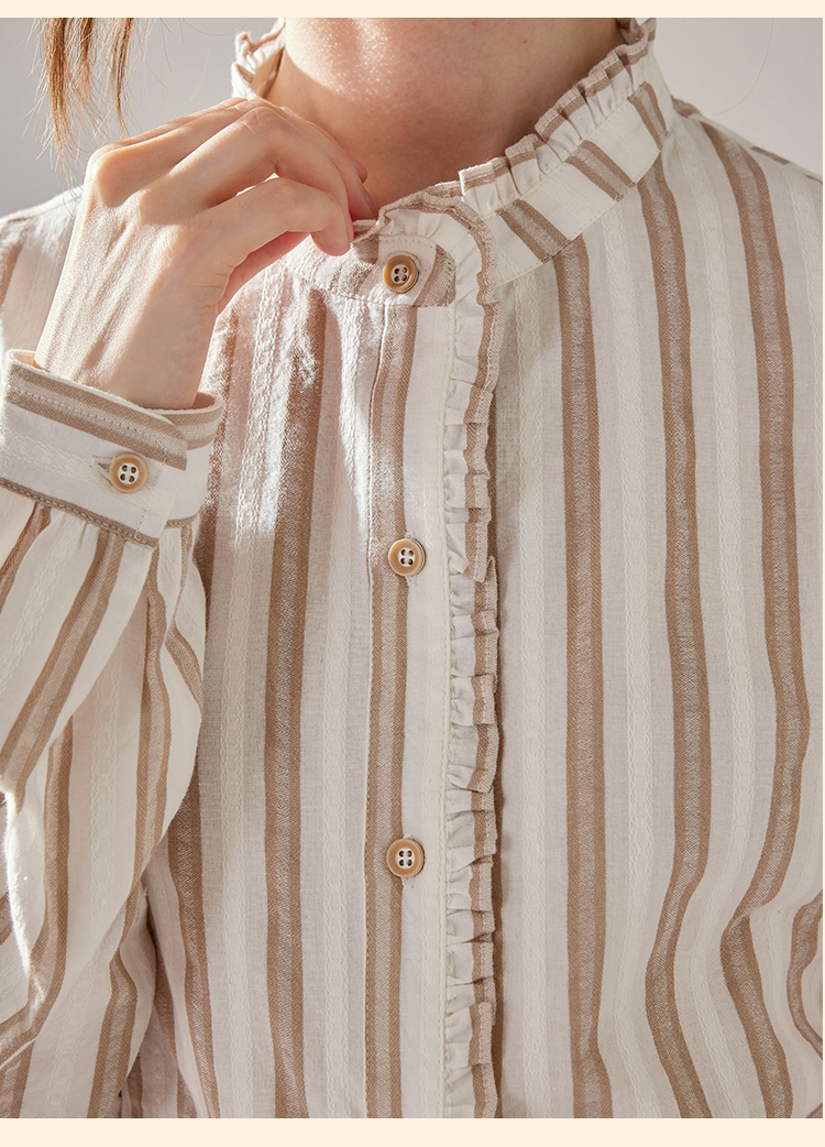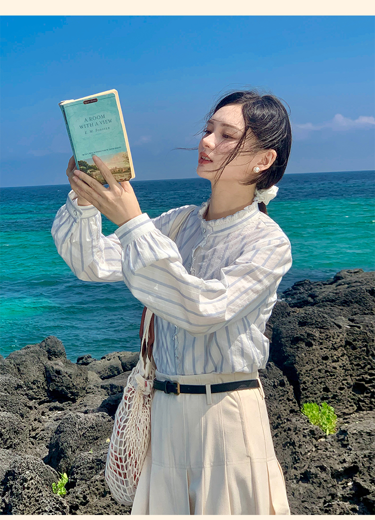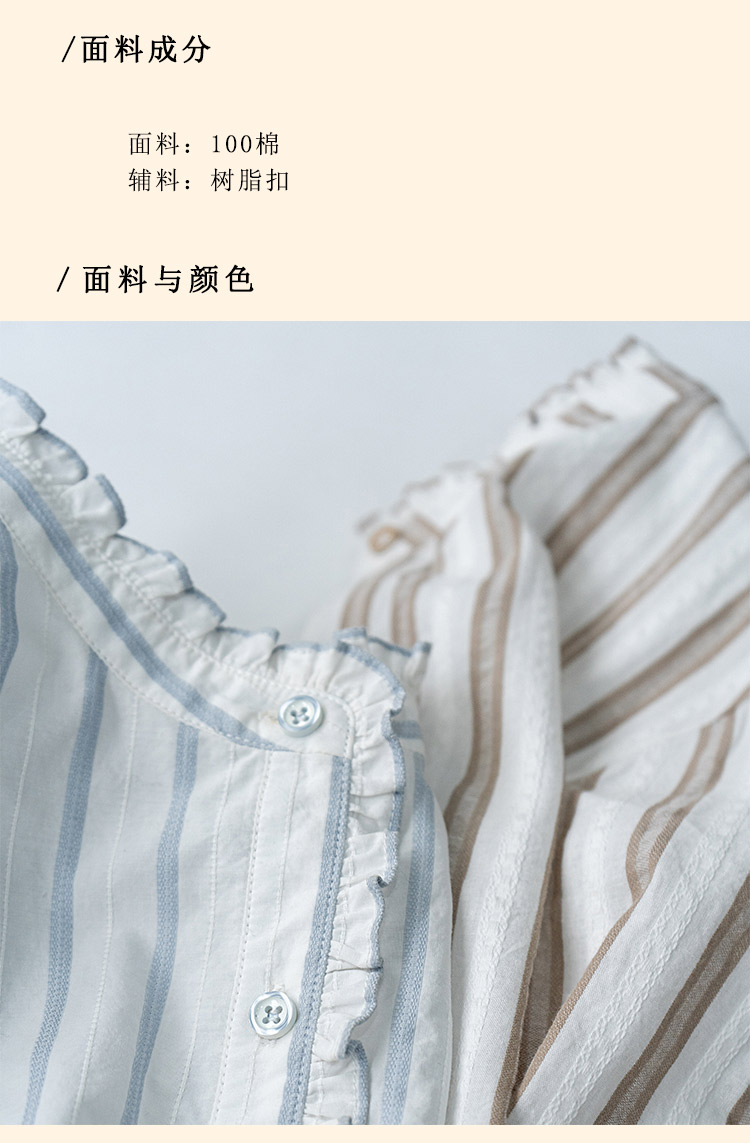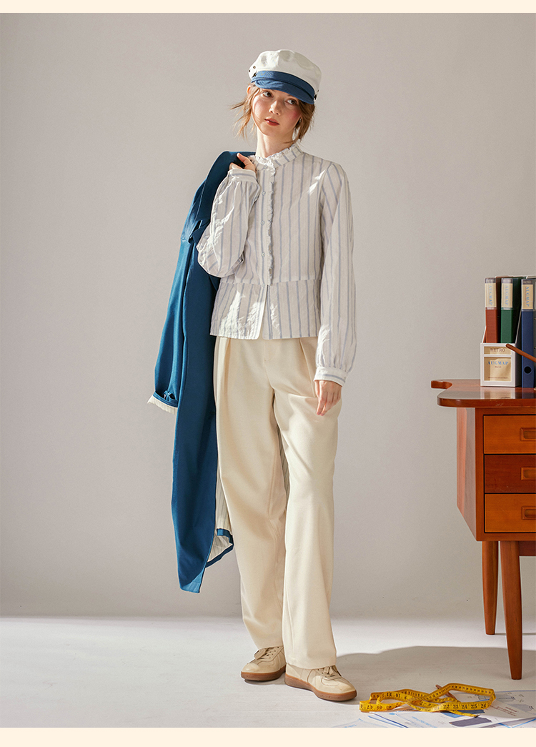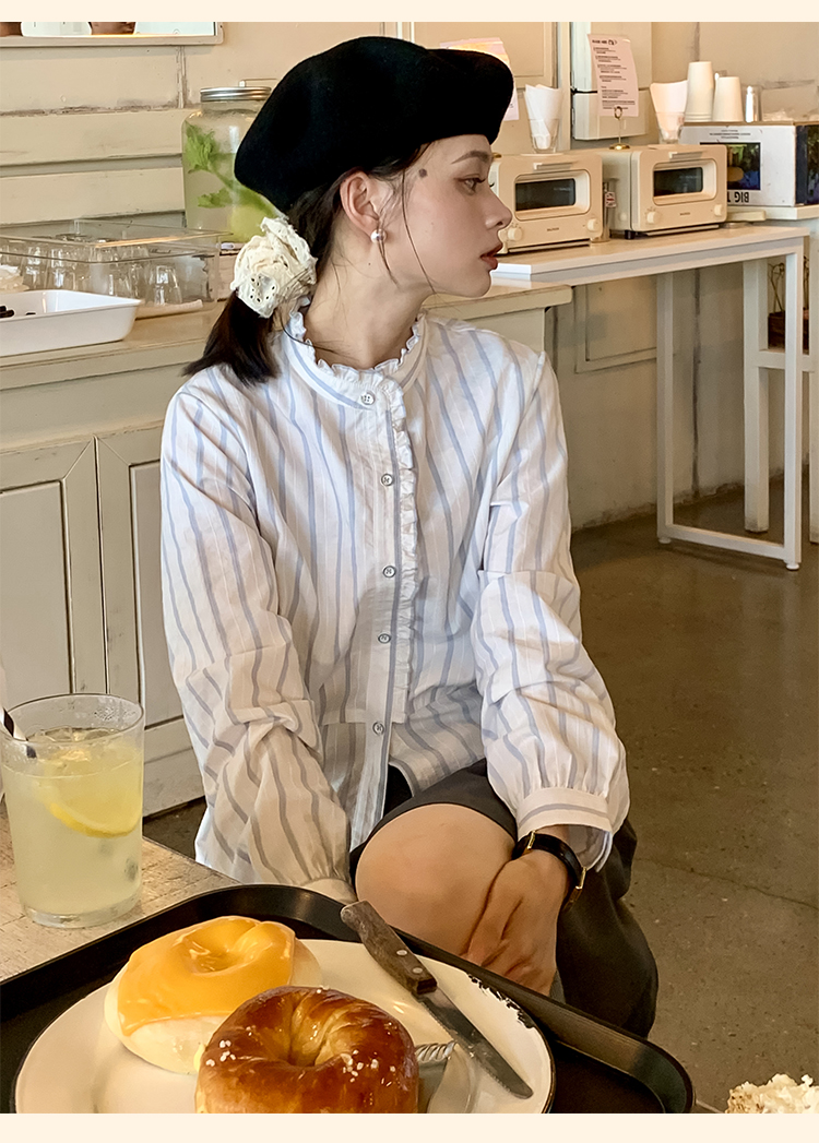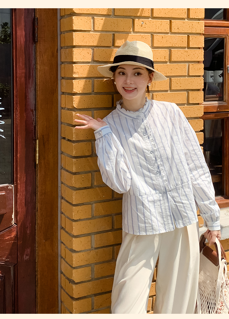 浮生八记/24C116/英式条纹木耳边立领百搭蓝白条纹衬衫