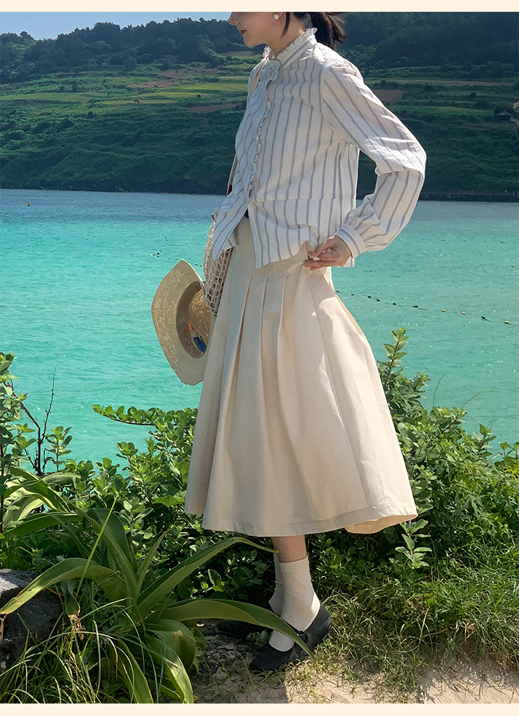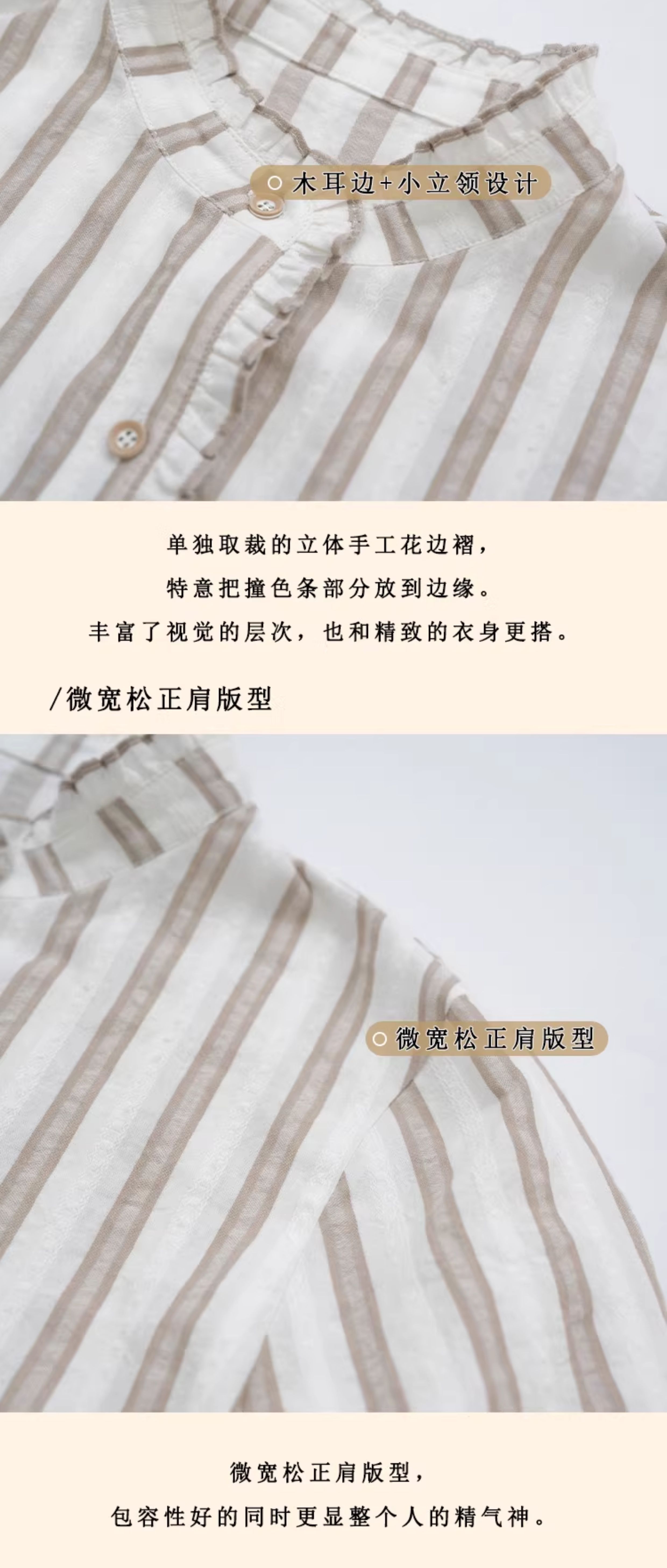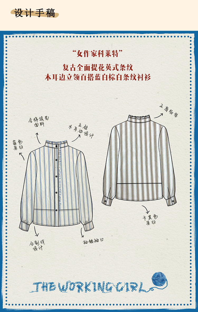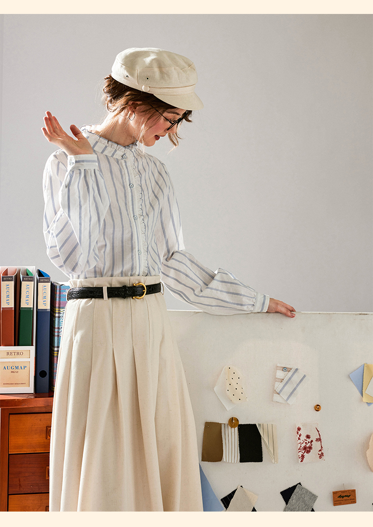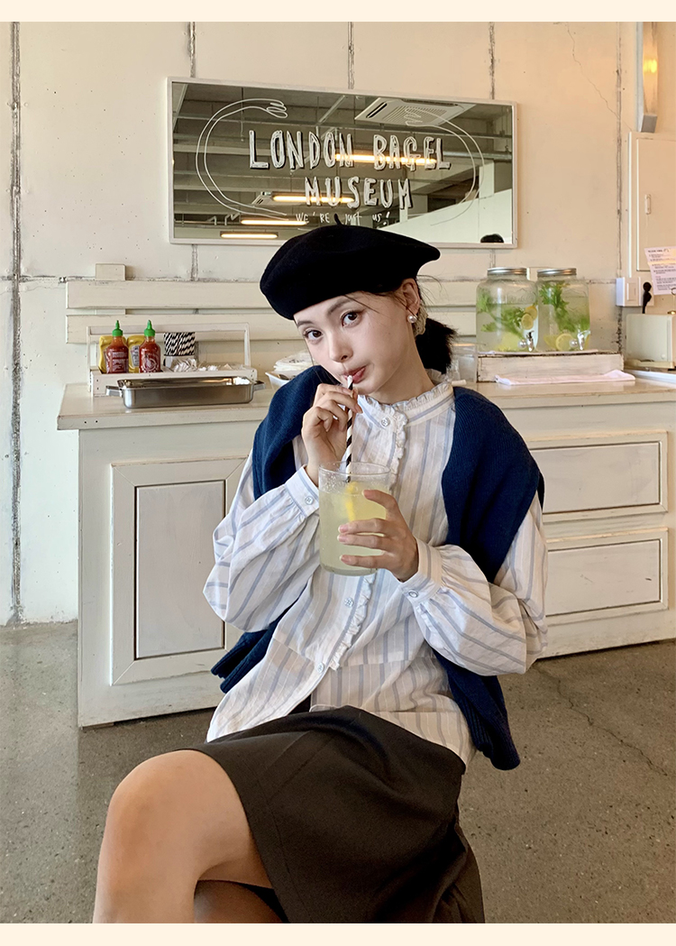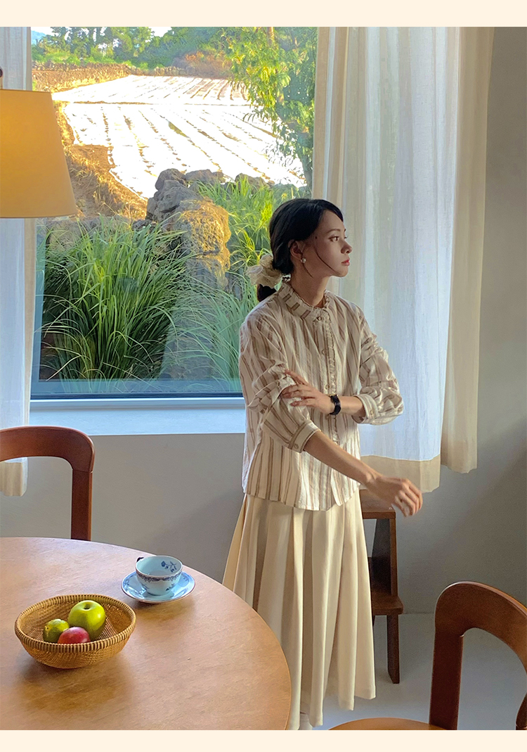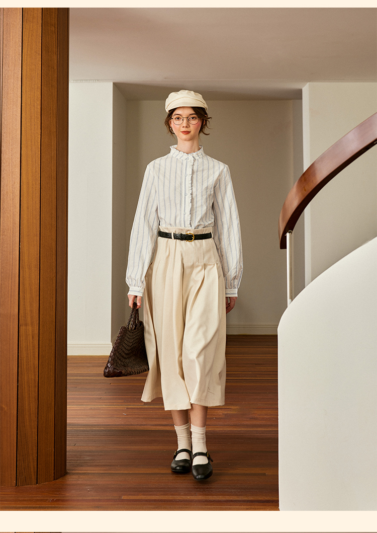 浮生八记/24C116/英式条纹木耳边立领百搭蓝白条纹衬衫