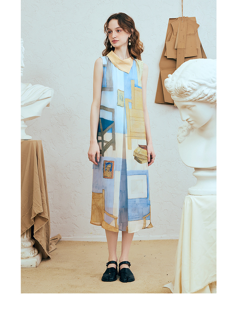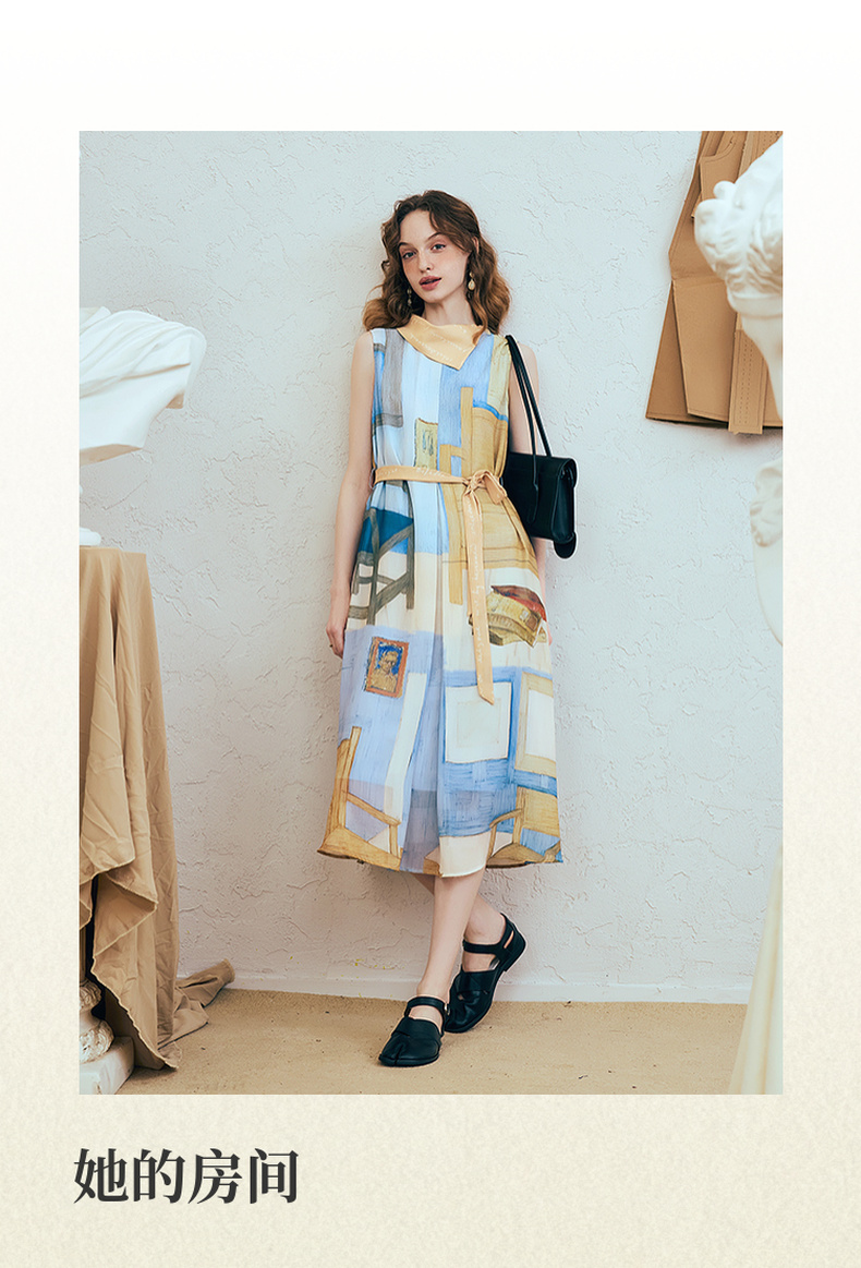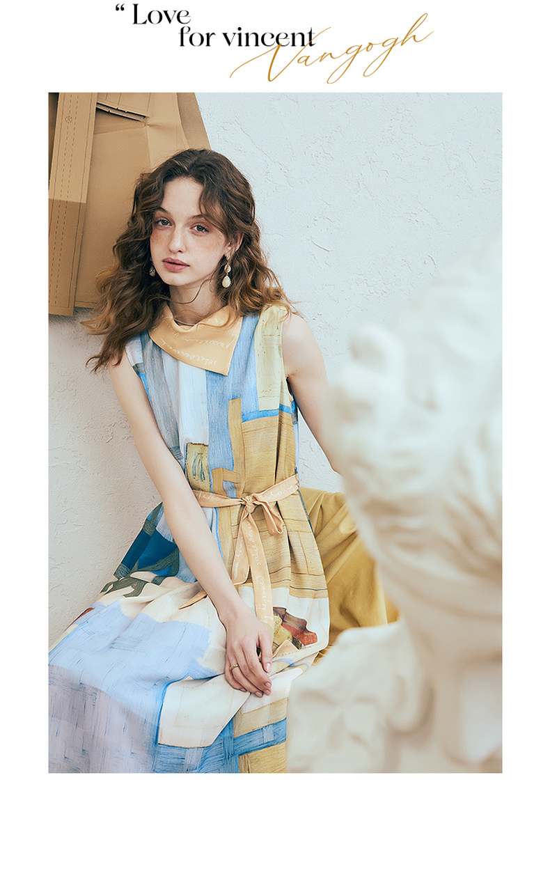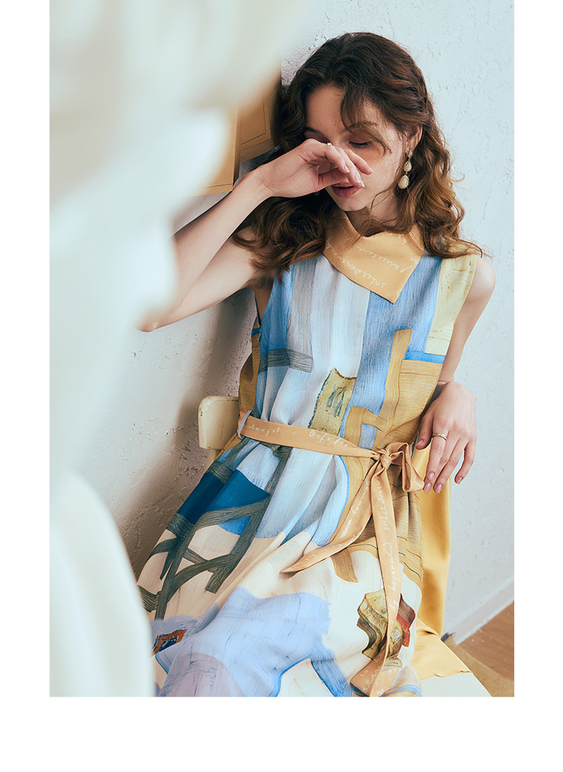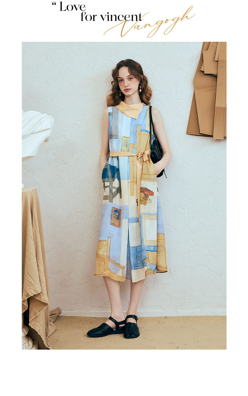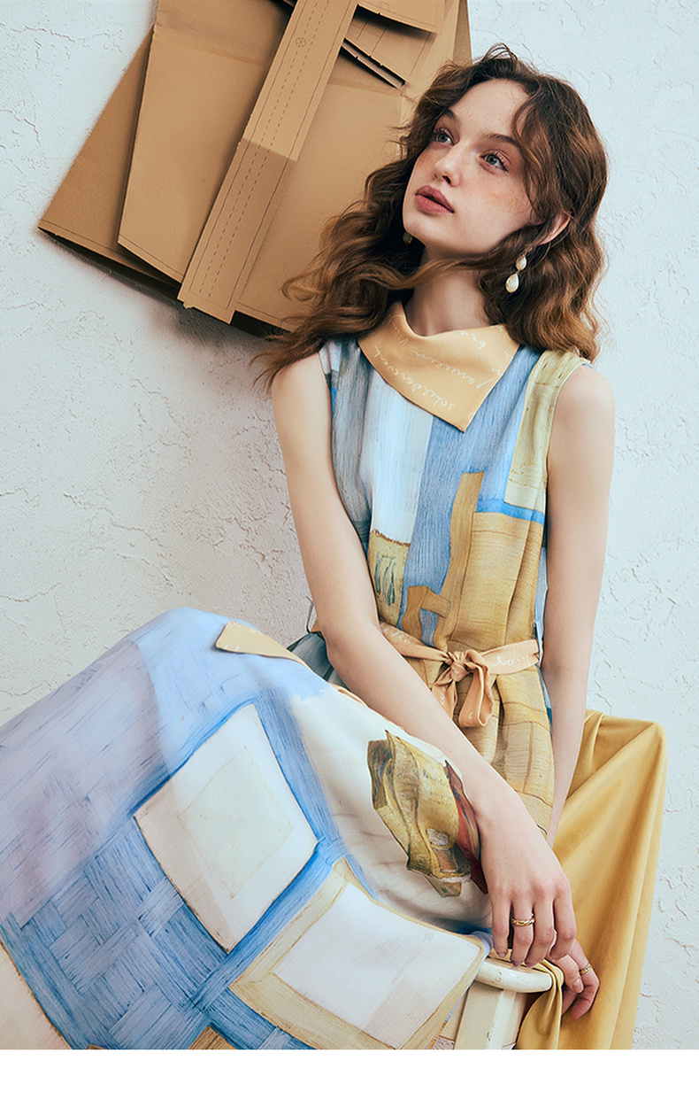 两三事梵高文艺 她的房间 2025夏季新款围巾领印花绑带无袖连衣裙