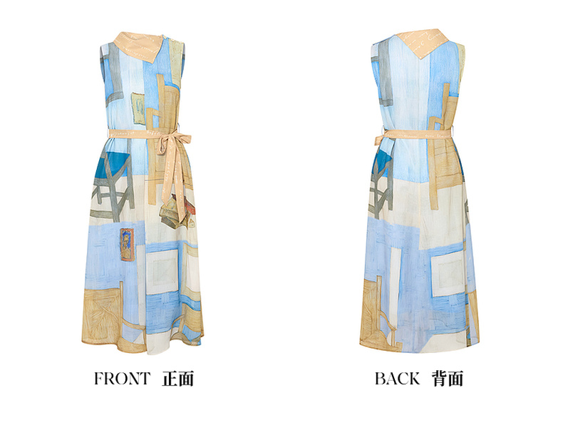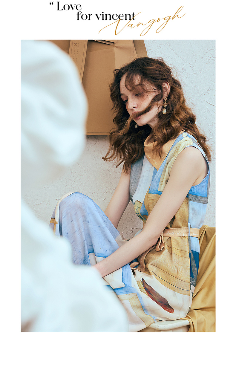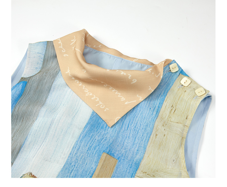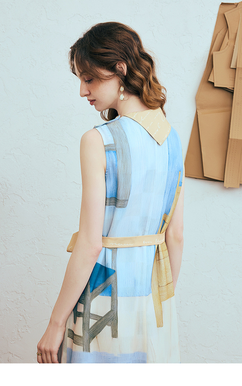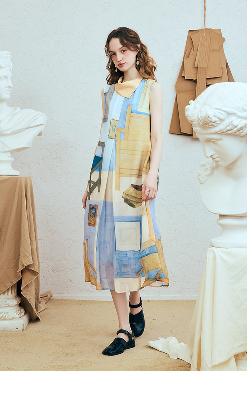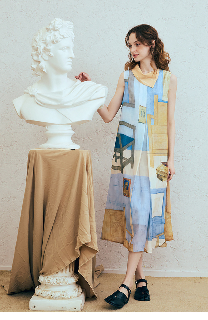 两三事梵高文艺 她的房间 2025夏季新款围巾领印花绑带无袖连衣裙