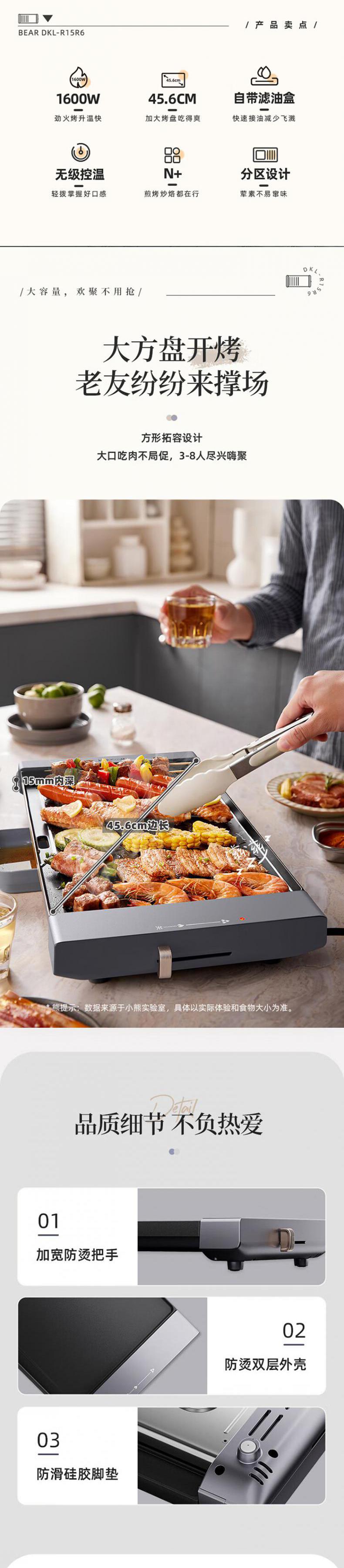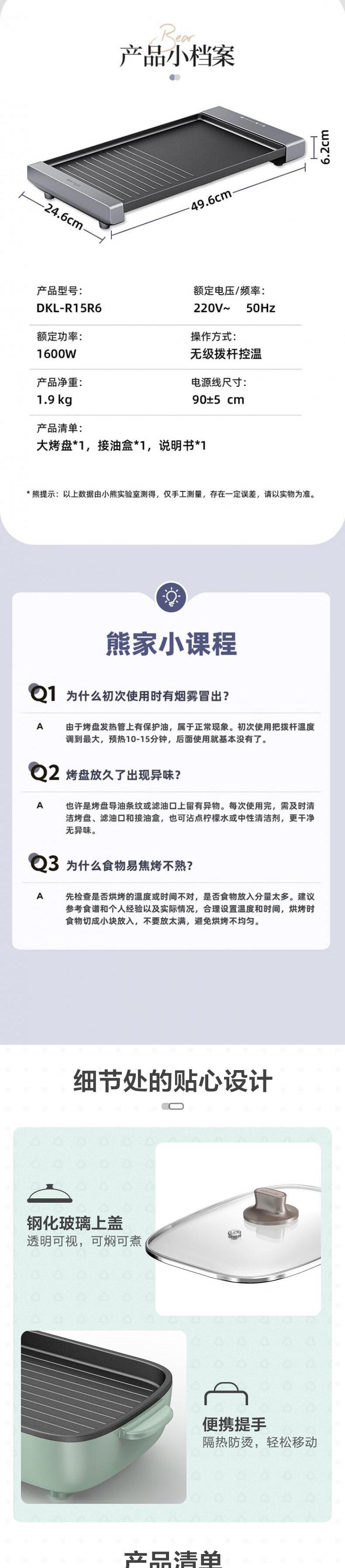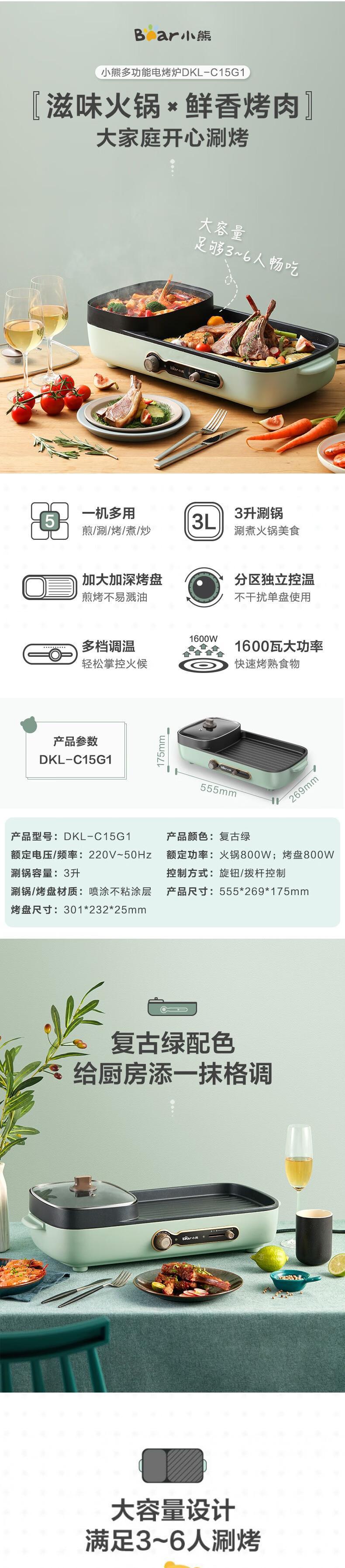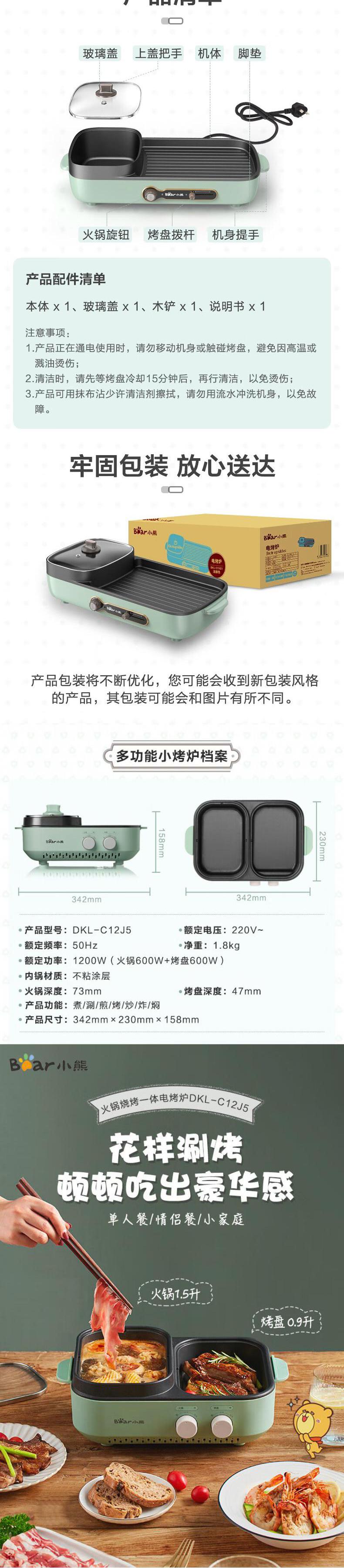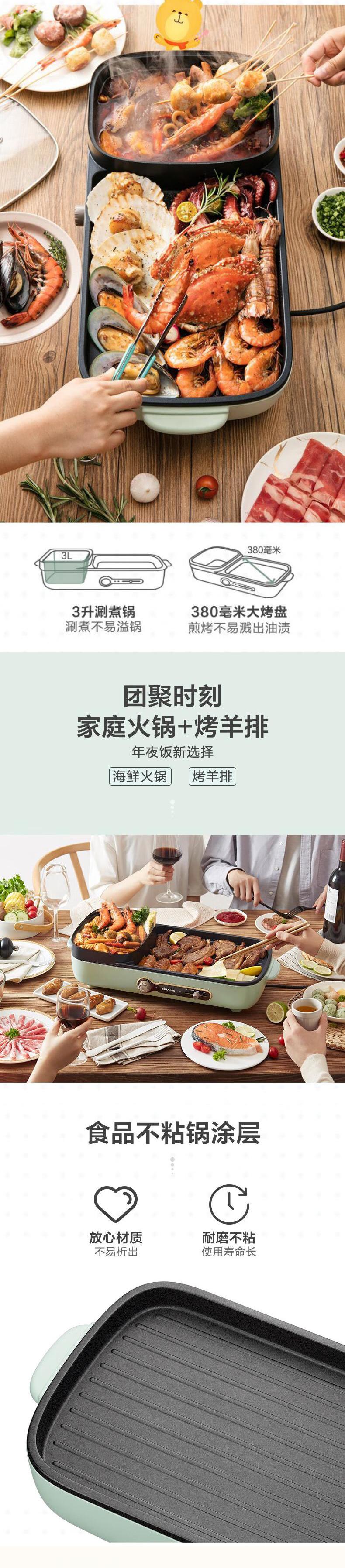 【自营】小熊(Bear) 电烧烤炉多功能料理锅电火锅 家用无烟电烤炉烤肉机烤涮一体锅烧烤机 DKL-C12J5大功率分区控温不粘烤盘煎烤涮一体易洗