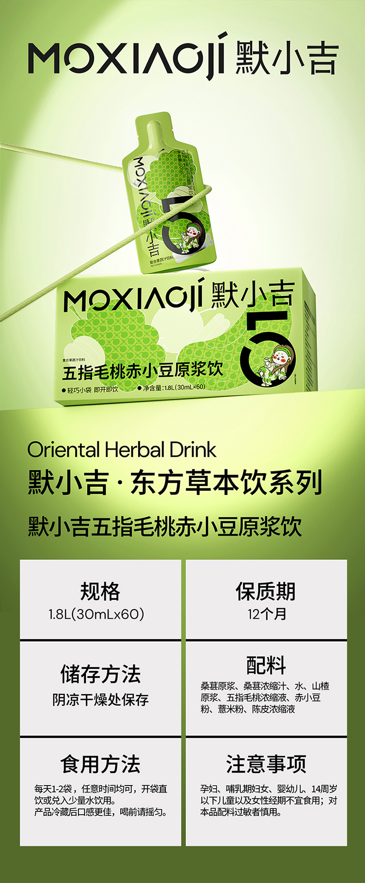 默小吉900ml(30袋)、1.8L(60袋)五指毛桃赤小豆原浆饮;清养饮;五指毛桃,赤小豆 ,薏苡仁、陈皮、山楂、桑葚独立小袋装氵湿;五指毛桃赤小豆原浆饮桂圆西洋参饮玉灵饮组合