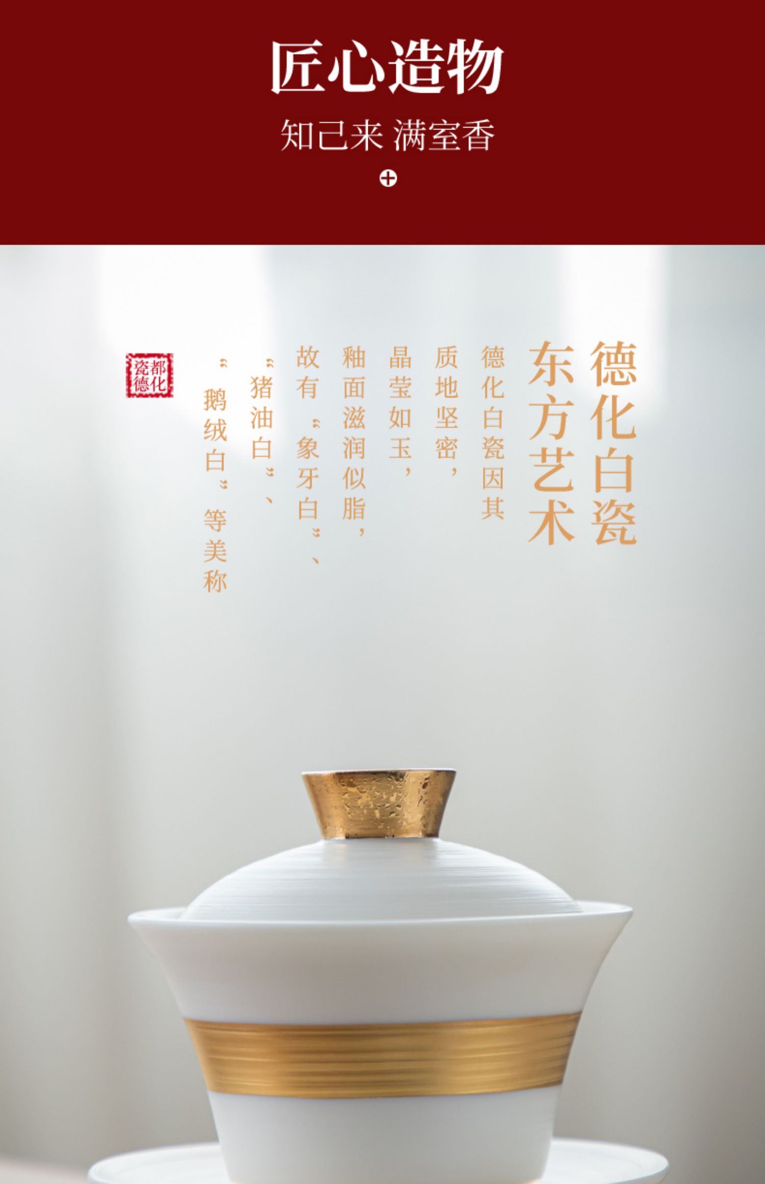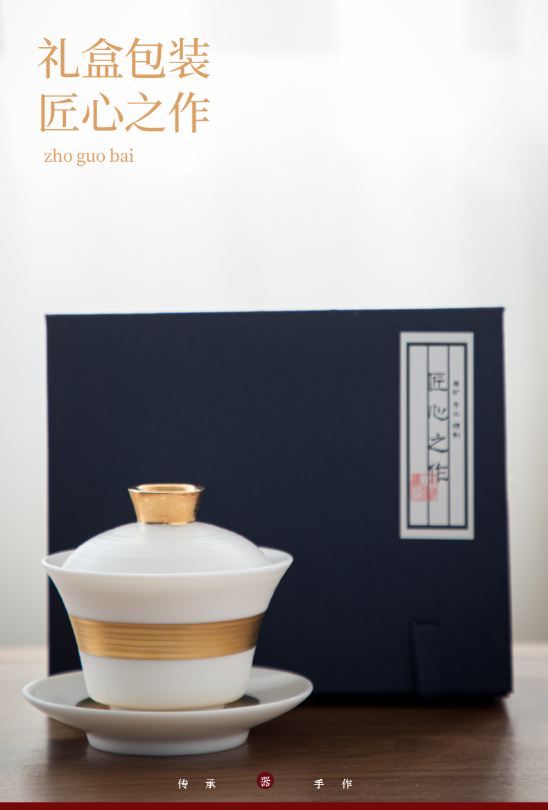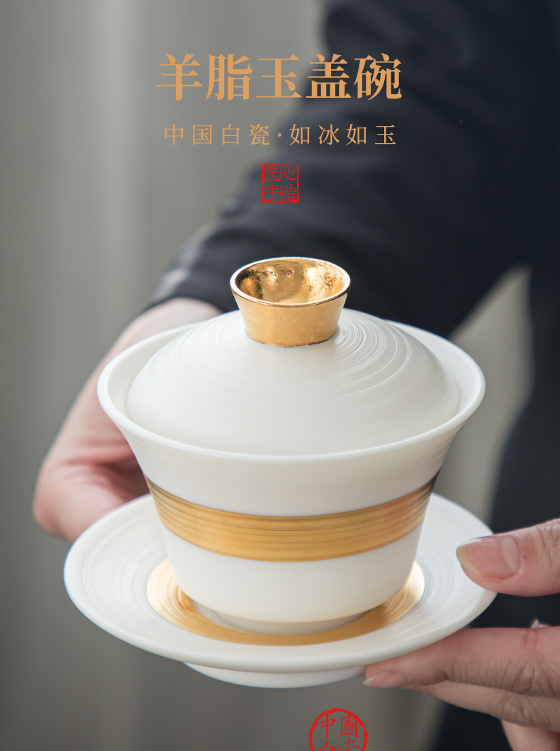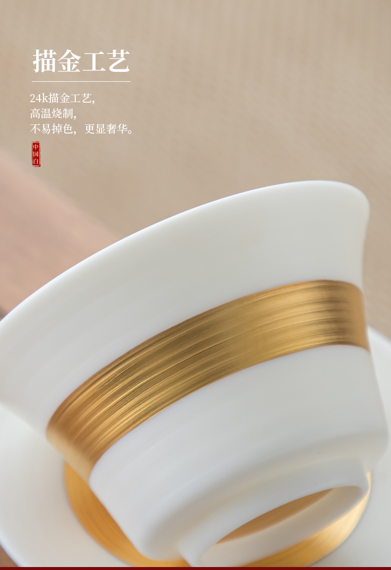 千里江山 6头+木托盘 茶具套装 手绘羊脂玉新款整套功夫茶具家用德化白瓷客厅泡茶办公室会客盖碗茶杯 茶道 茶具