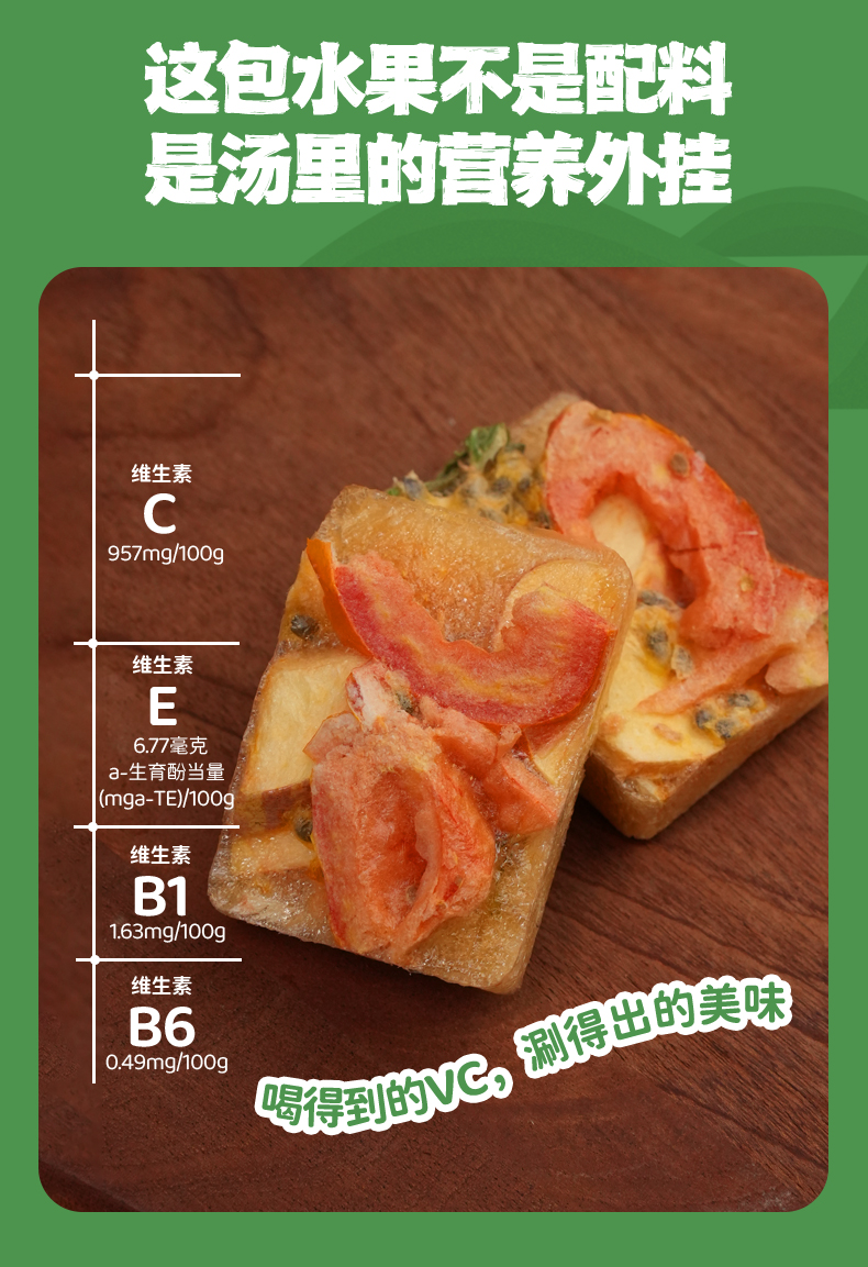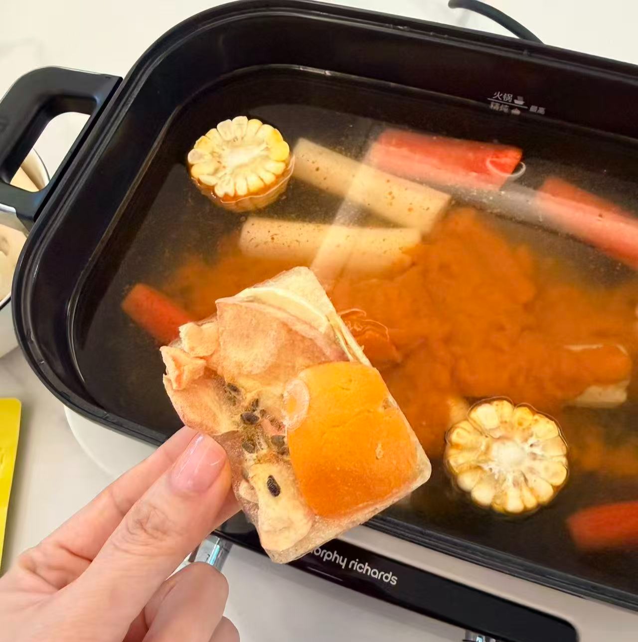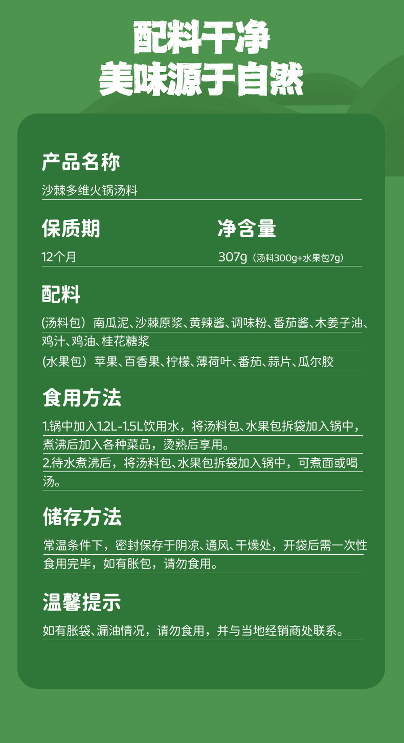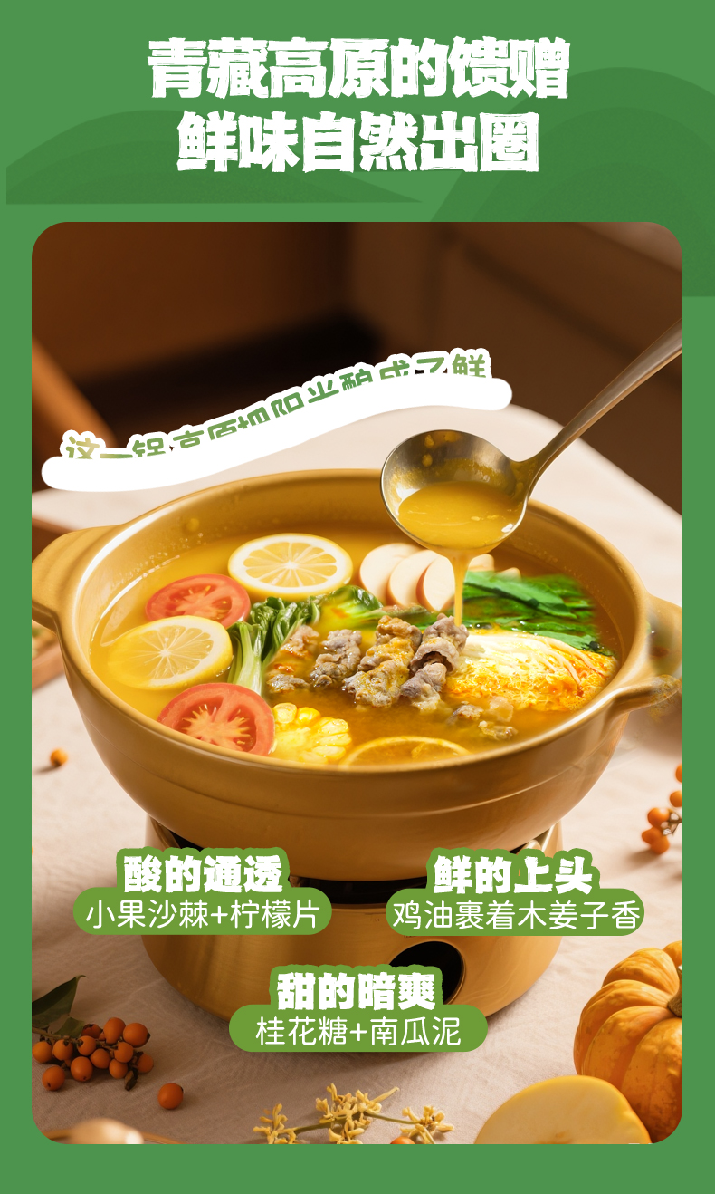 ✅ 富含沙棘原浆与多种果蔬成分,提供维生素、矿物质及植物营养素,助力日常营养补充✅ 添加南瓜泥、番茄酱等天然蔬果原料,口感丰富,提升汤底鲜甜层次✅ 内含百香果、柠檬等水果包成分,增添清新果香,平衡汤料风味✅ 融合木姜子油、薄荷叶等天然香料,带来独特香气,提升食欲✅ 汤料可直接用于煮食火锅或煮面,操作简便,适合家庭与聚餐使用✅ 不添加人工香精与防腐剂(基于“配料干净”说明),倾向于自然调味懒人模式3小时不腻,涮出透光金汤。