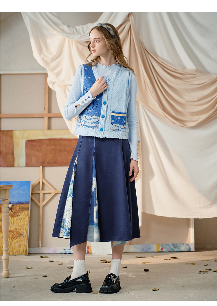 【暖冬内购】两三事梵高文艺莱茵河畔2025秋冬款印花拼接拼色海军领毛呢外套女