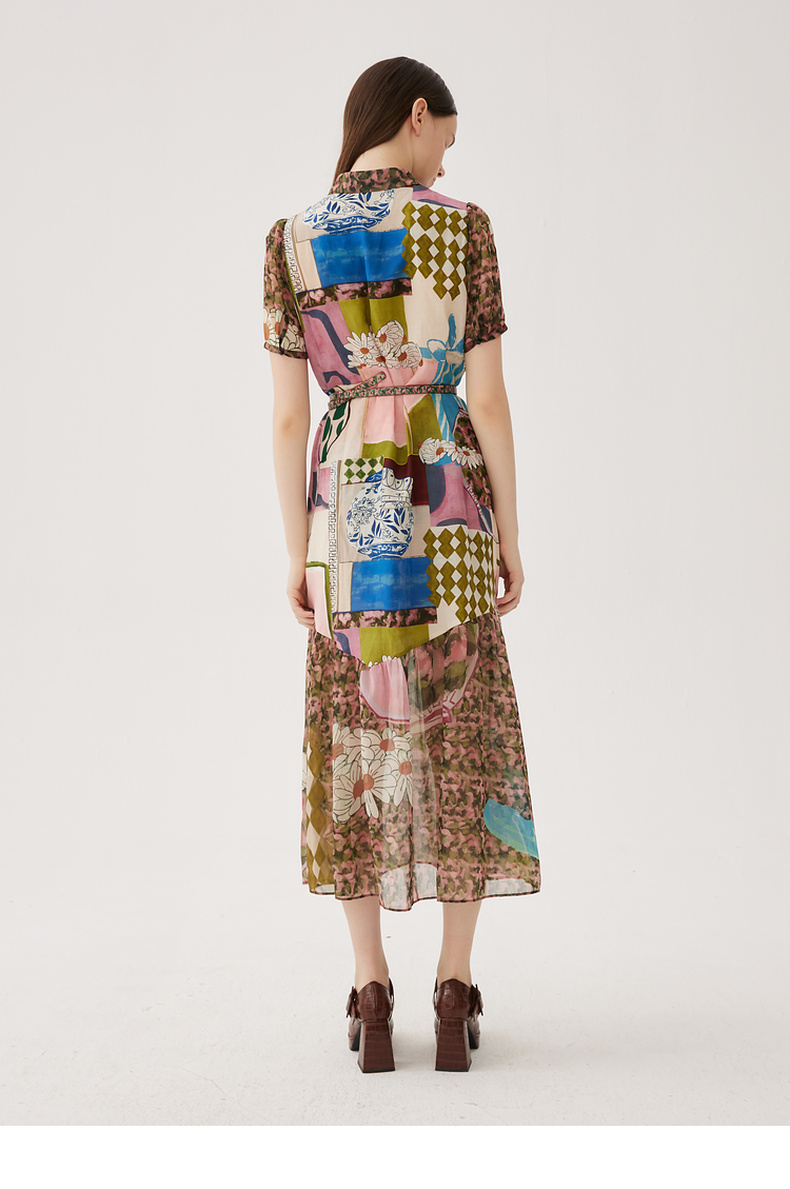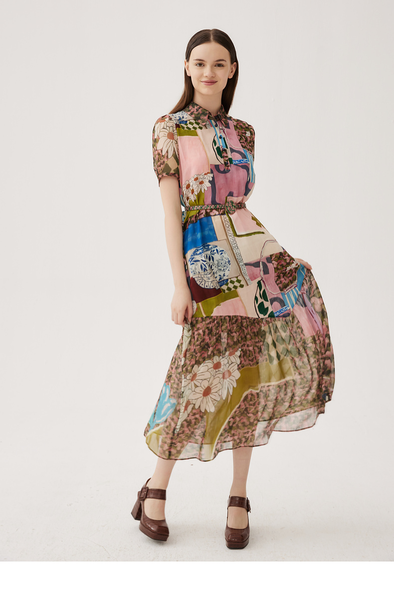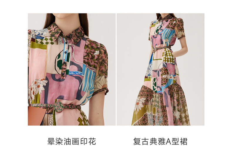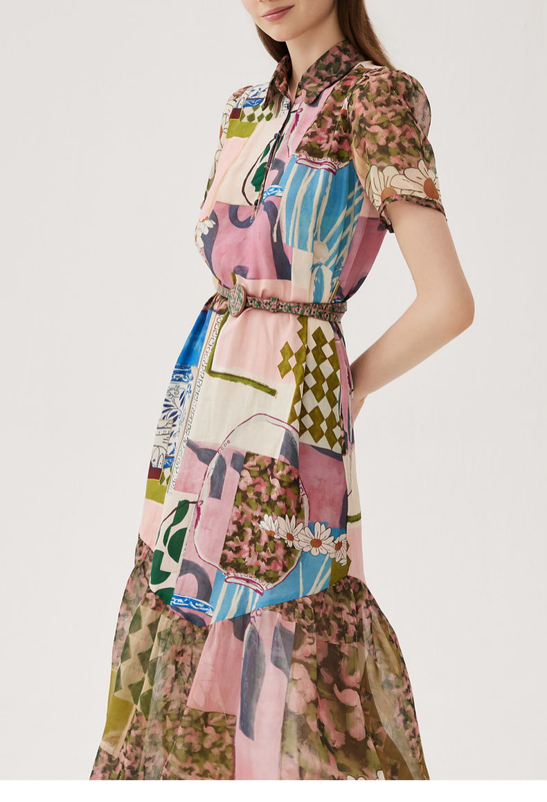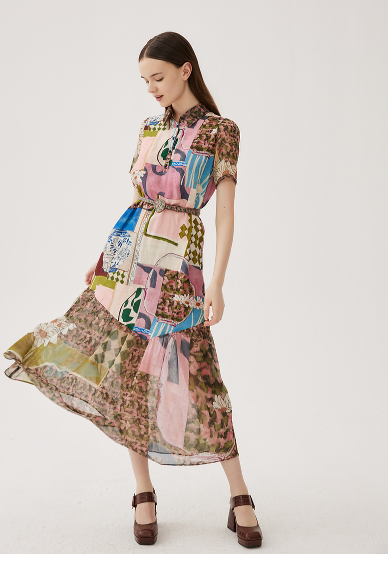 谜底印花连衣裙短袖女2024夏季款复古田园风长裙配腰带247ML5010